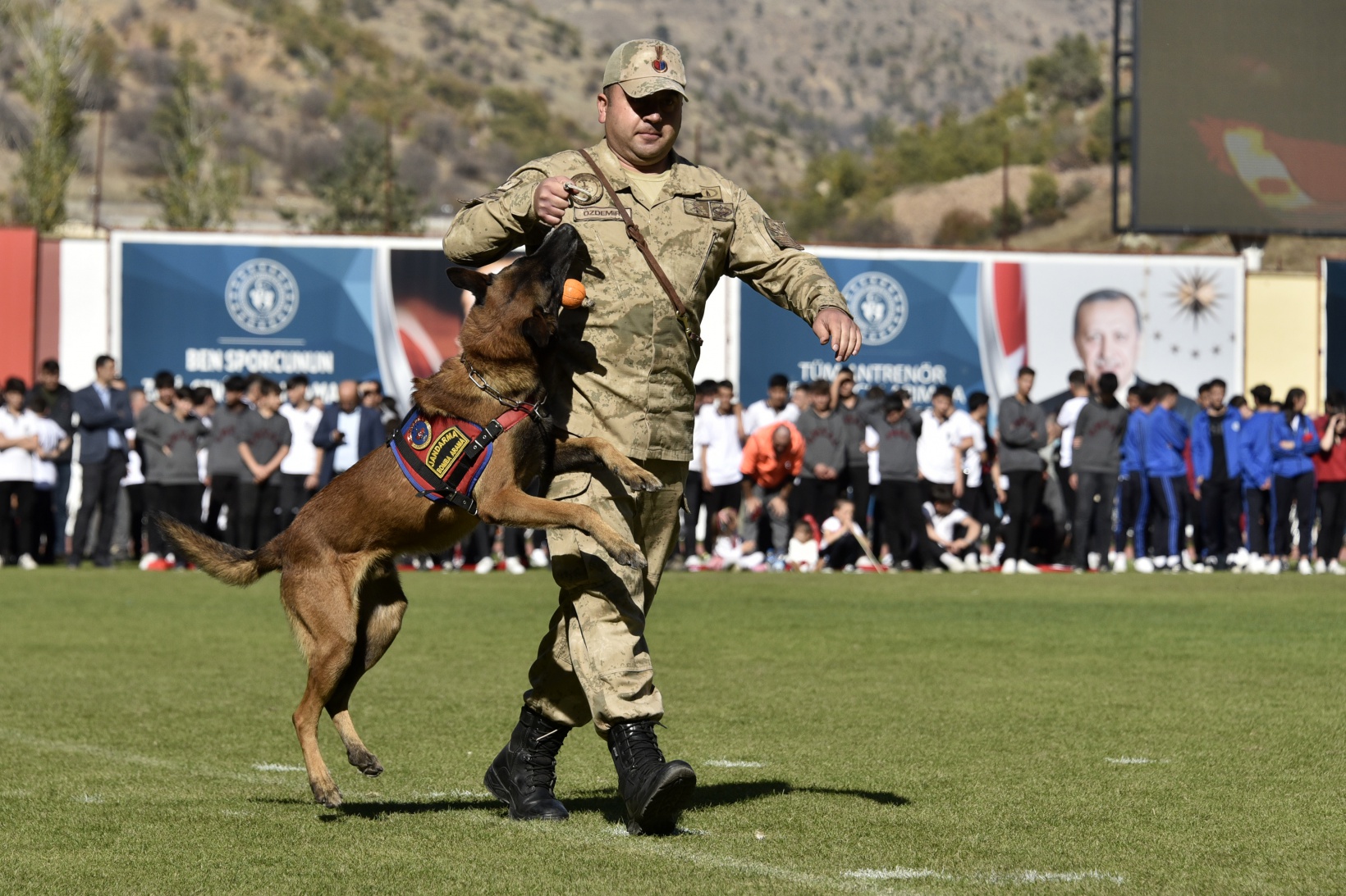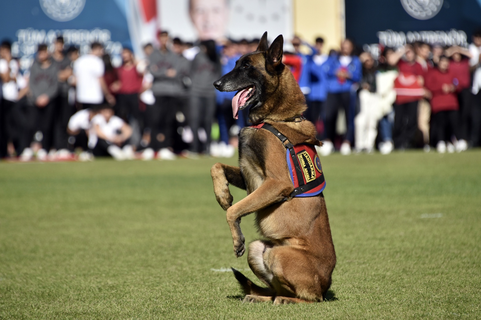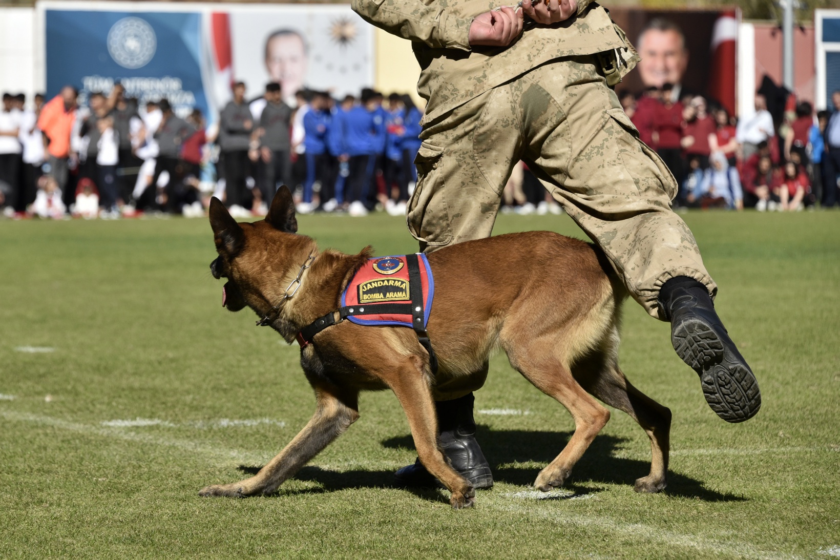 Okulların gösterilerinin ardından Jandarma Uzman Çavuş Erhan Özdemir, bomba arama köpeği ‘Maske’ ile birlikte bomba arama ve itaat gösterisi gerçekleştirirken, bu gösteri vatandaşlardan büyük ilgi gördü.