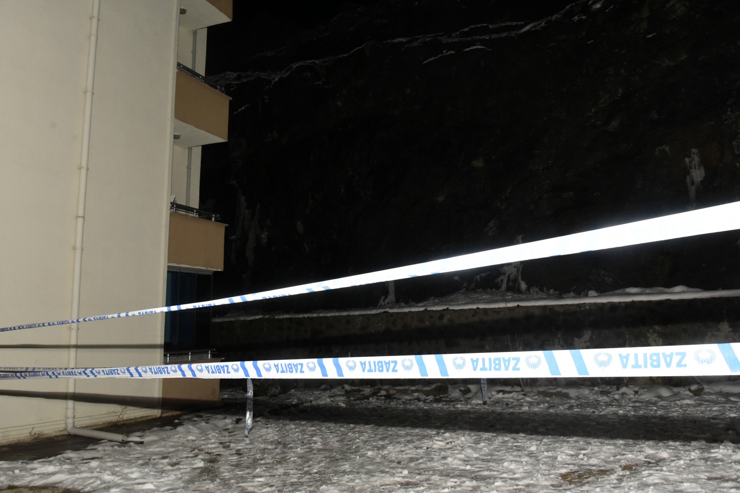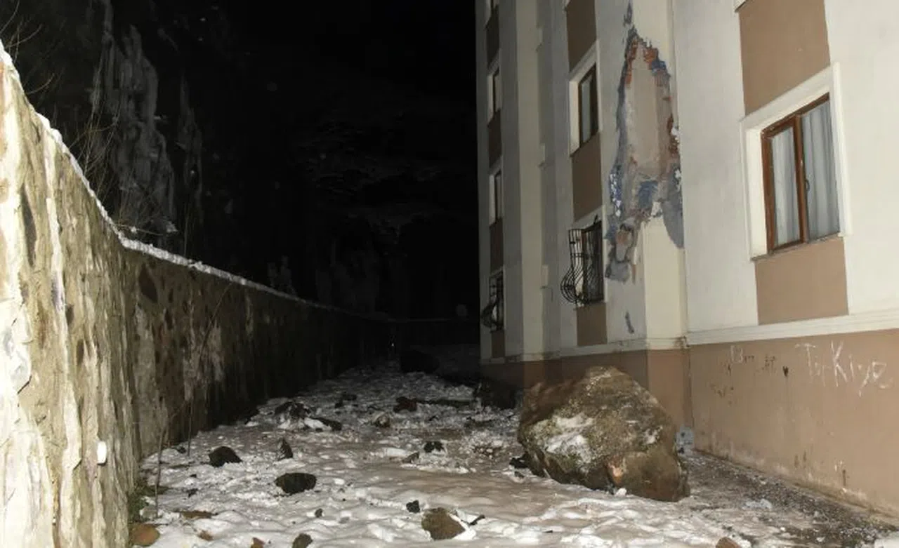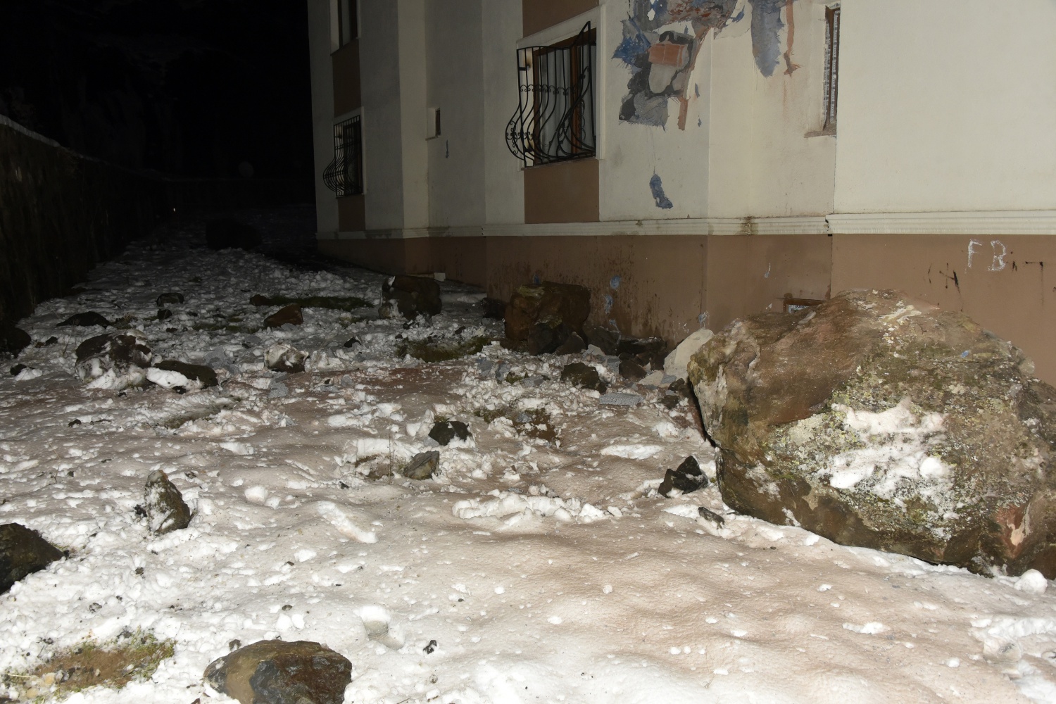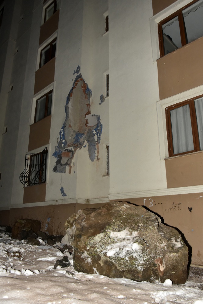 Güvenlik şeritleriyle kapatılan alana vatandaşlar yaklaştırılmazken çok sayıda vatandaş korkulu gözlerle apartmanlarına düşen kayaları inceledi.