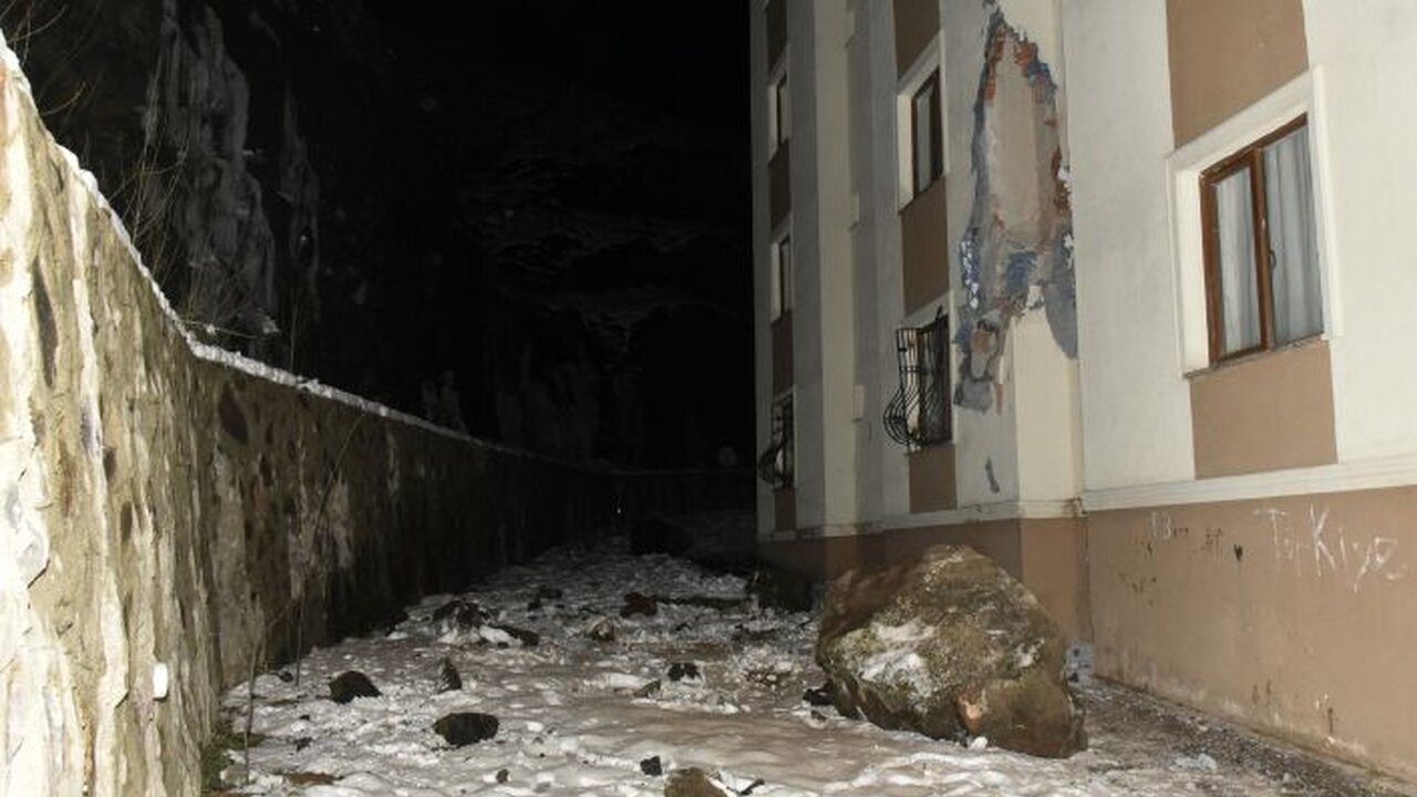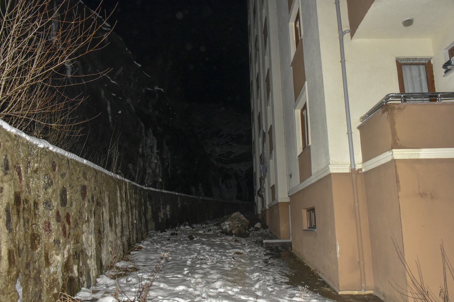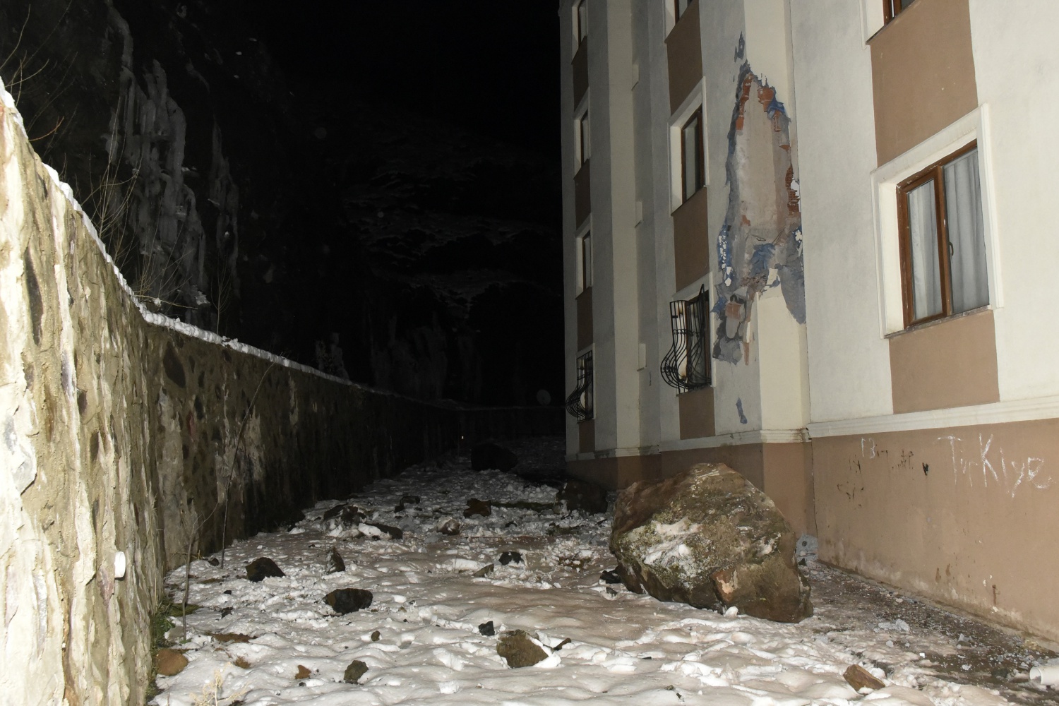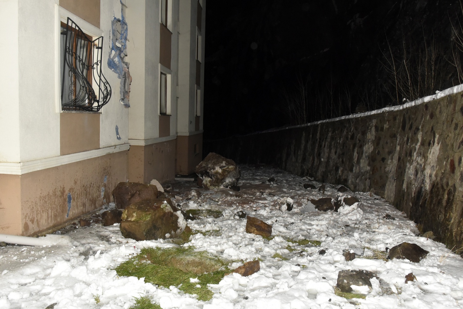 Gümüşhane kent merkezindeki Oltanbey Mahallesinde bugün akşam saatlerinde dev kaya kütleleri dağdan koparak 10 katlı apartmanın üzerine düştü. Olayda kayalar yangın merdiveni boşluğunu yıktı.