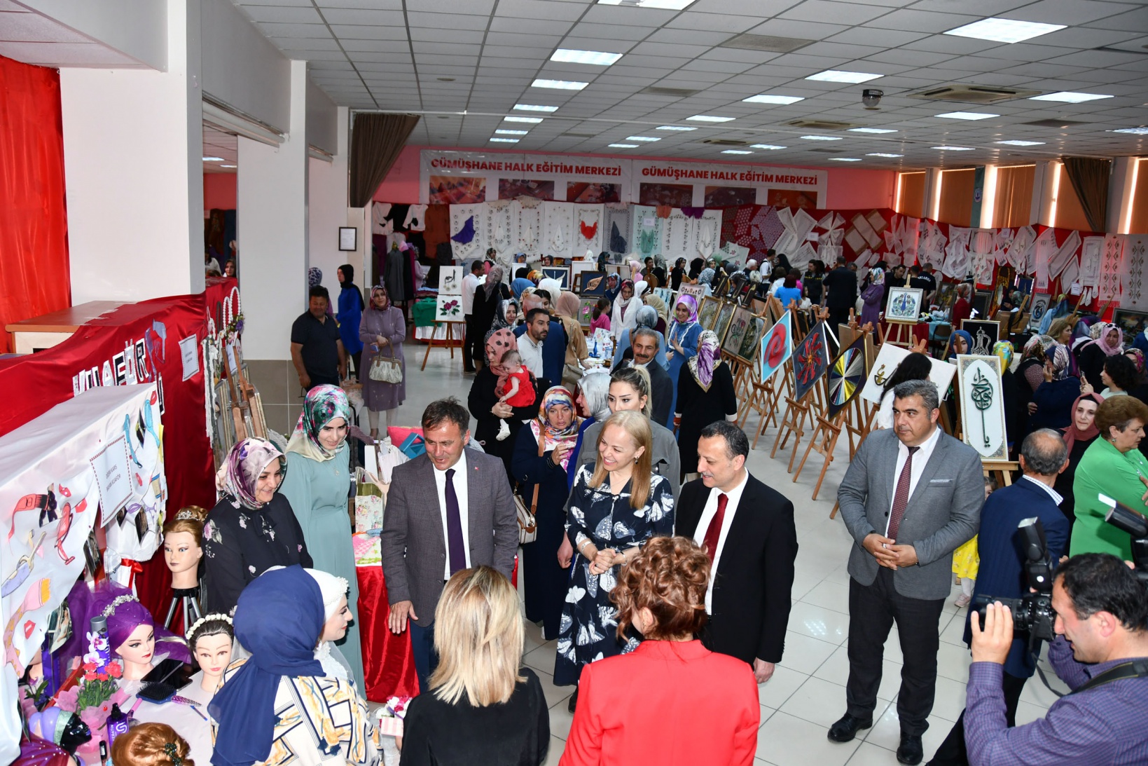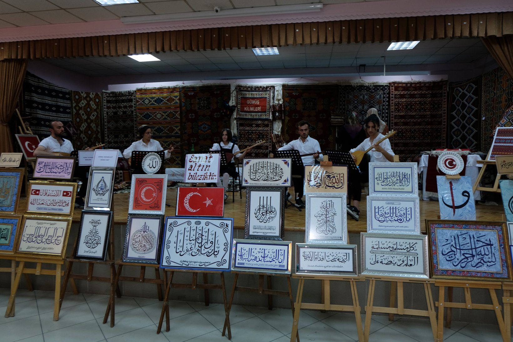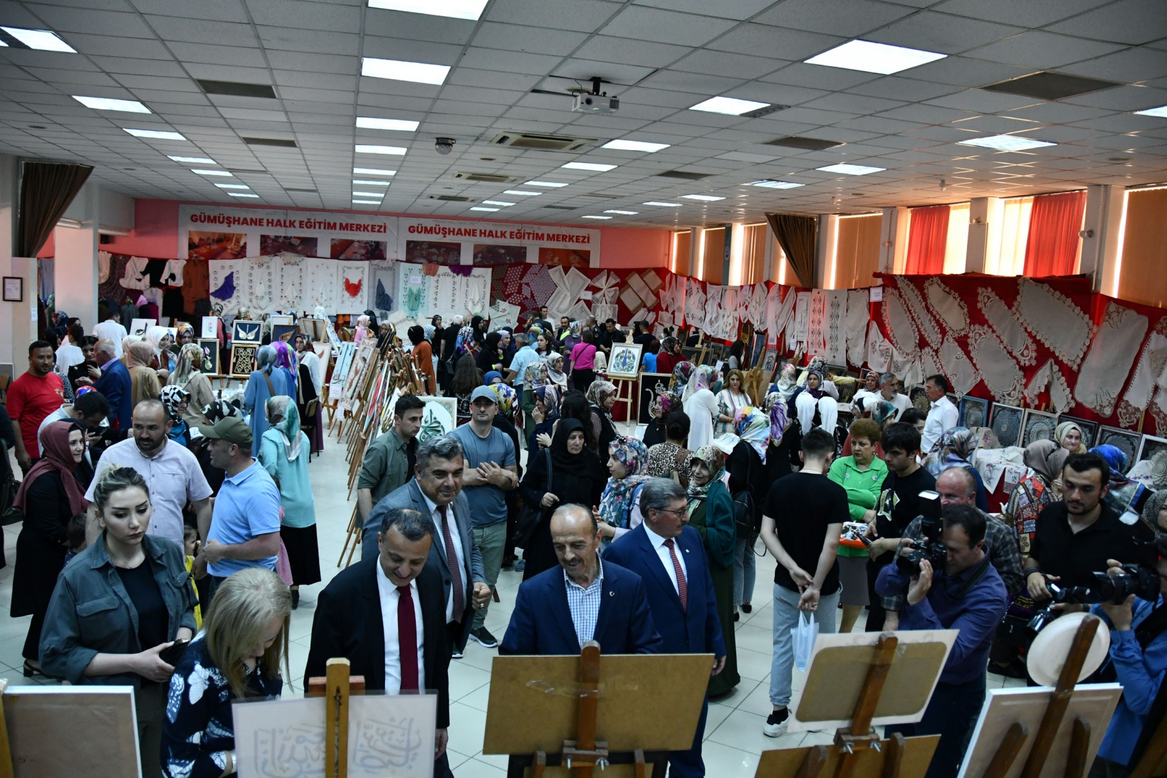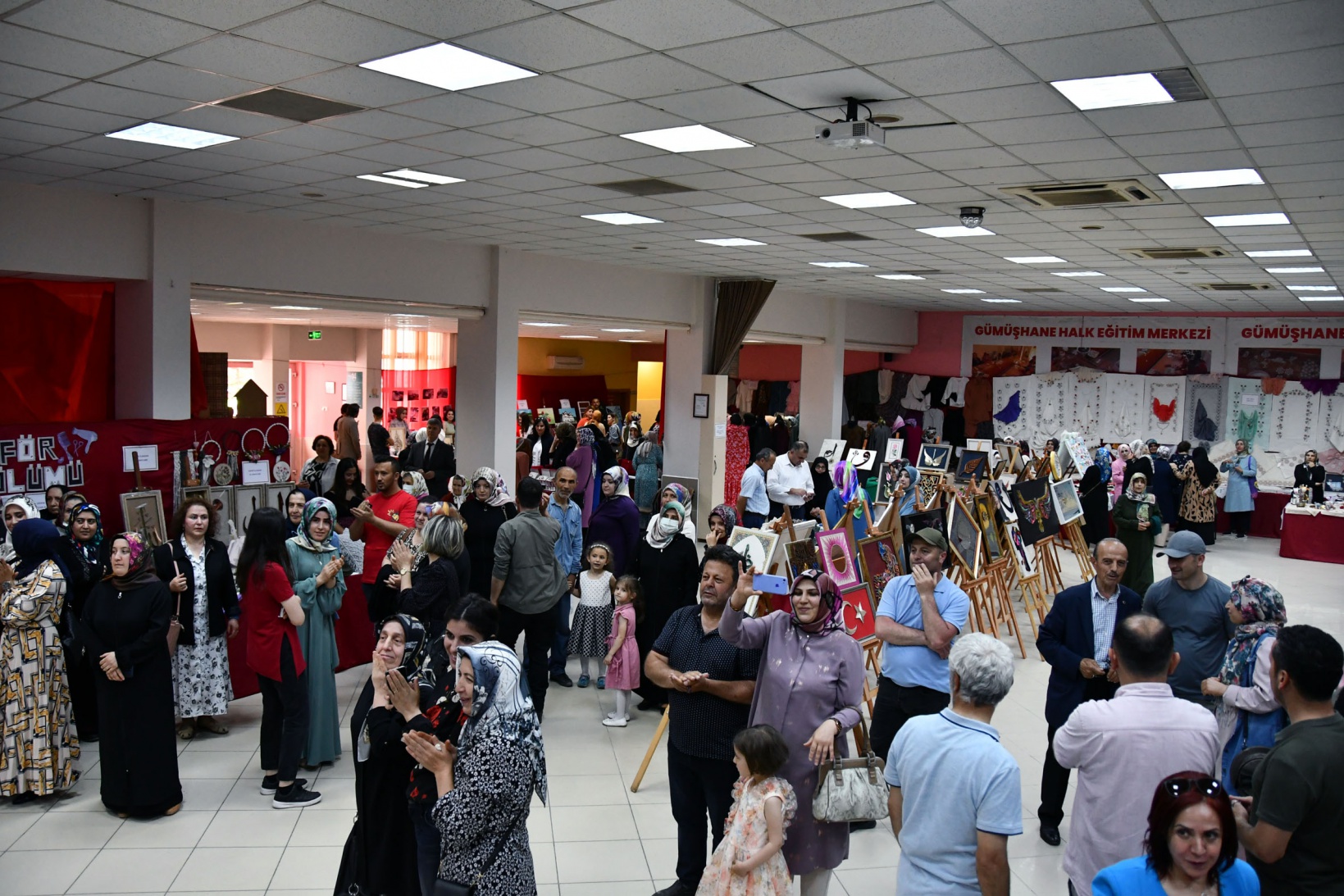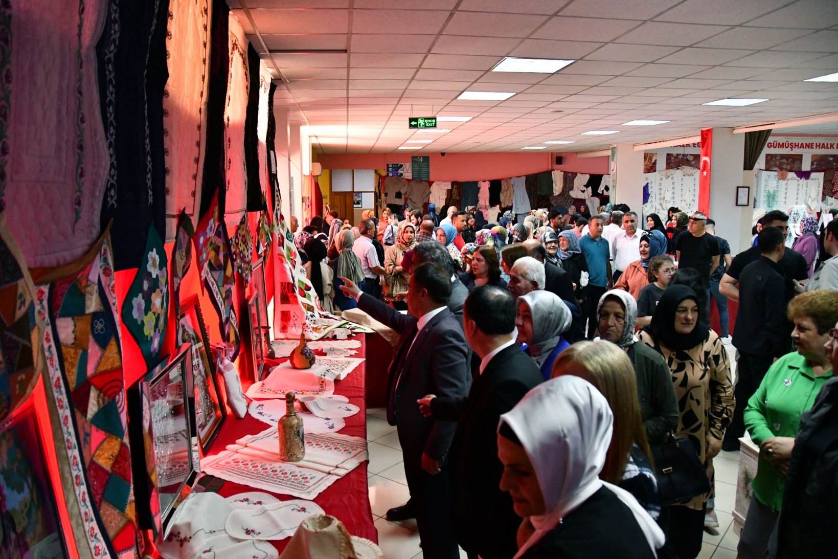 Halk oyunları gösterilerinin ardından makine nakışı, el sanatları, gümüş kilim, giyim, iğne oyası, geleneksel el nakışları, filografi, dekoratif süsleme, hüsn-i hat, gümüş takı işlemeciliği kurslarının ürünlerinden oluşan yılsonu sergisinin açılışı gerçekleştirildi.