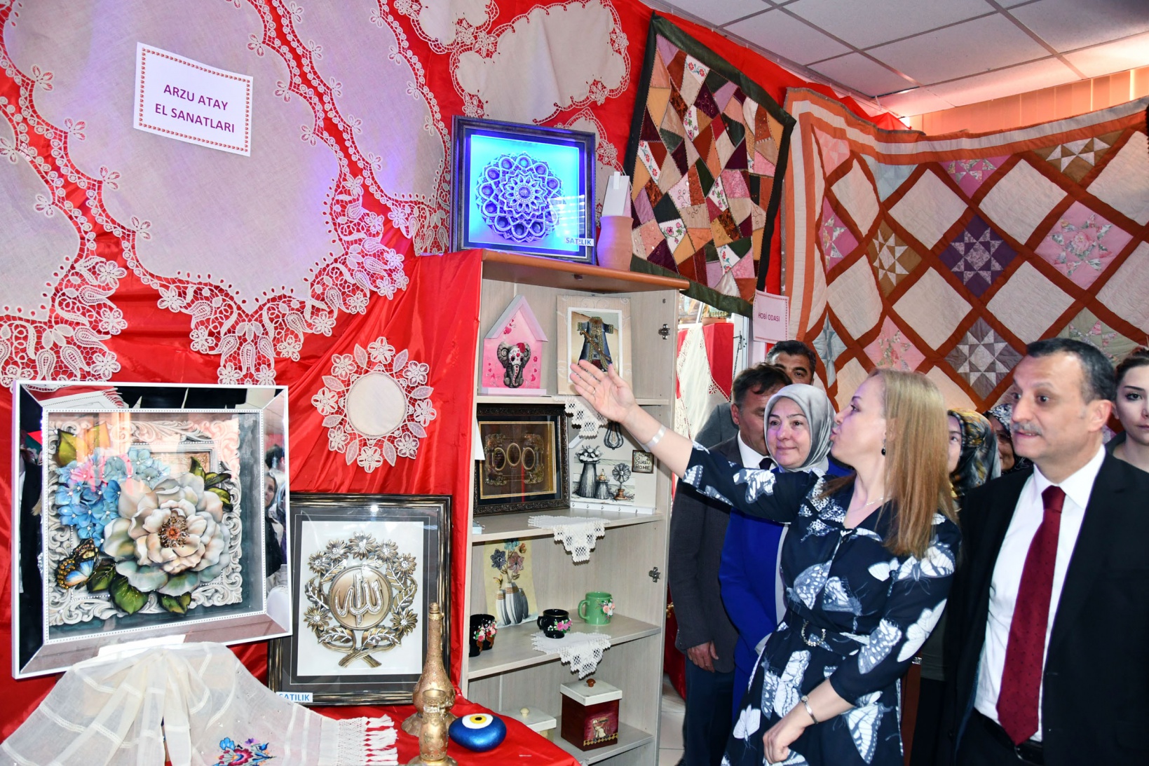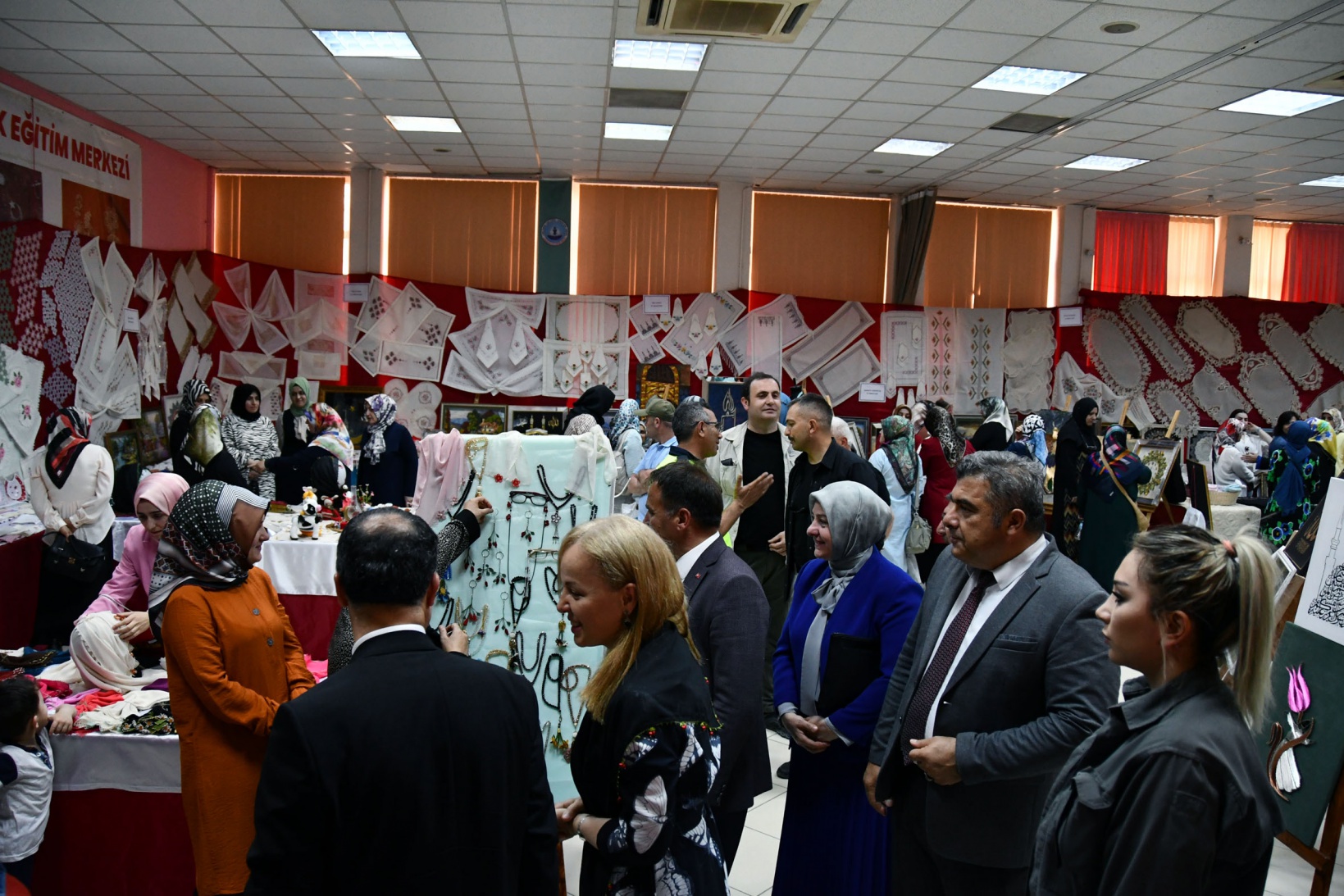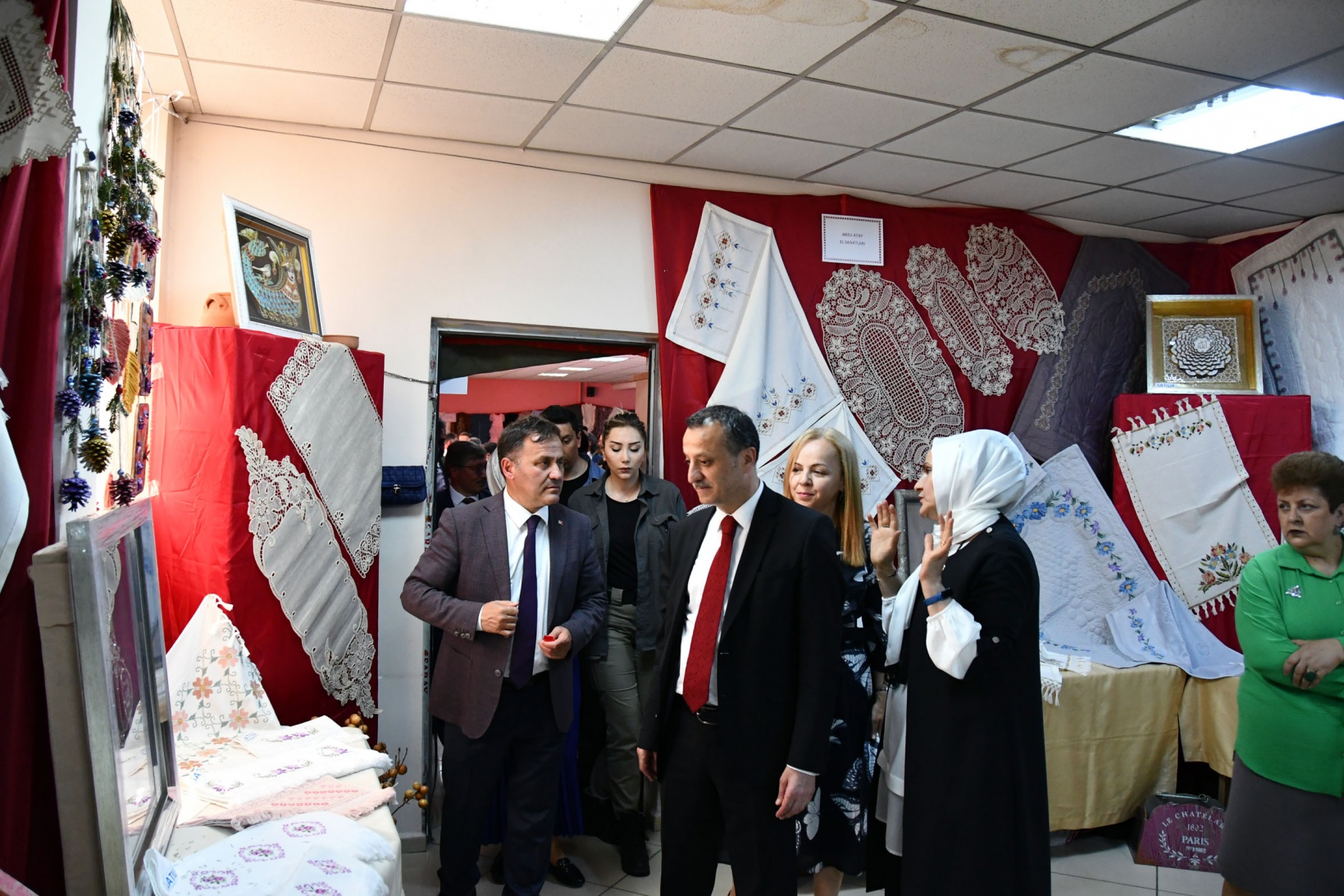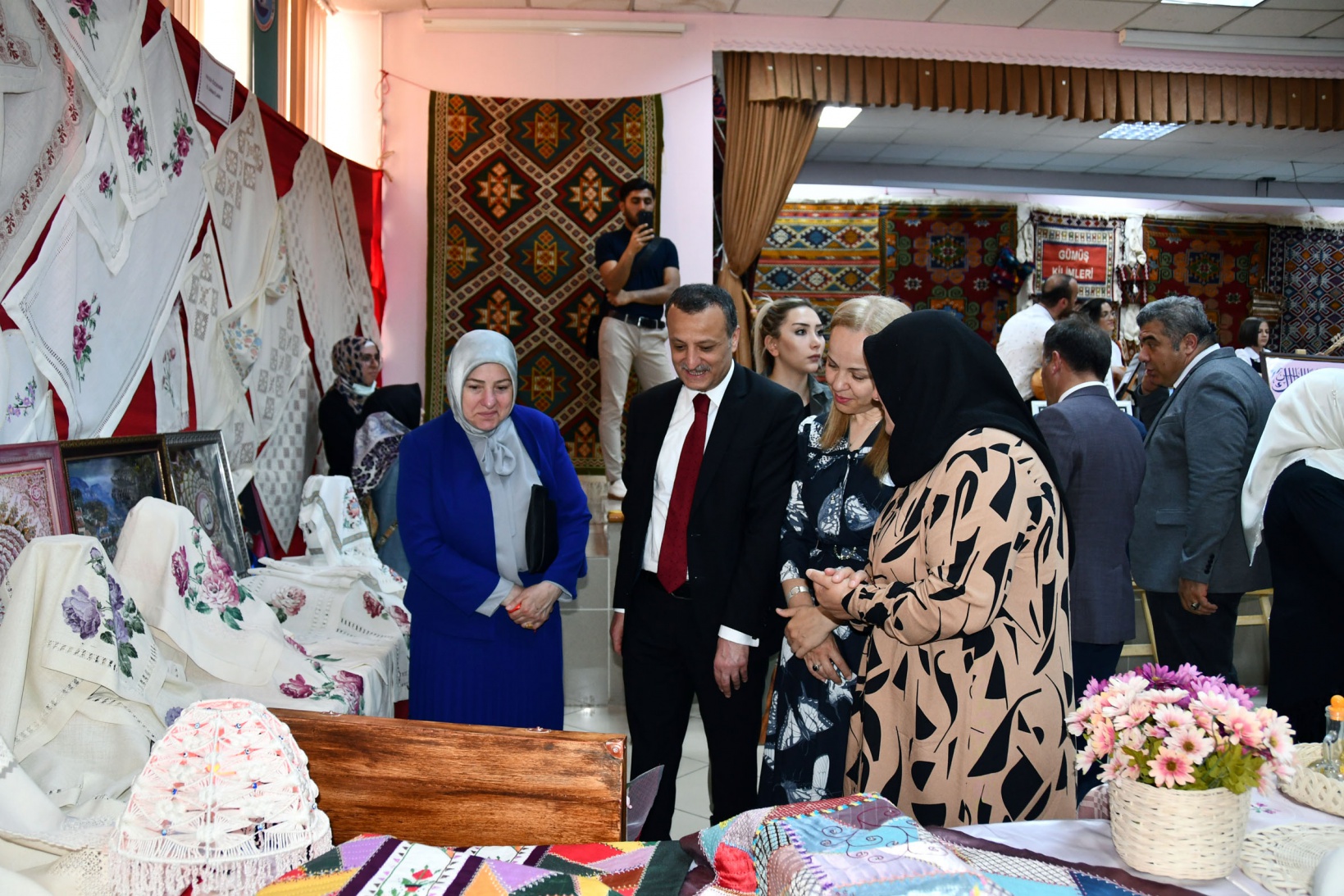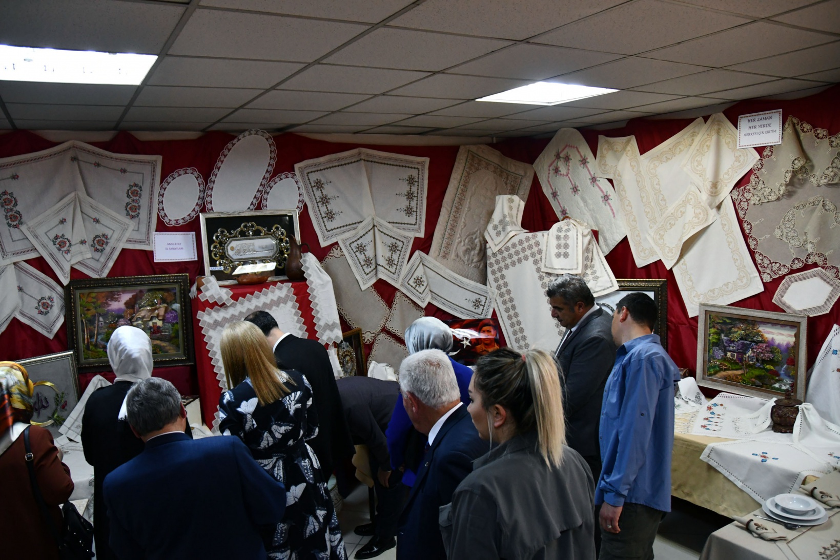 Vali Kamuran Taşbilek, eşi Sibel Taşbilek, Belediye Başkanı Ercan Çimen, İl Emniyet Müdürü Celal Taşci, İl Jandarma Komutanı Albay İsmail Gökcek, İl Milli Eğitim Müdürü Miraç Sünnetci ve davetliler açılışın ardından sergiyi gezerek tüm stantlarda hem kursiyerler hem de usta öğreticilerden bilgi aldı.