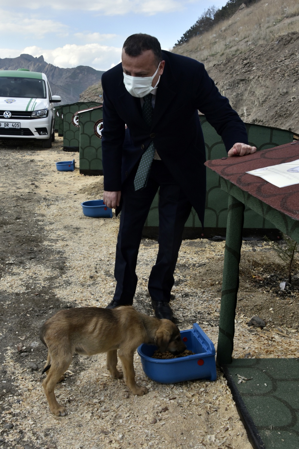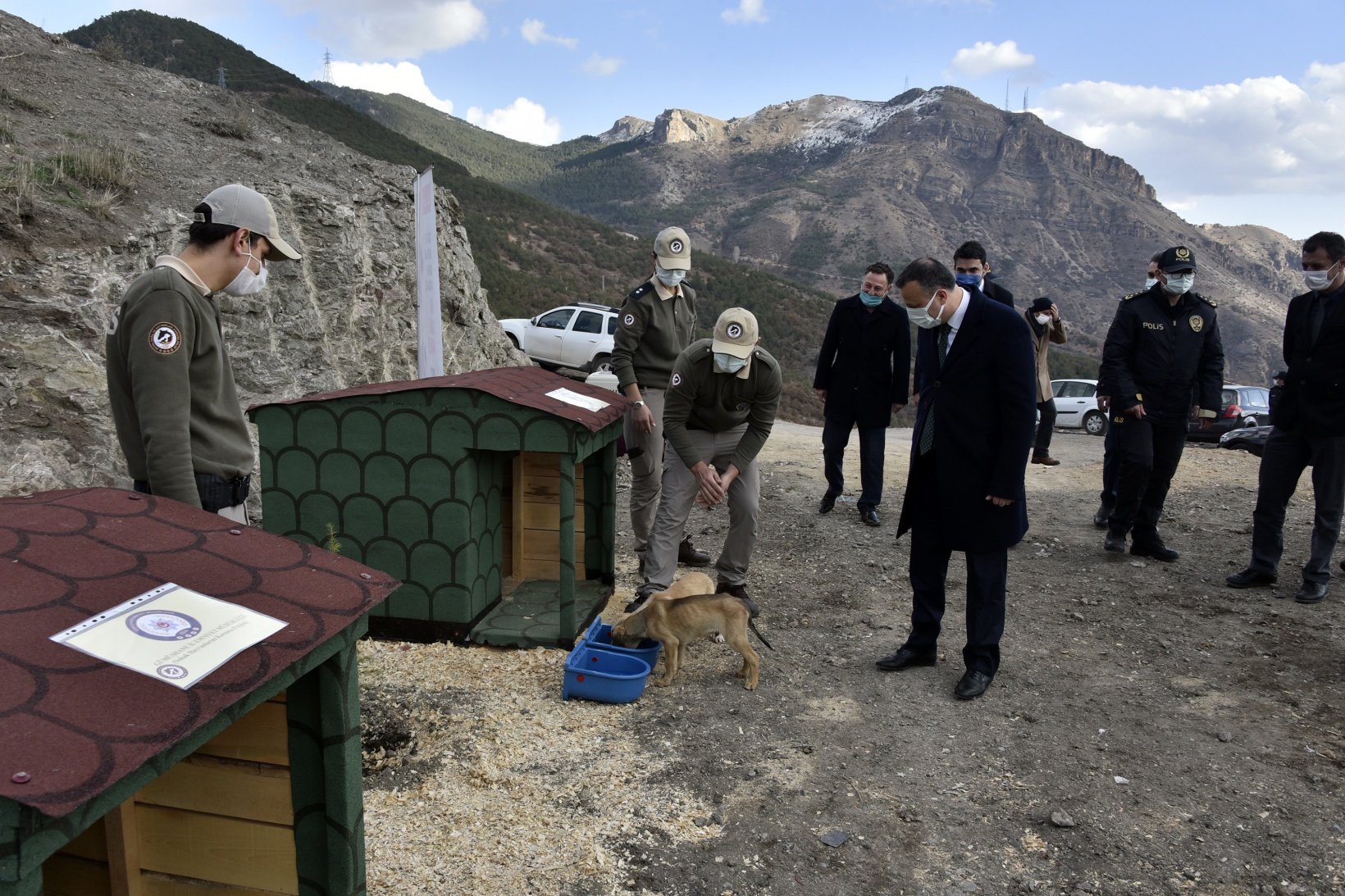 Sokak köpeklerinin özellikle soğuk kış günlerinde barınma ve beslenme ihtiyacı için yapılan kulübeleri beraberinde İl Emniyet Müdürü Celal Taşci ile inceleyerek burada bulunan yavru köpekleri besleyen Gümüşhane Valisi Kamuran Taşbilek, gazetecilere yaptığı açıklamada emeği geçen herkese teşekkür etti.