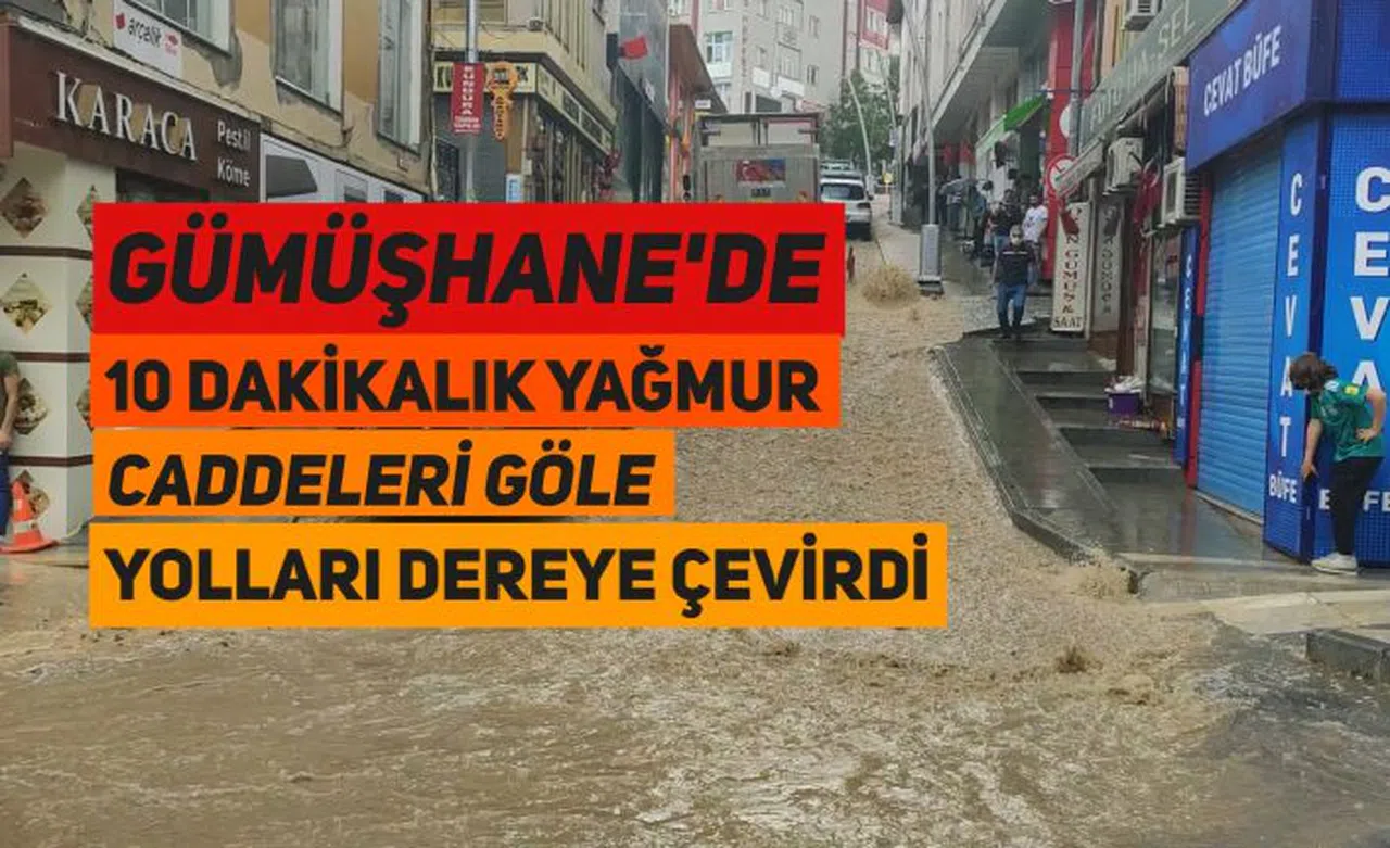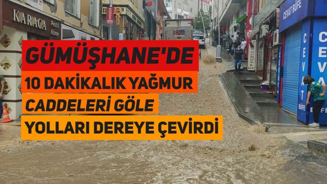 Gümüşhane kent merkezinde 10 dakika boyunca etkili olan kuvvetli sağanak ve dolu yağışı caddeleri ve yolları göle döndürdü.