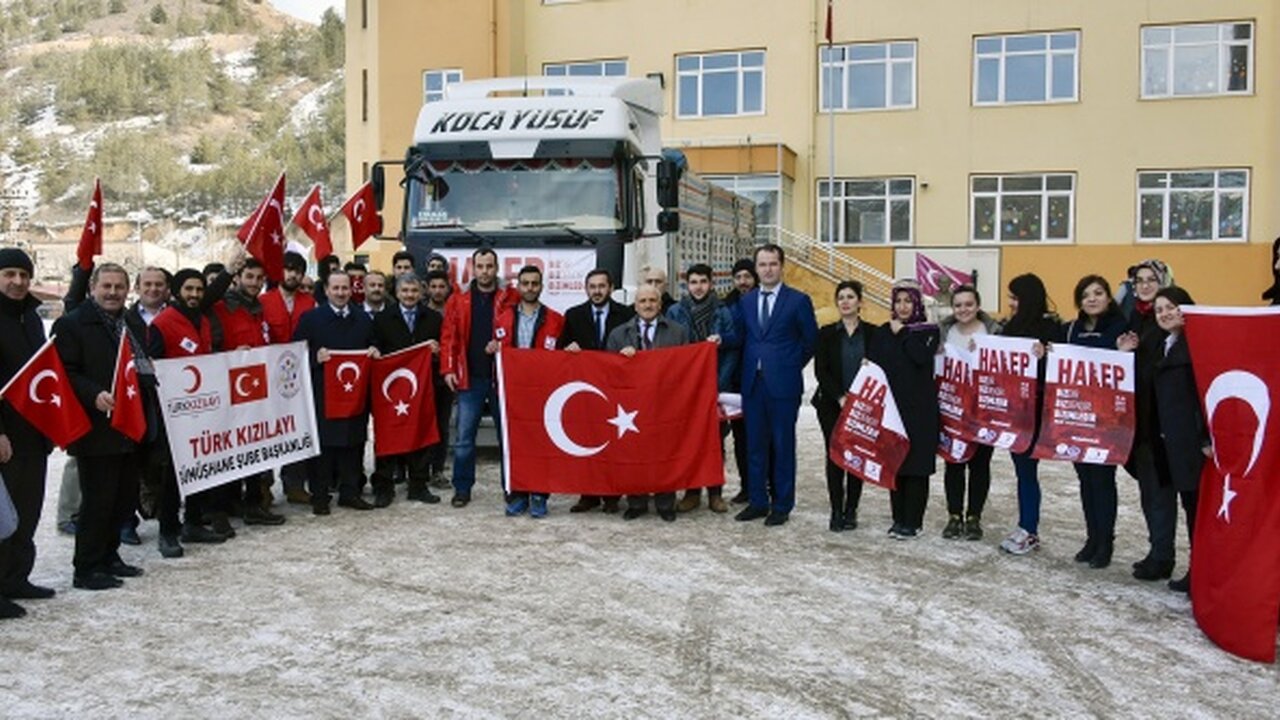 Gümüşhane’de Kredi Yurtlar Kurumuna (KYK) bağlı yurtlarda barınan öğrenciler tarafından soğuk kış gününde gerçekleştirilen kampanyada toplanan 60 bin TL değerindeki yardım malzemesi Halep’e yollandı.