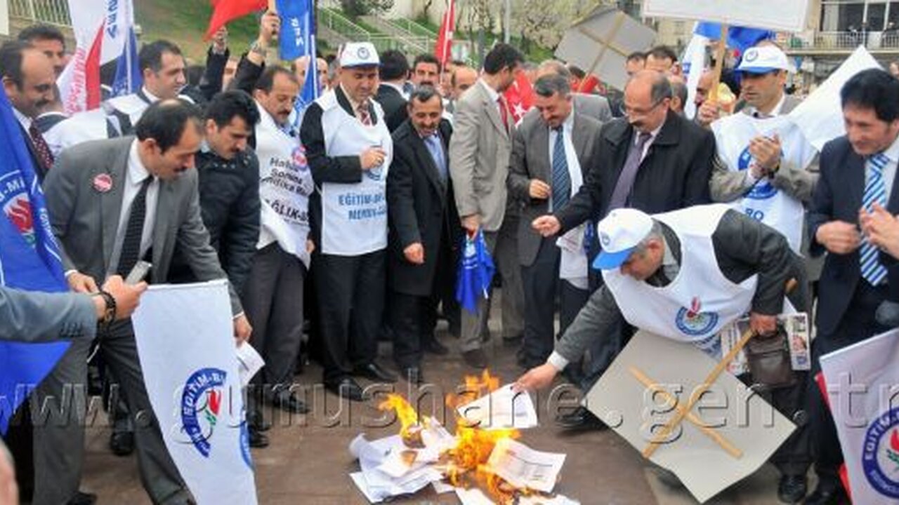 Gümüşhane’de Memur-Sen’e bağlı Eğitim-Bir-Sen üyesi memurlar “İnsanca Yaşamak İçin Emeğimizin Karşılığını İstiyoruz” sloganı ile bordro yakma eylemi yaptı.
