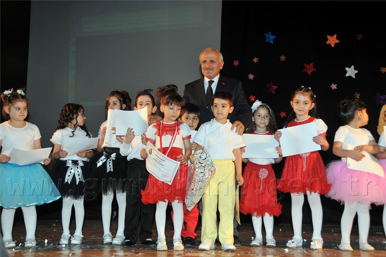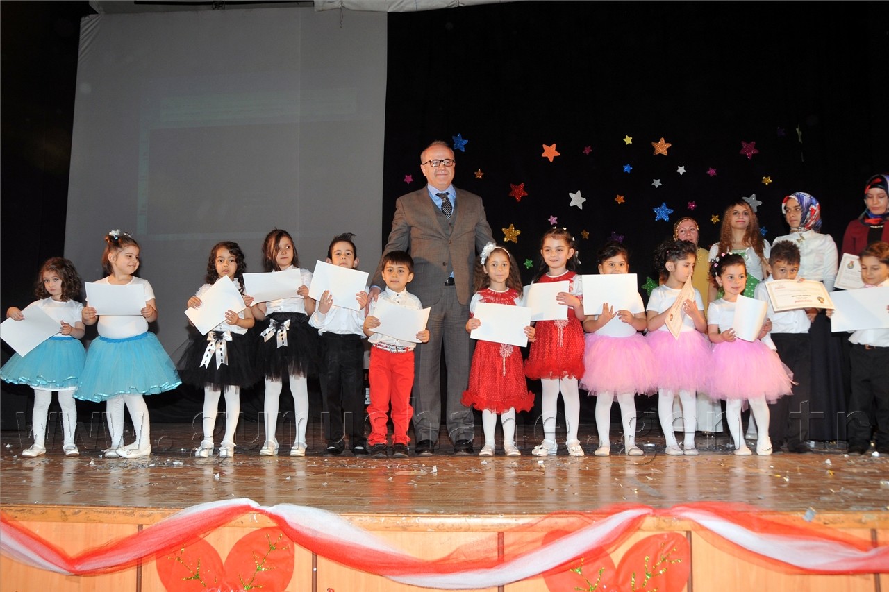 Salonda bulunan çok sayıda annenin duygusal anlar yaşadığı, birçok velinin çocuğunu ilk kez sahnede izleme fırsatı bulduğu ve yaklaşık 1,5 saat süren program, okulda düzenlenen yarışmalarda dereceye giren öğrencilere ödül ve belgelerinin verilmesinin ardından sona erdi.