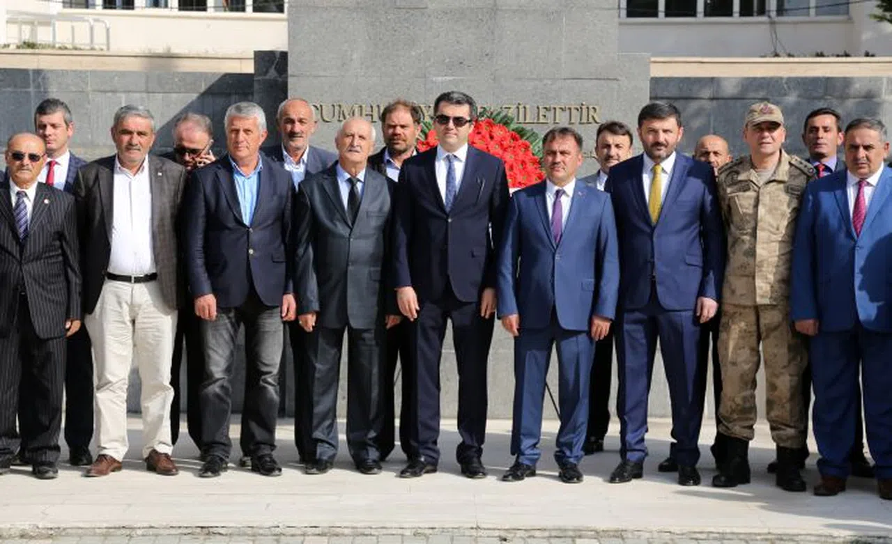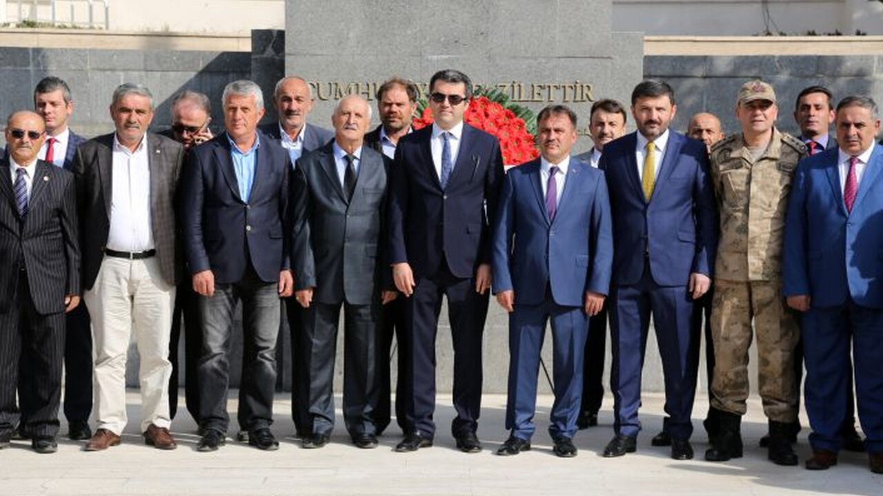 Hükümet Konağı önündeki Atatürk Anıtına Gümüşhane Köy ve Mahalle Muhtarları Derneği Başkanı Gürbüz Demir ve muhtarlar tarafından çelenk sunulması ve geleneksel hatıra fotoğrafı çektirilmesinin ardından dernek yönetimi ve muhtarlar Vali Okay Memiş’i makamında ziyaret etti.