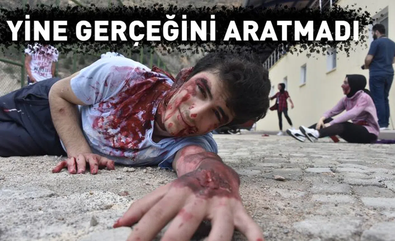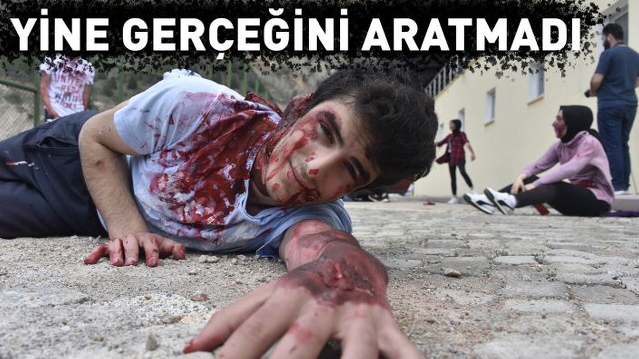 Toplam 4 bölümden oluşan tatbikatta birinci sınıf öğrencileri ilk olarak stadyumda maç sırasında bomba yüklü aracın patlamasını maytap ve sis bombalarıyla canlandırdı. Temin edilen 2 hurda araç içerisinde yaralıların feryatlarını tiyatrocular gibi canlandıran öğrenciler ayrıca yaraları göstermek için makyaj yaptı.