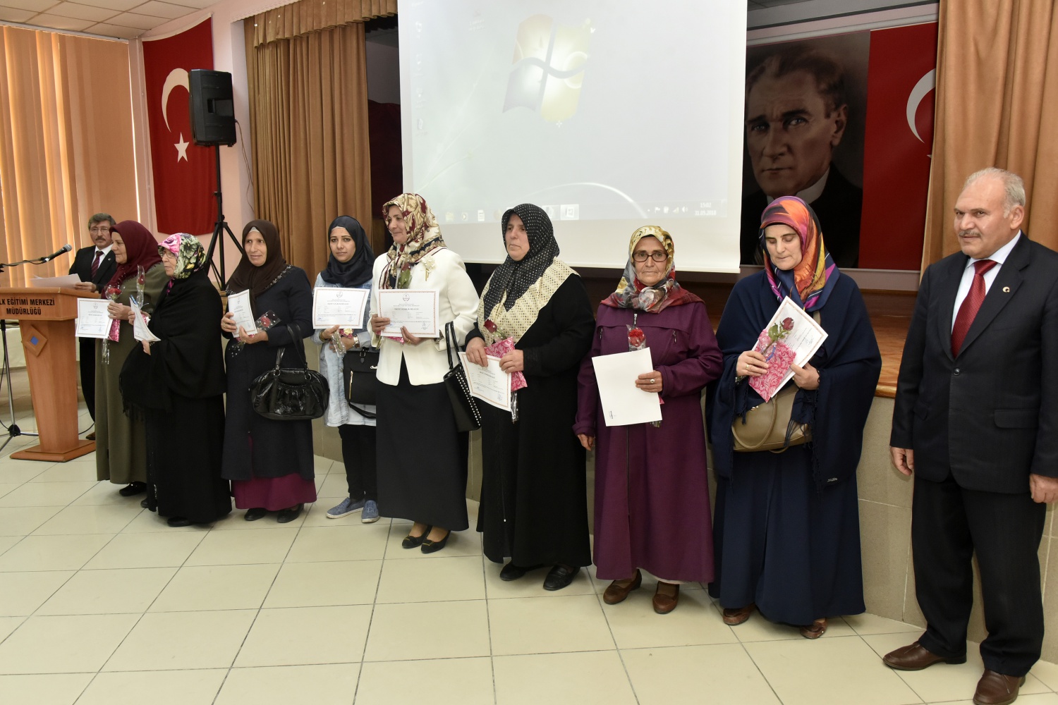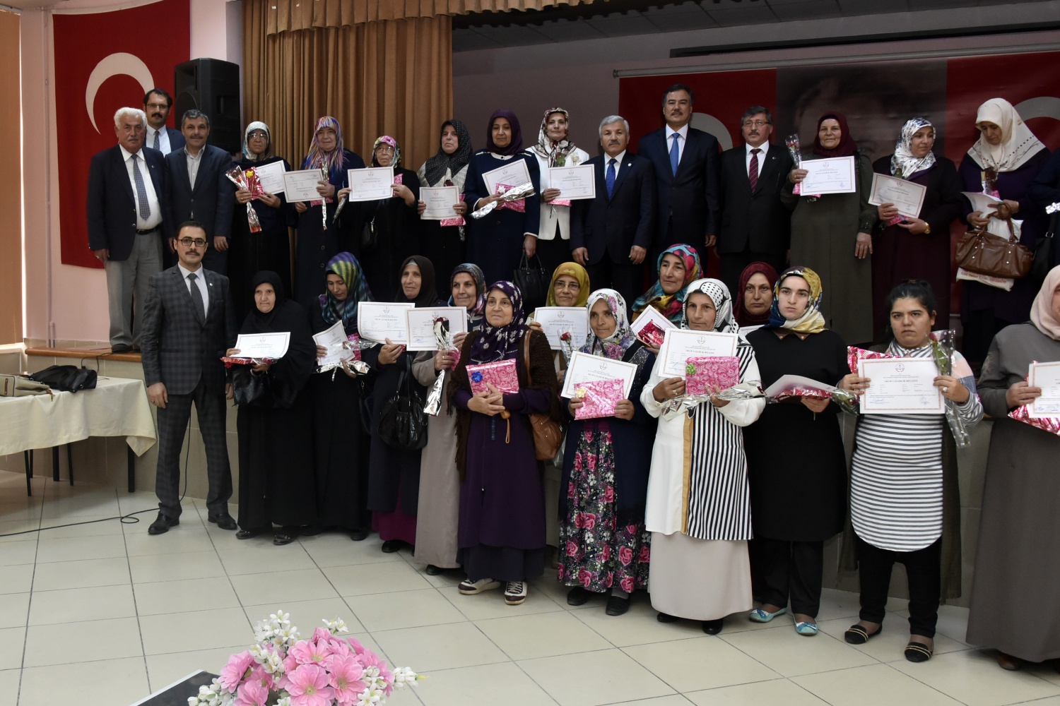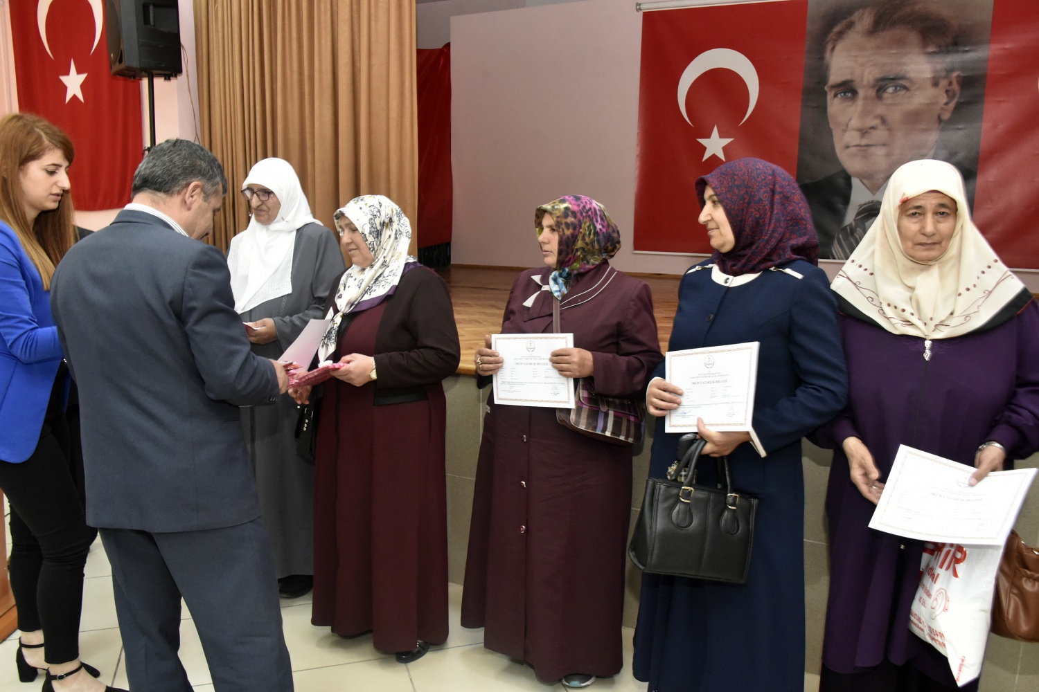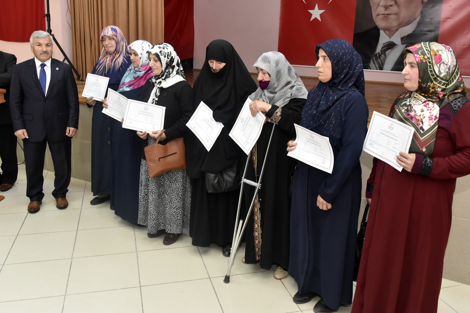Halk Eğitimi Merkezi Salonunda düzenlenen törende tamamı kadınlardan oluşan kursiyerler belgelerini aldı.