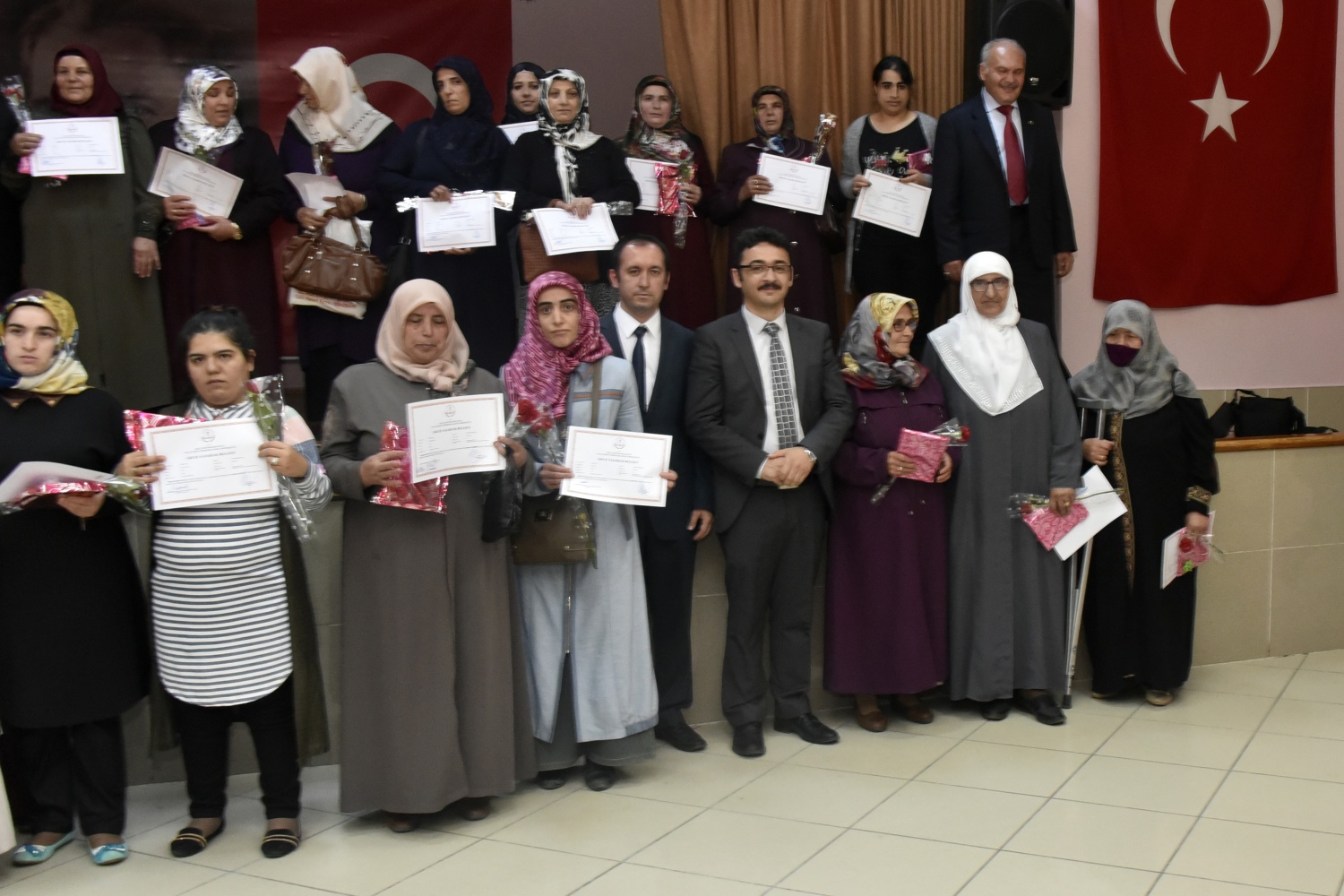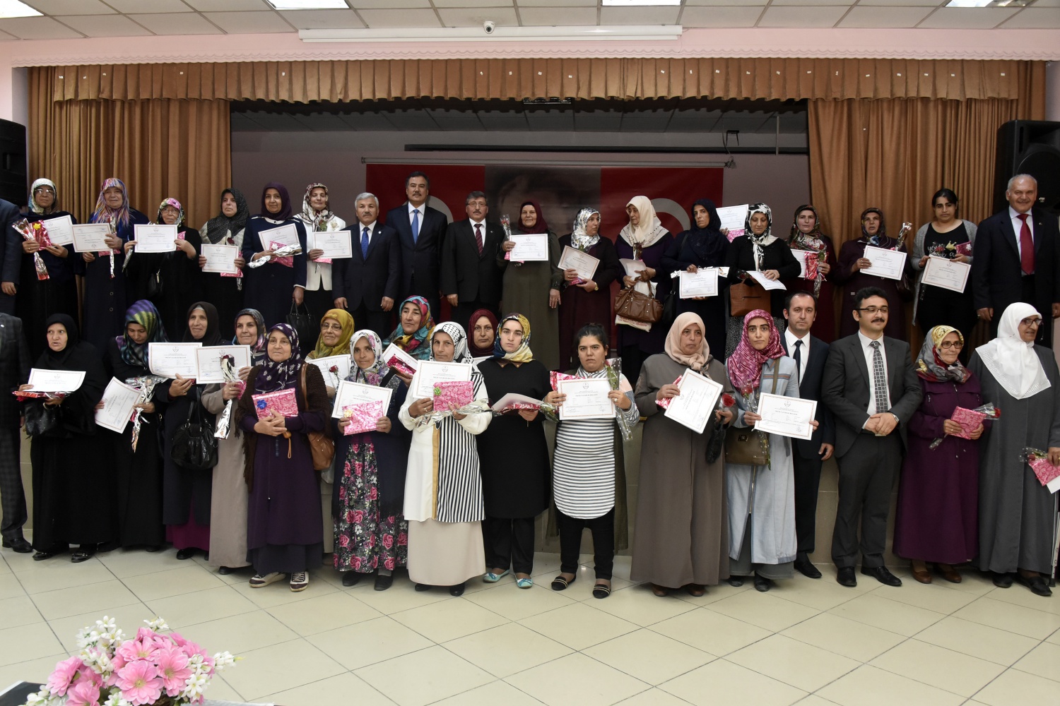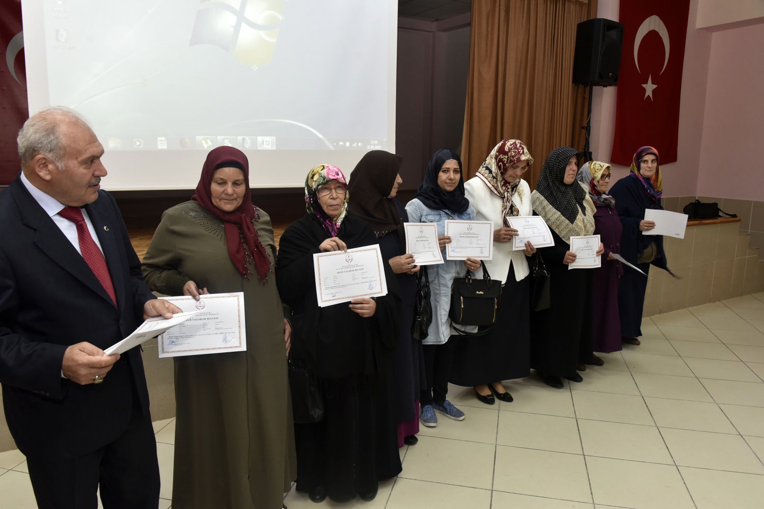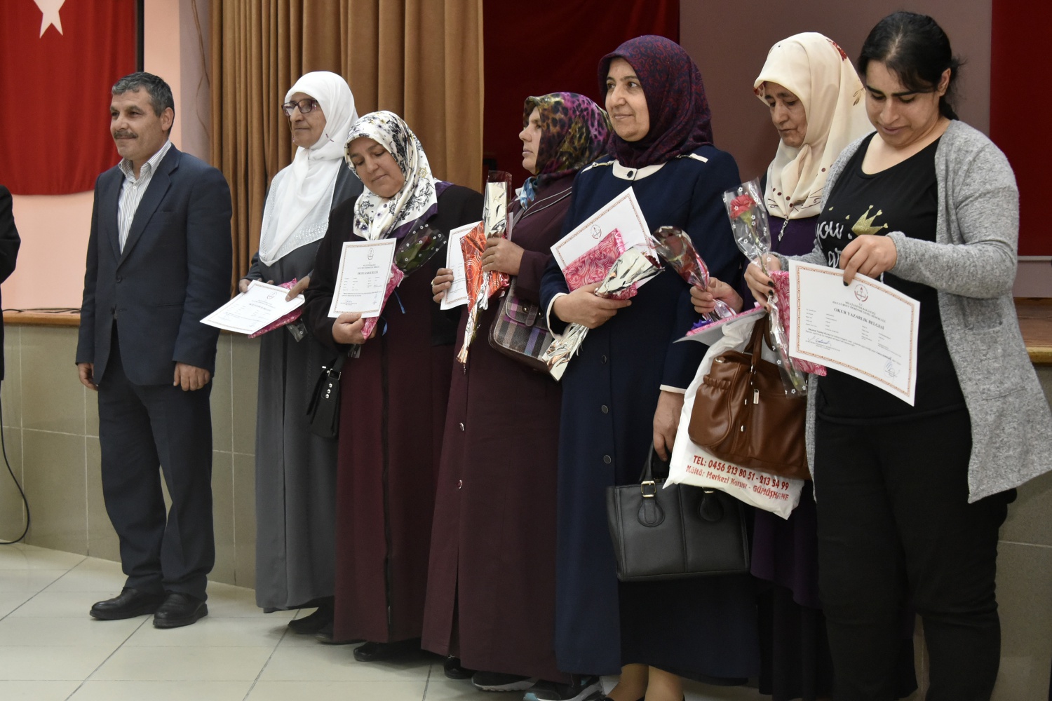 Halk Eğitimi Merkezi Salonunda düzenlenen törende tamamı kadınlardan oluşan kursiyerler belgelerini aldı.