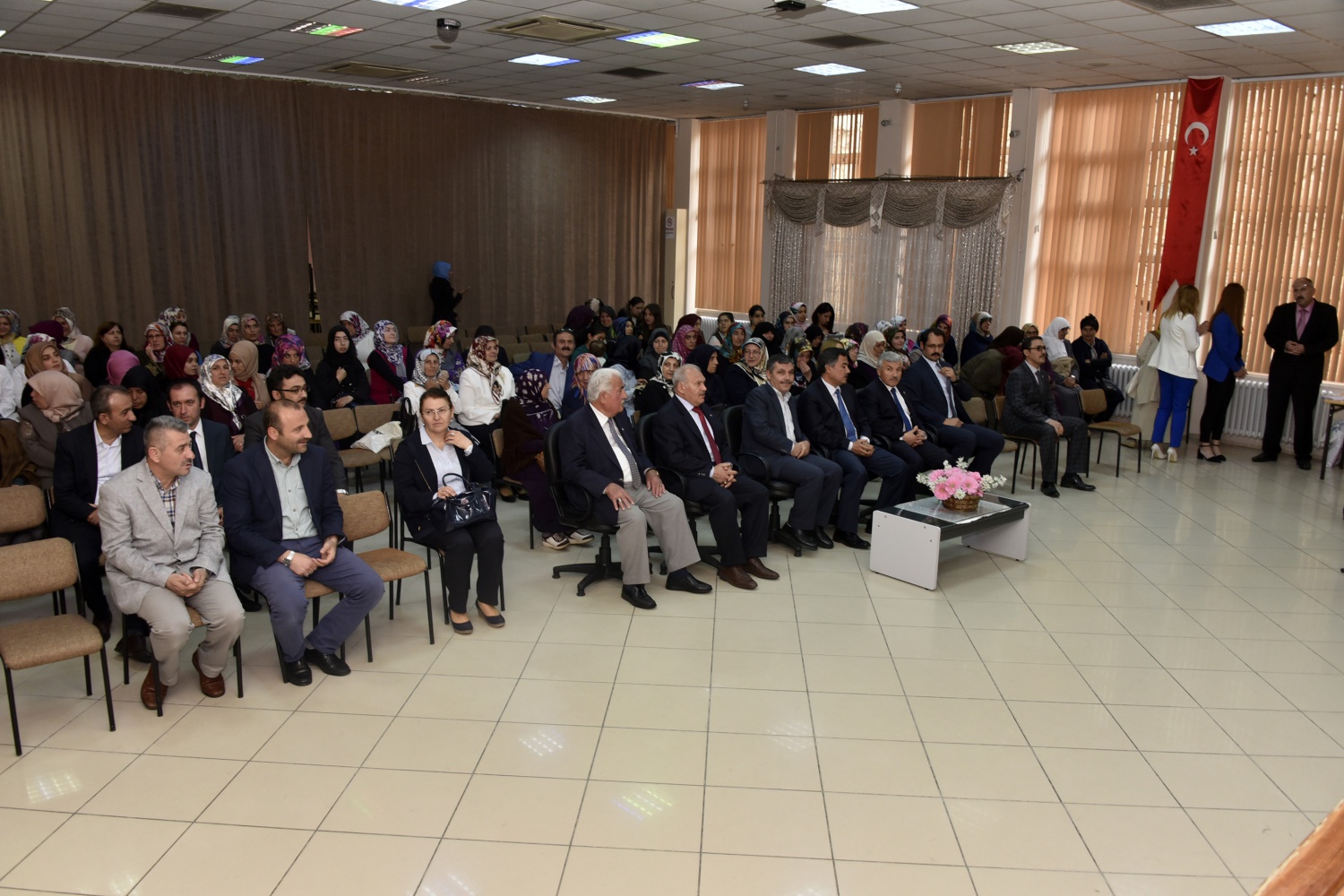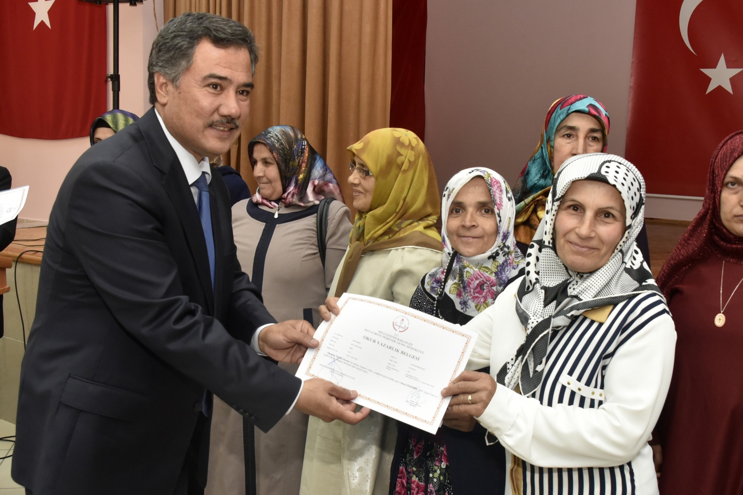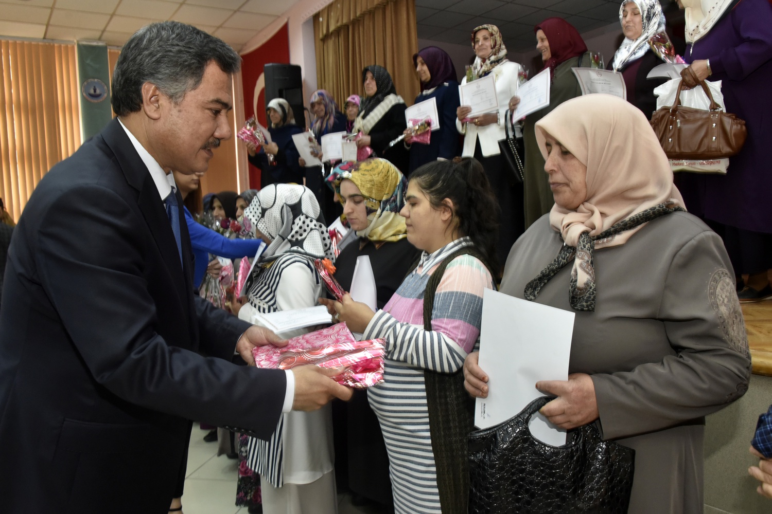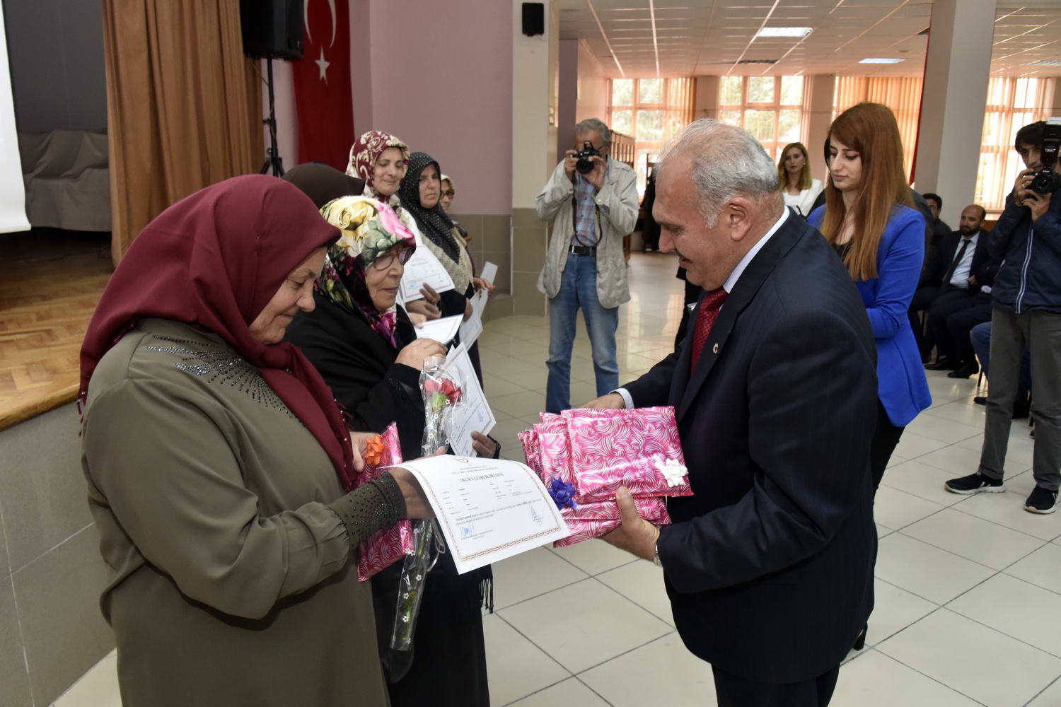 Halk Eğitimi Merkezi Salonunda düzenlenen törende tamamı kadınlardan oluşan kursiyerler belgelerini aldı.