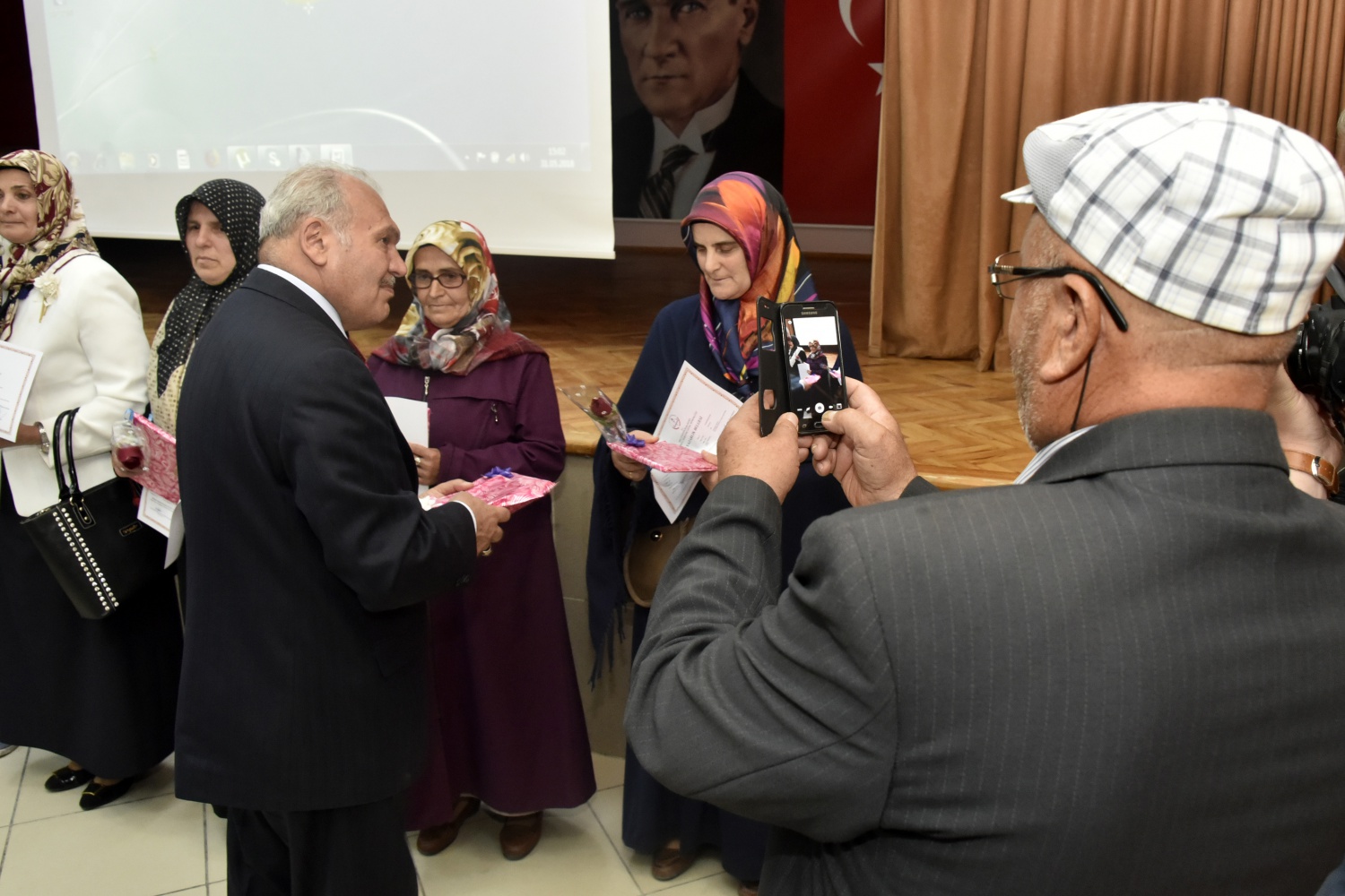 Törene katılan kurum müdürleri tarafından belge, kitap ve karanfillerini alan kursiyer kadınlar daha sonra hatıra fotoğrafı çektirdi.