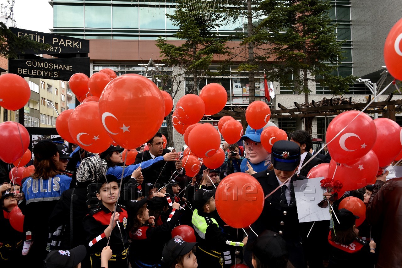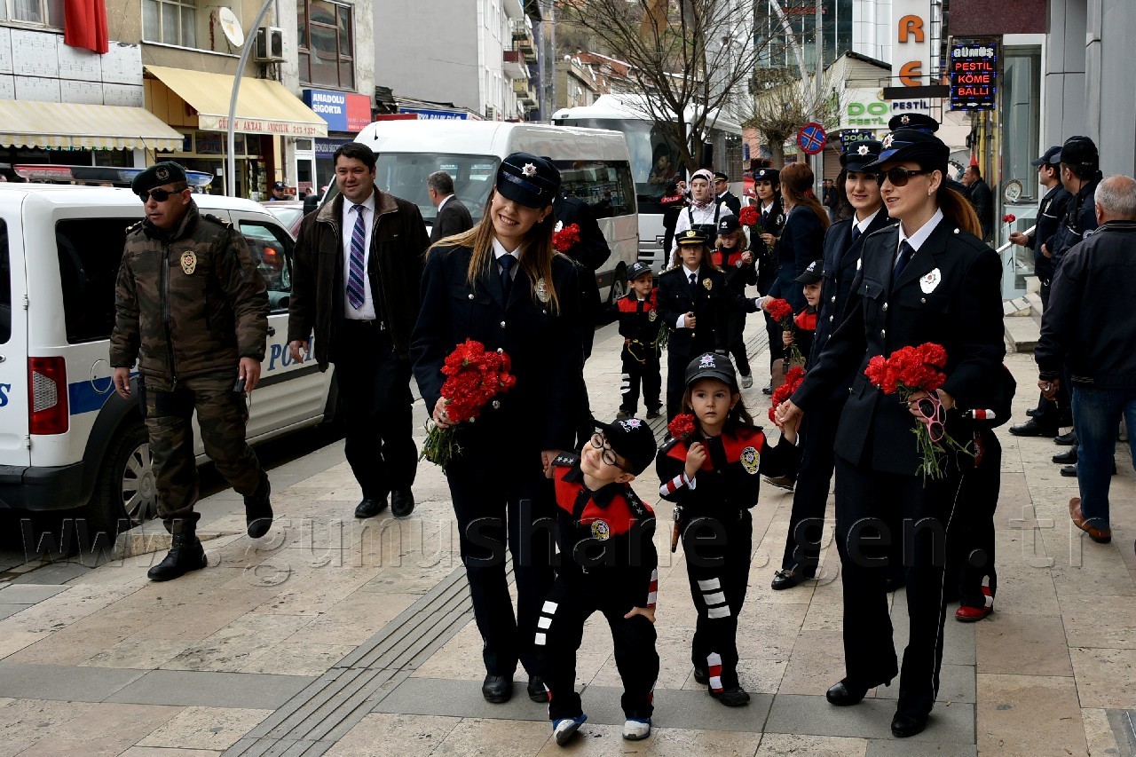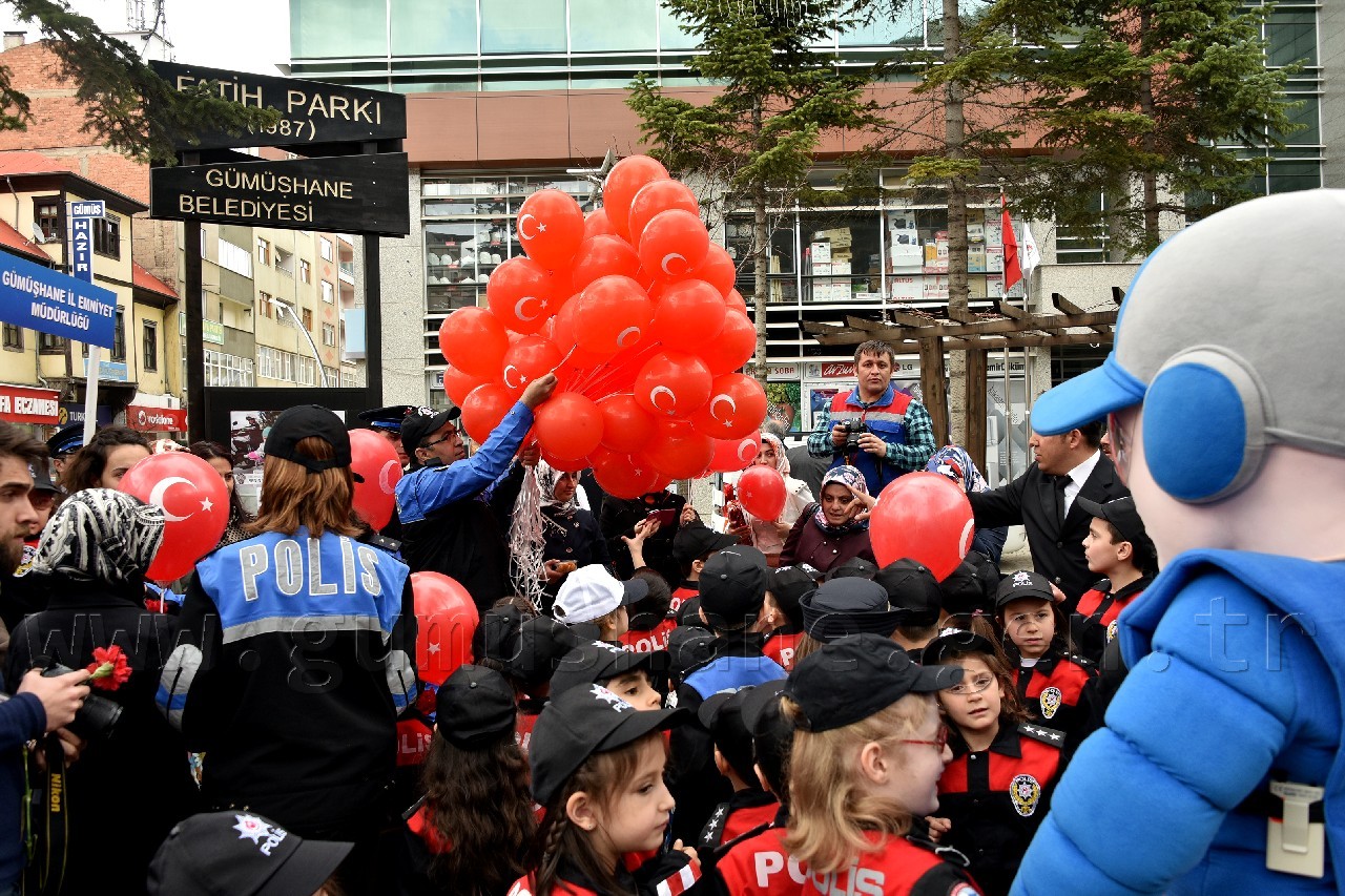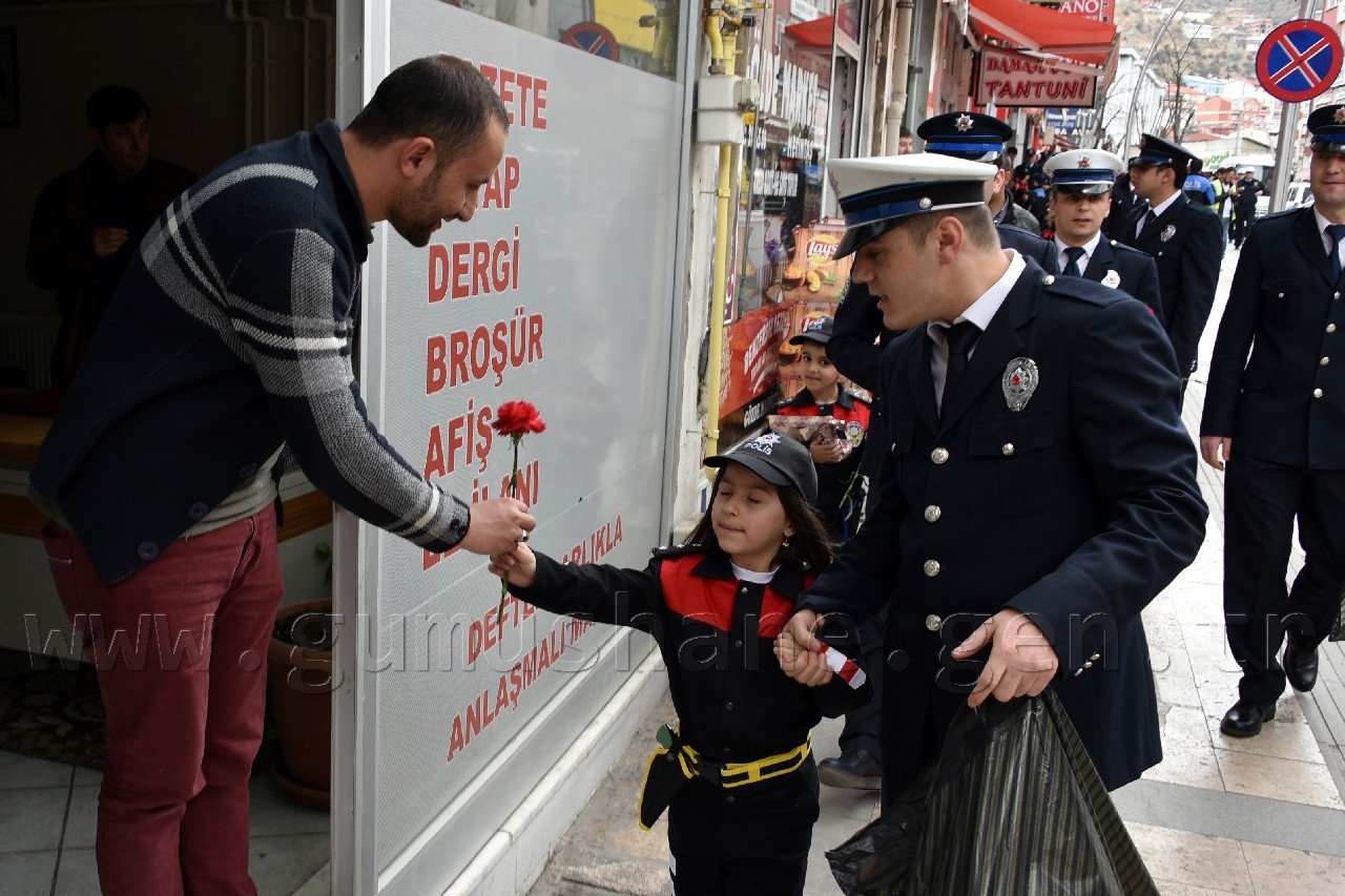 Kutlama programı kapsamında polis kıyafeti giydirilmiş öğrenciler, beraberinde veli, polis amca ve ablaları ile birlikte Atatürk Caddesinde ki esnafa karanfil takdim etti. Fatih parkına kadar caddenin her iki yakasında da esnaf ziyareti yapan minik öğrenciler daha sonra Fatih Parkında Gümüşhane Emniyet Müdürlüğünün maskotu Gümüş Çocuk’la buluştu.