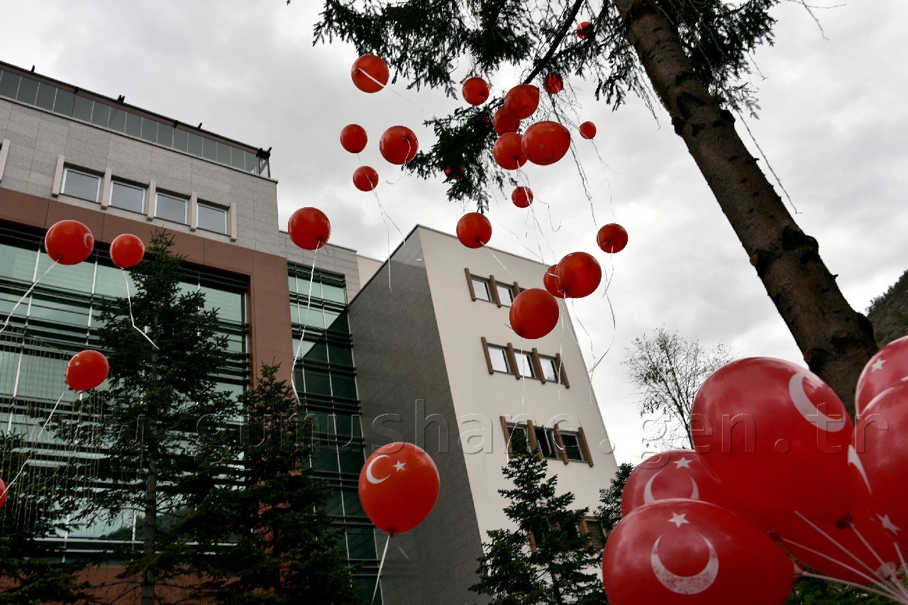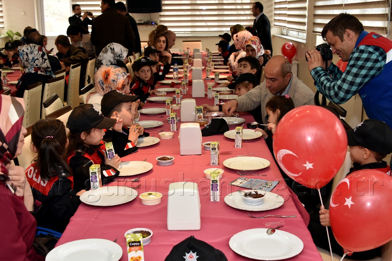 Burada Emniyet Müdürlüğü tarafından vatandaşlara ve öğrencilere ikram edilen lokma tatlısını yiyen öğrenciler, 10.Yıl Marşı eşliğinde üzerinde Türk Bayrağı bulunan balonları havaya bıraktıktan sonra Polisevinde onurlarına verilen yemeği yedi.