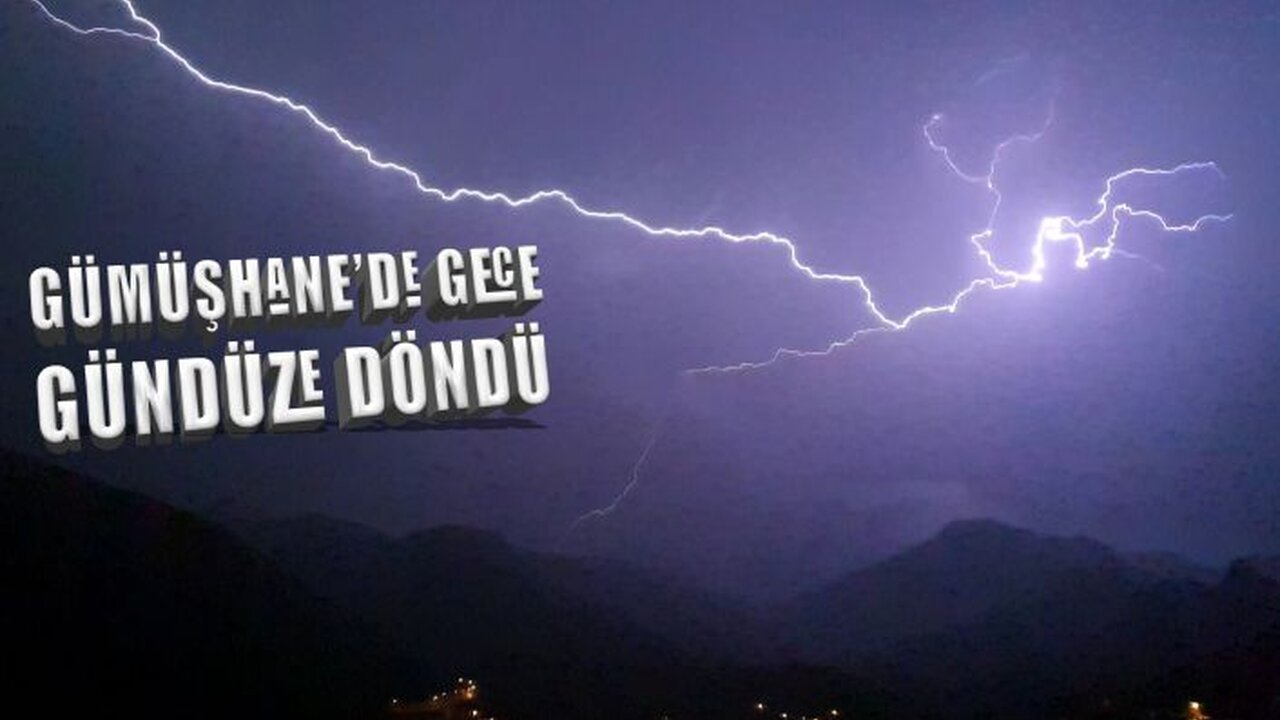 Gümüşhane’de akşam saatlerinde başlayan ve 15 dakika boyunca etkili olan yağmur yağışı sırasında çakan şimşekler adeta geceyi gündüze çevirdi.