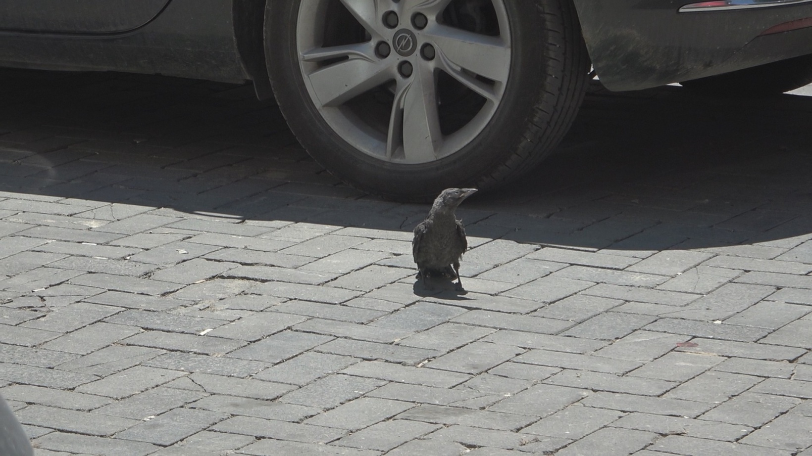 Atatürk Caddesinde 5 katlı bir binanın çatı katında yuvası bulunan yavru karga henüz uçmayı öğrenemediği için yaklaşık 20 metre yükseklikten yola düştü.