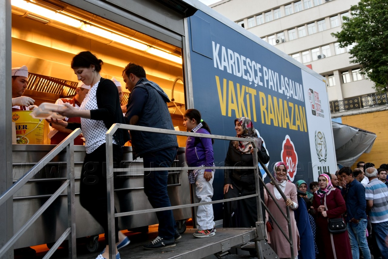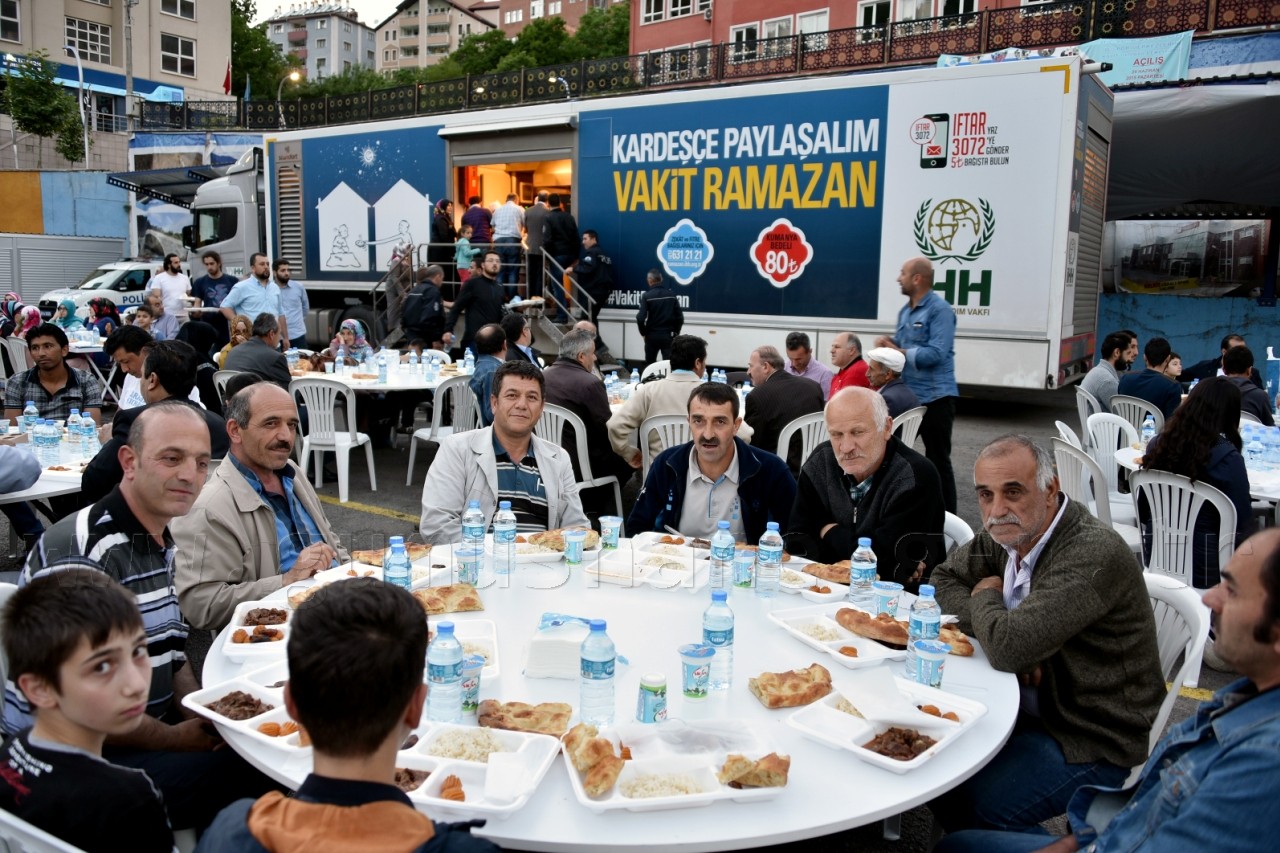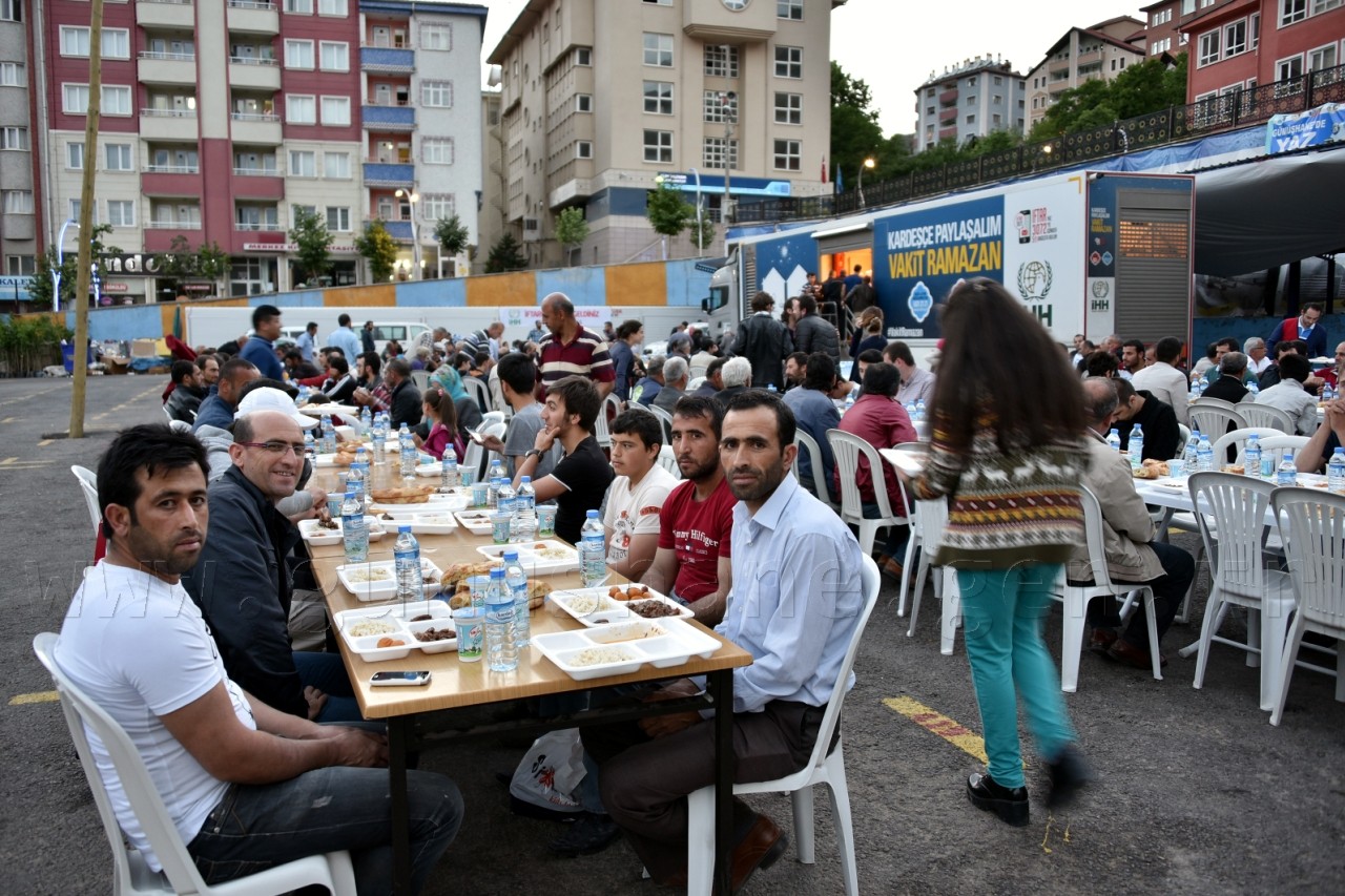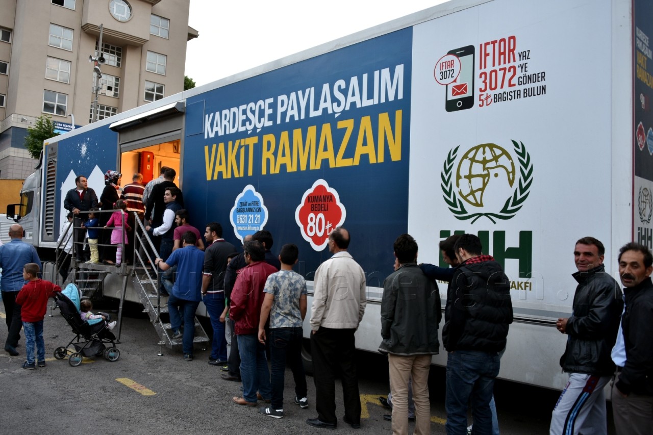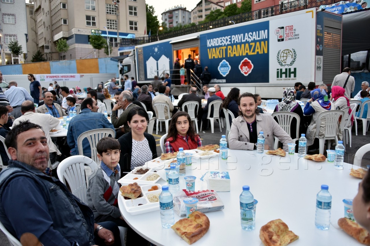 İHH’nın gezici aşevi TIR'ının Zafer Meydanında konuşlanmasının ardından yüzlerce vatandaş alandaki masaları doldurarak ezanın okunmasının ardından hep birlikte iftar yaptı.