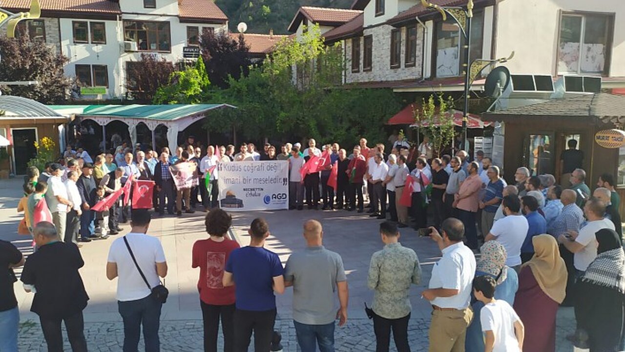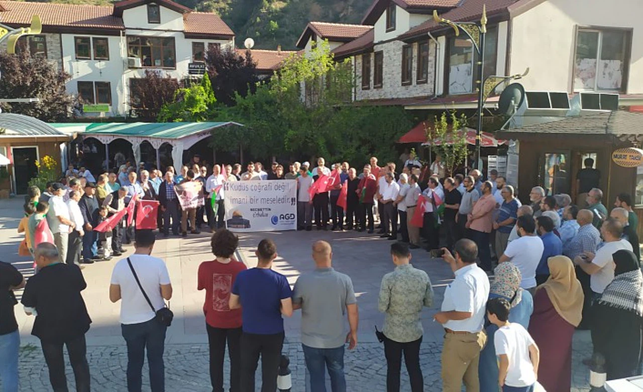 15 Temmuz Zafer Meydanında gerçekleştirilen açıklamada merhum Başbakanlardan Necmettin Erbakan’ın “Kudüs coğrafi değil, imani bir meseledir” sözü yazılı pankart açıldı.