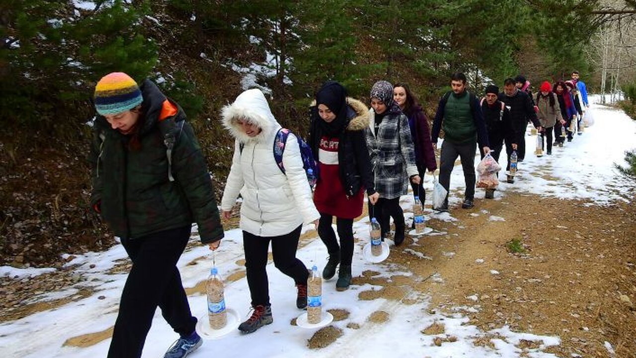Karla kaplı yürüyüş parkurunda zaman zaman soğuk hava nedeniyle zor anlar yaşayan sporcular evde hazırlayıp içini buğdayla doldurdukları kuş yemliklerini etkinlik boyunca ellerinde taşıyarak ormanlık alandaki ağaçlara astı, evlerinde biriktirdikleri ekmek artıklarını da yaban hayvanların ulaşabileceği yerlere bıraktı.