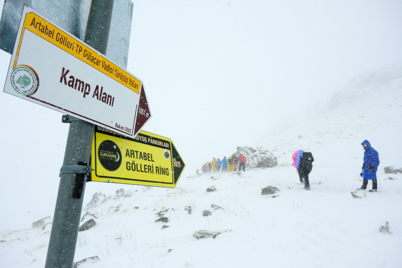 Şehit öğretmen Necmettin Yılmaz anısına düzenlenen özel etkinlikte yaz aylarında cennetten bir köşe olan Artabel Gölleri Tabiat Parkında gerçekleştirilen etkinlikte sporcular kar ve tipi nedeniyle oldukça zorlandı.