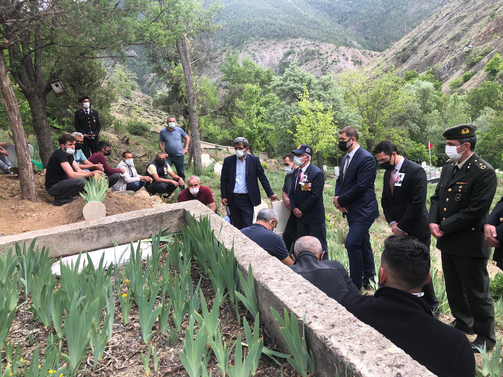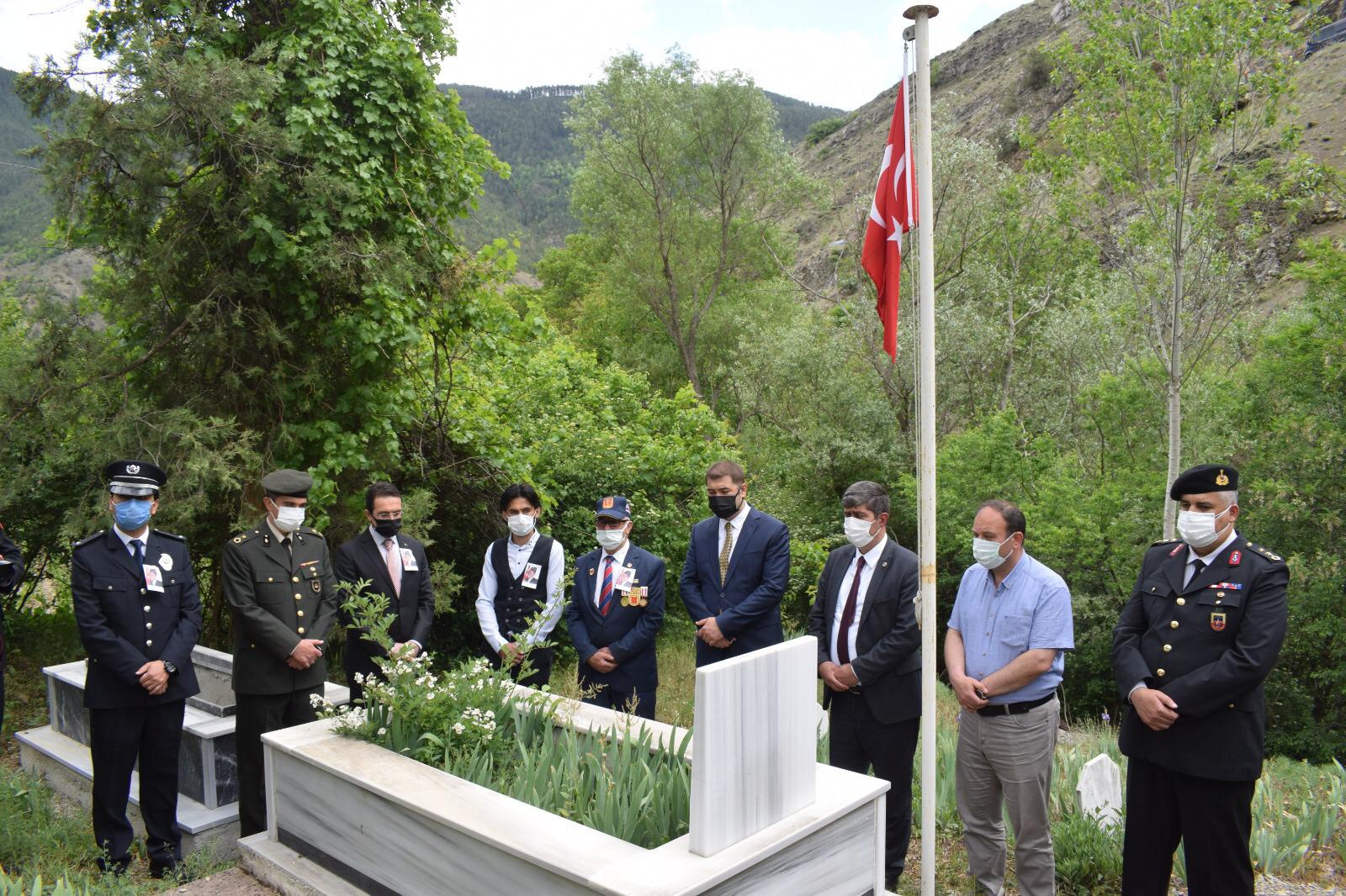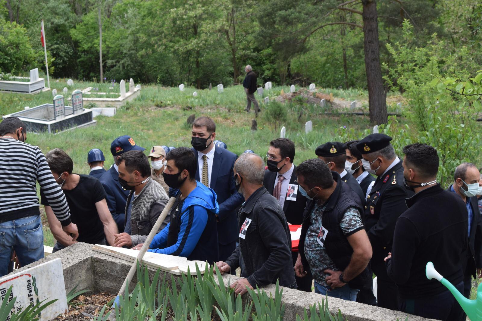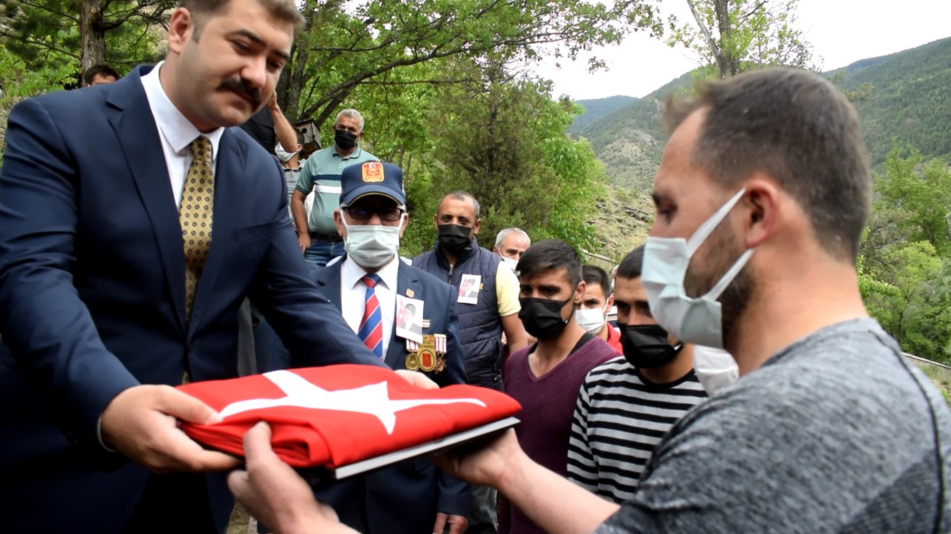 Defnin ardından tabuta sarılı Türk Bayrağı Kaymakam Ömer Said Karakaş tarafından vefat eden Gazi Fuat Ayhan’ın oğlu Bayram Ayhan’a taziye dileklerinin ardından teslim edildi.