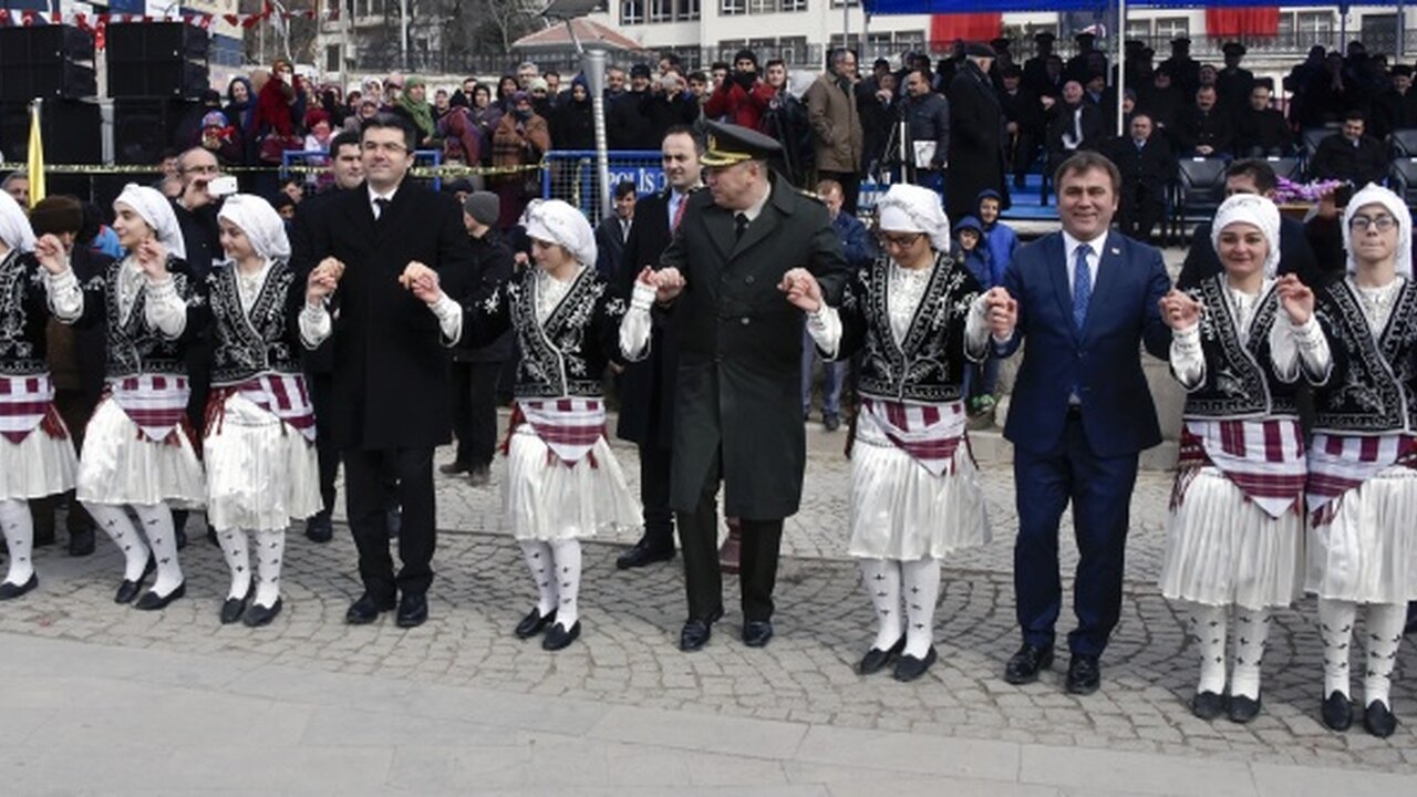 Okulların gerçekleştirdiği halk oyunları gösterisinde ise Gümüşhane'nin yöresel ürünlerinin yapımının canlandırılması sırasında meydandaki coşku en üst seviyeye çıkarken, bu sırada çalan davul zurnayla oynayan gençlerin arasına katılan Vali Okay Memiş, Belediye Başkanı Ercan Çimen, Garnizon Komutan Vekili Yarbay Semih Bulut büyük alkış aldı.