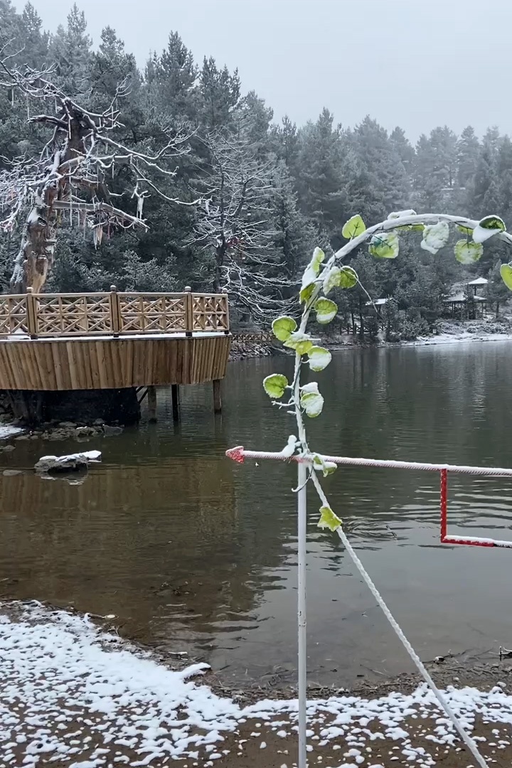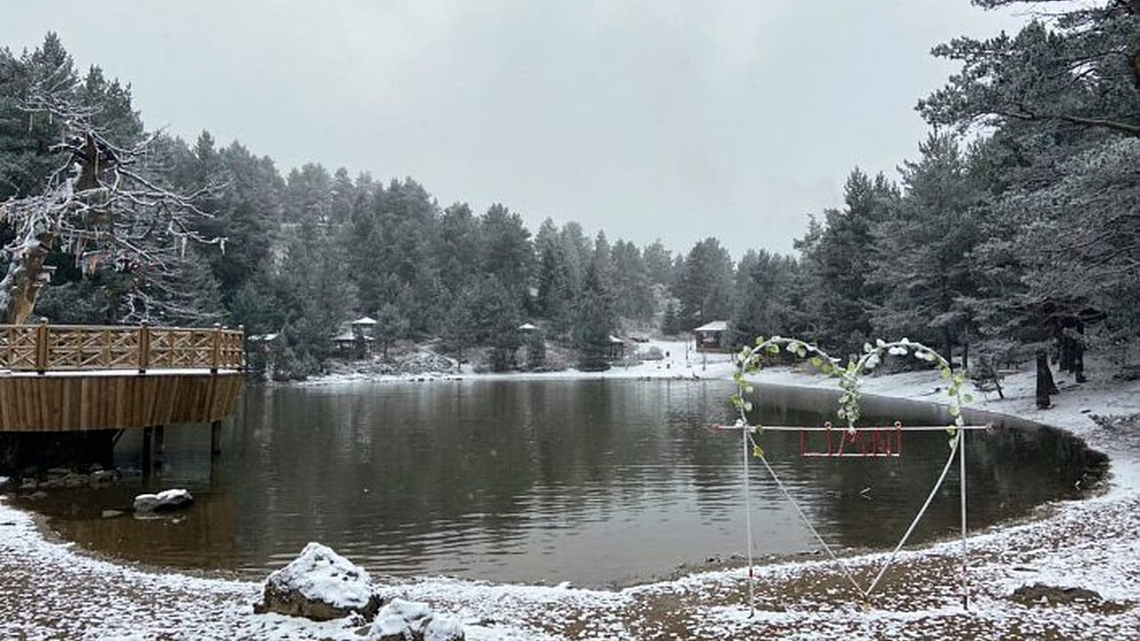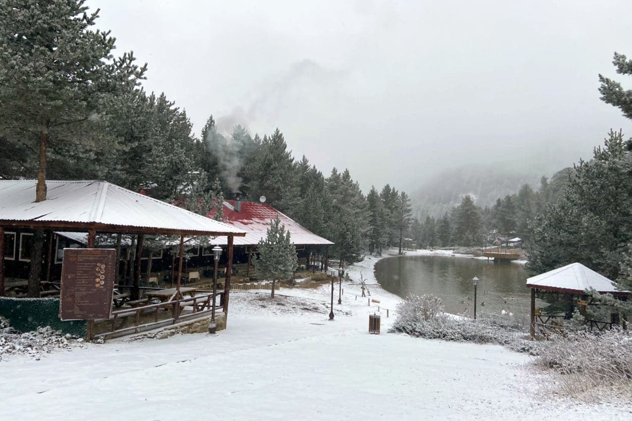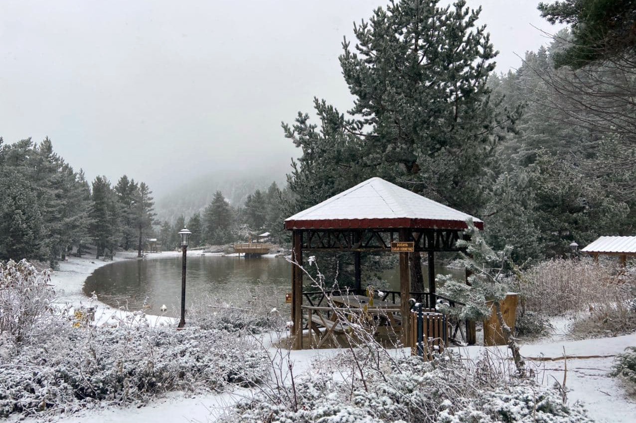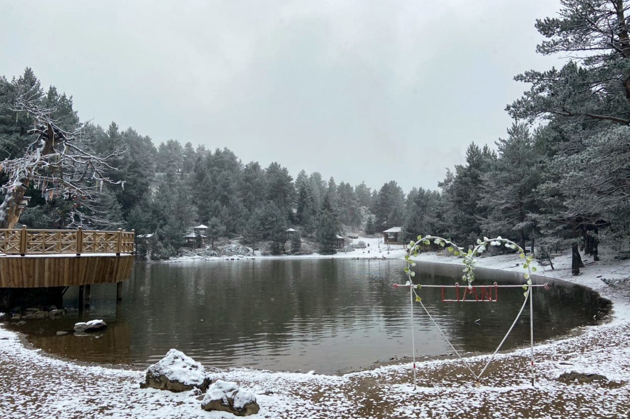 Denizden 2 bin 24 metre yükseklikteki Limni Gölü Tabiat Parkında sabaha karşı gerçekleşen hafif kar yağışının ardından göl ve etrafındaki ağaçlar beyaz örtüyle bezenirken ortaya seyrine doyumsuz manzaralar çıktı.