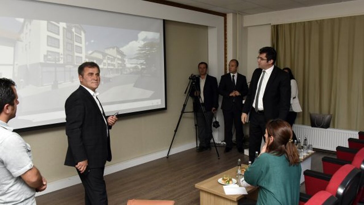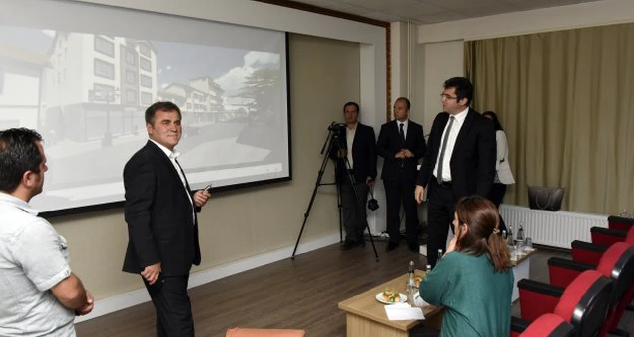 Zafer Meydanındaki tüm binaların tarihi Gümüşhane evleri şeklinde giydirileceği, finansmanı Kültür ve Turizm Bakanlığı tarafından karşılanacak olan ve ihalesi yapılan proje için Belediye Başkanlığında gerçekleştirilen toplantıya Vali Okay Memiş, Belediye Başkanı Ercan Çimen, proje mimarları Merve Kullukçu ve Neşe Telli ve meydanda ki işyeri sahipleri katıldı.