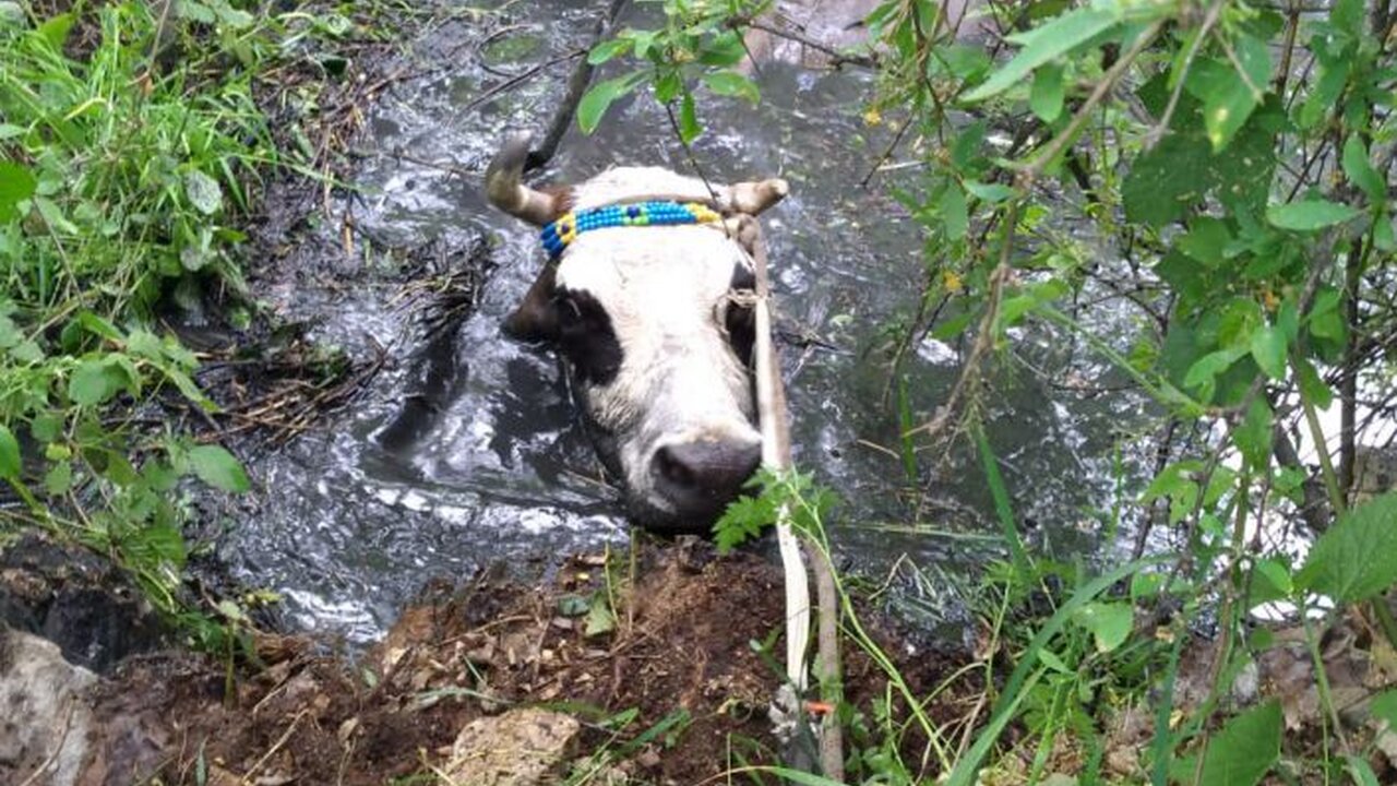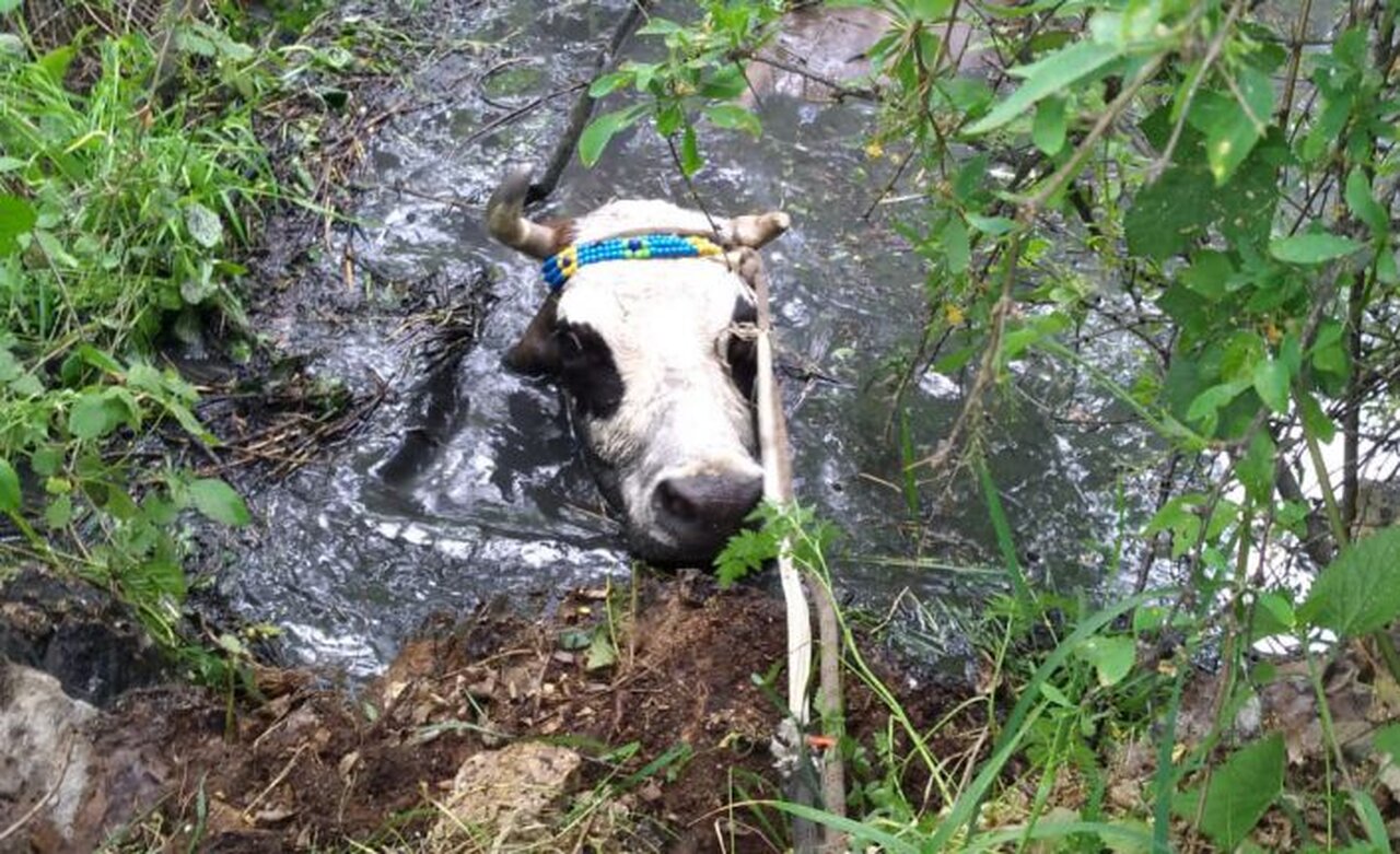 Olay yerine ulaşan ekipler 4 saat süren çalışma sonucunda halatlarla bağladıkları ineği elbirliğiyle sağ salim kurtararak sahibine teslim etti.