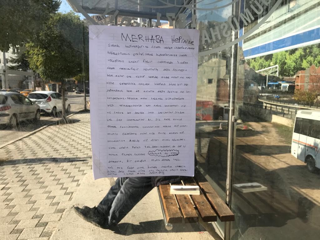 İlkokul öğrencisi tarafından yazıldığı değerlendirilen yazıda şu ifadelere yer verildi: “Merhabalar hepinize. Sokak hayvanlarına önem veren insanlarımıza teşekkürümüz çoktur. Sokak hayvanlarımıza önem verdiğimiz kadar fakir insanlara da lütfen önem verelim. Fakir insanlarla dalga geçmeyin hem onlar çok üzülür hem de siz de onlar ne çektiyse çekersiniz. O yüzden lütfen böyle bir şey yapmayınız. Hem de onlarla dalga geçince ne kazanıyorsunuz. Geçelim onlar hakkında bilmeyenlere bilgi vermeye. Onlar da aynı sokak hayvanları gibi aç ve susuz bir şekilde ümit bekliyorlar. Sizden çok şey istemiyorlar ki. Siz nasıl evinize yemek götürüyorsanız, çocuklarınıza hediye alıp onları mutlu ediyorsanız onlar niye evine ekmek alıp, çocuklarına hediye alıp onları mutlu edemiyor. Çünkü onların parası yok. Bazı insanlar da der ki tamam ekmek neyse de oyuncak ne alaka demesin. Bir çocuğun mutlu olmaya hakkı yok mu? Fakir çocuk buraya yoksulluk çekeyim diye mi geldi. Yoksa Allah onu yoksulluk çeksin diye mi yolladı? Lütfen onlara yardım et.”