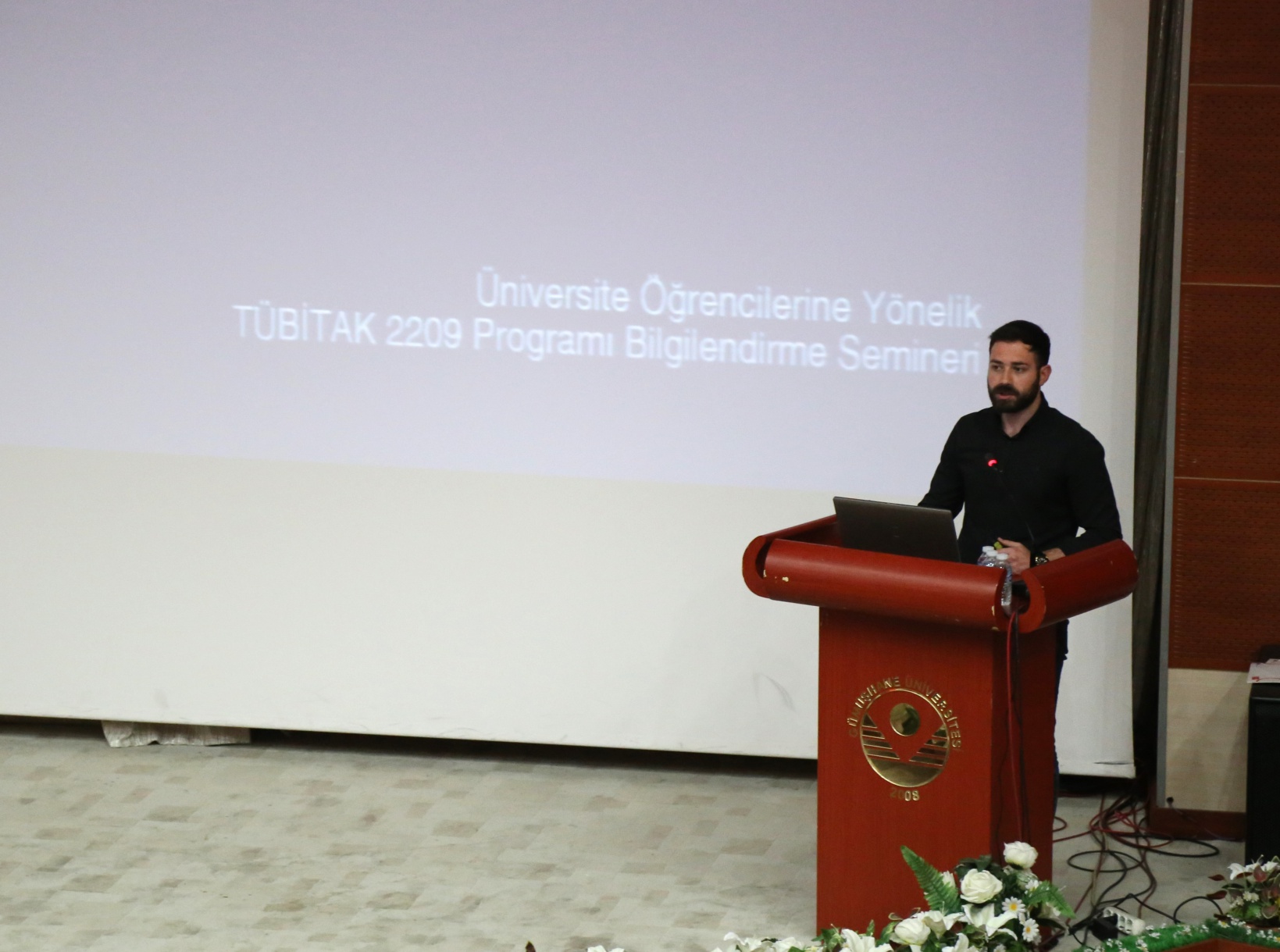 Karadeniz Teknik Üniversitesi (KTÜ) Teknoloji Transferi Uygulama ve Araştırma Merkezi Proje Destek Hizmetleri sorumlusu Öğr. Gör. Serhat Ünver de “2209-A Üniversite Öğrencileri Araştırma Projeleri Destekleme Programı” ile “2209-B Üniversite Öğrencileri Sanayiye Yönelik Araştırma Projeleri Desteği Programı” hakkında bir sunum gerçekleştirdi. Programların tanıtımı ve başvuru için gerekli şartları sunumunda yer veren Öğr. Gör. Ünver, TÜBİTAK ve BİDEB hakkında da bilgiler vererek öğrencilere başarılar diledi.
