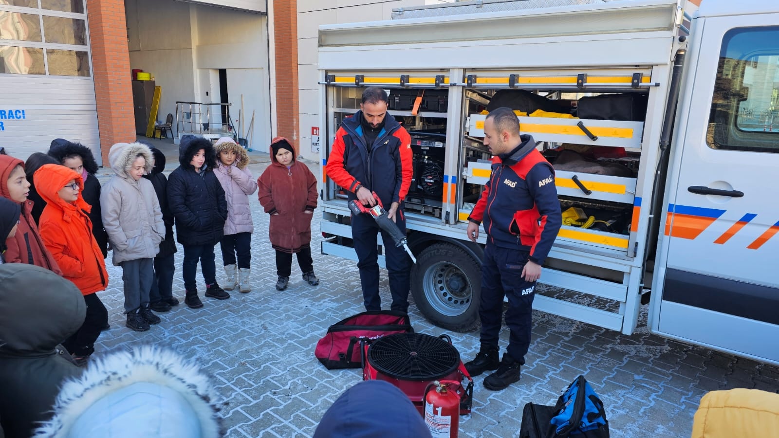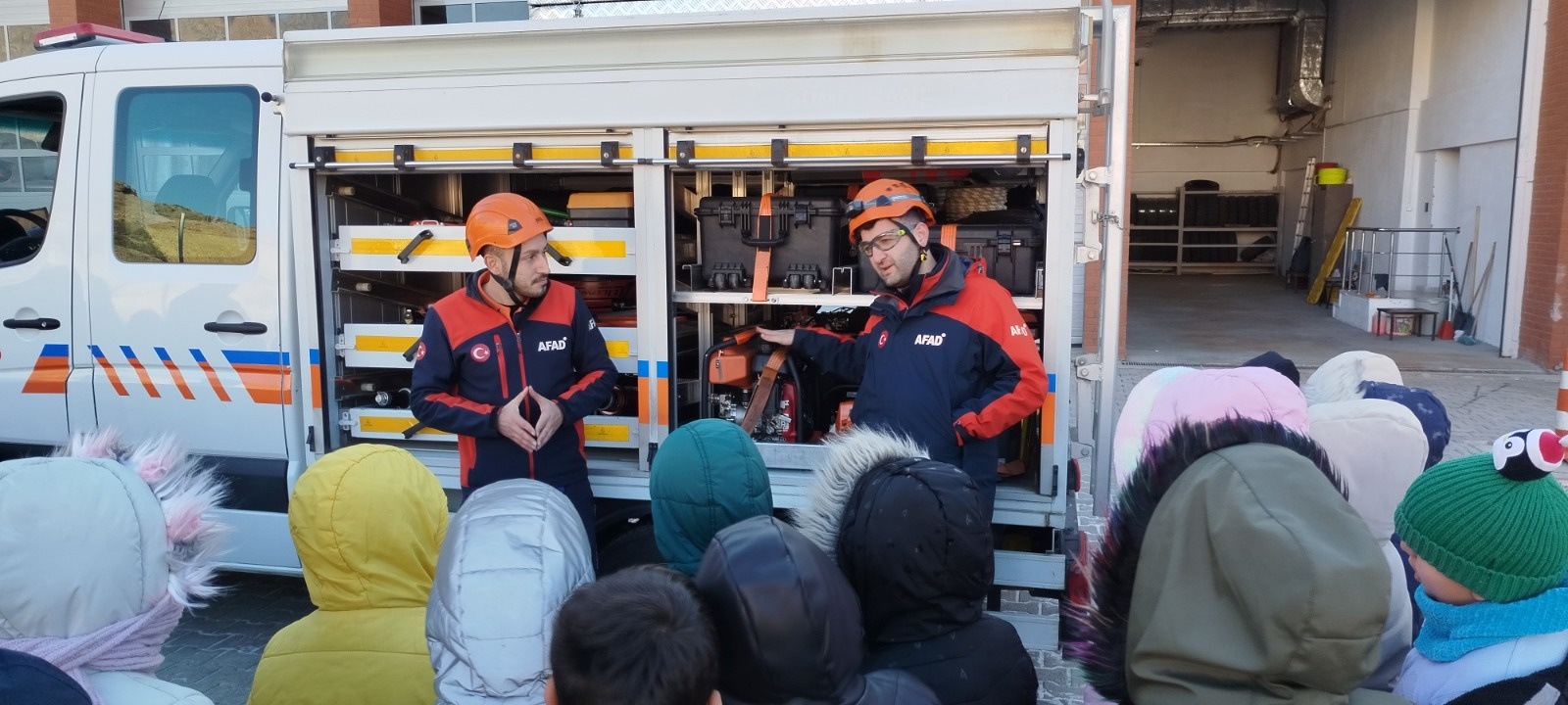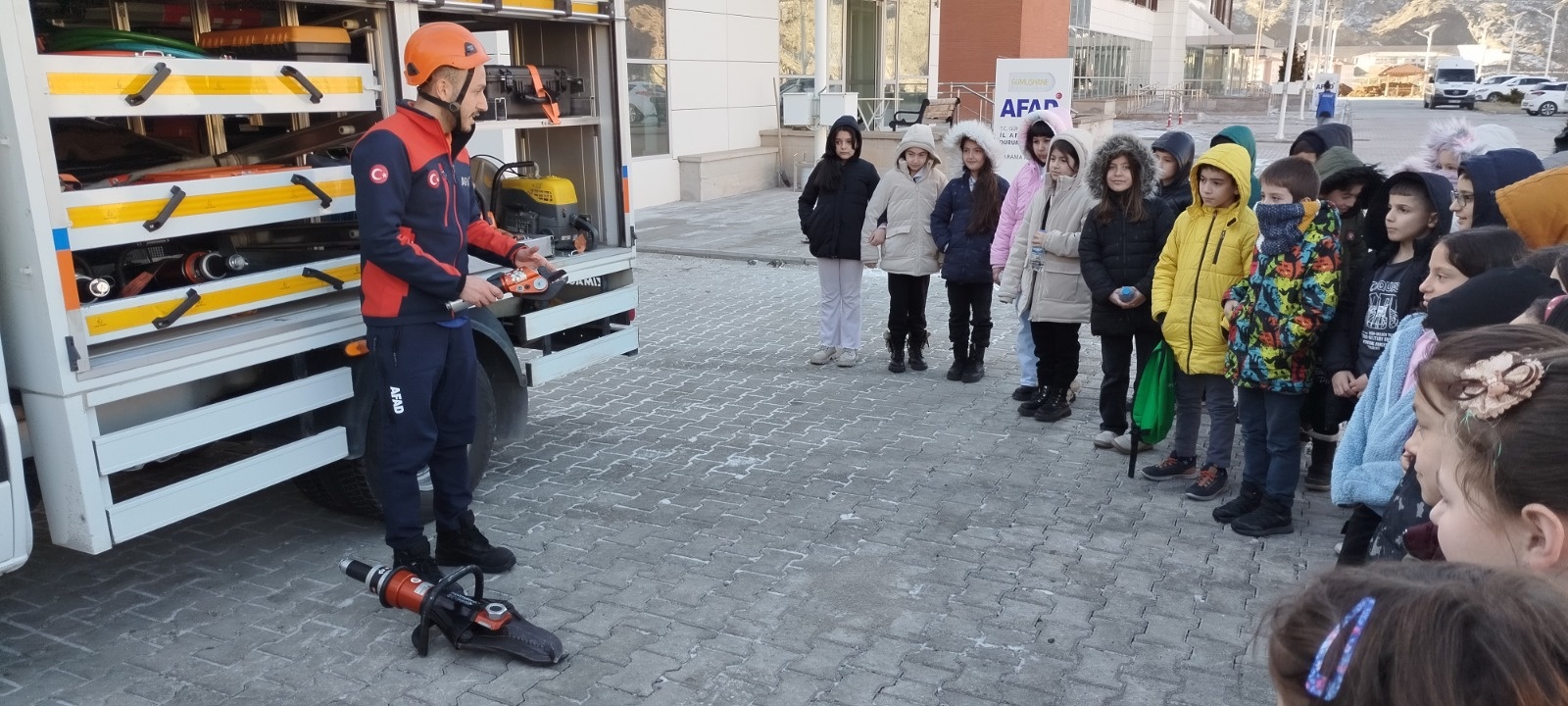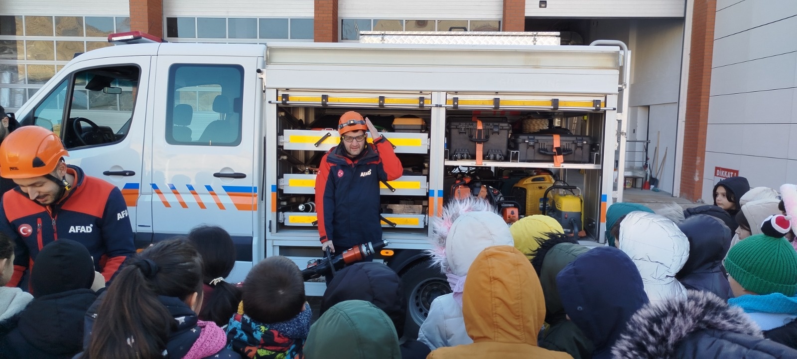 Daha sonra çocuklara AFAD İl Müdürlüğü Arama Kurtarma ekiplerinde görevli personeller tarafından afetlerde, kazalarda ve arama kurtarma çalışmalarında kullandıkları makine ve ekipmanları tanıtılarak bunların nasıl ve nerede kullandıkları anlatıldı.