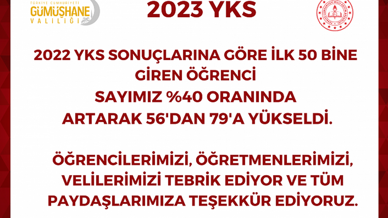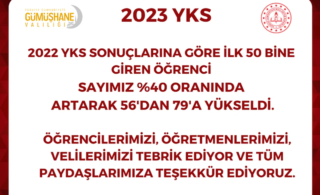 Açıklamada verilere göre Gümüşhane’de yaklaşık 100 öğrencinin dereceye girerek büyük bir sevinç yaşattığı, bunun yanında ilk 1000’e giren öğrencilerin başarısının onur madalyaları olduğu ifade edilerek 2022-YKS’de ilk 50 binde bulunan öğrenci sayısı 56 iken, 2023-YKS’de bu sayının yaklaşık yüzde 40’lık artışla 79’a yükseldiği belirtildi.