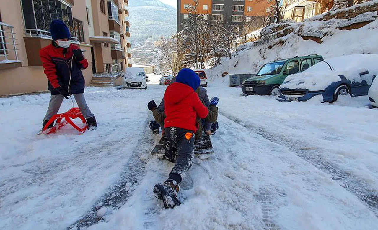 Gümüşhane’de kar yağışının ardından sokağa çıkma kısıtlaması nedeniyle günlerdir evlerde duran çocuklar kendilerini kapıya atarak kardan adam yaptı, kartopu oynadı, kızaklarla evlerinin önünde kaydı.