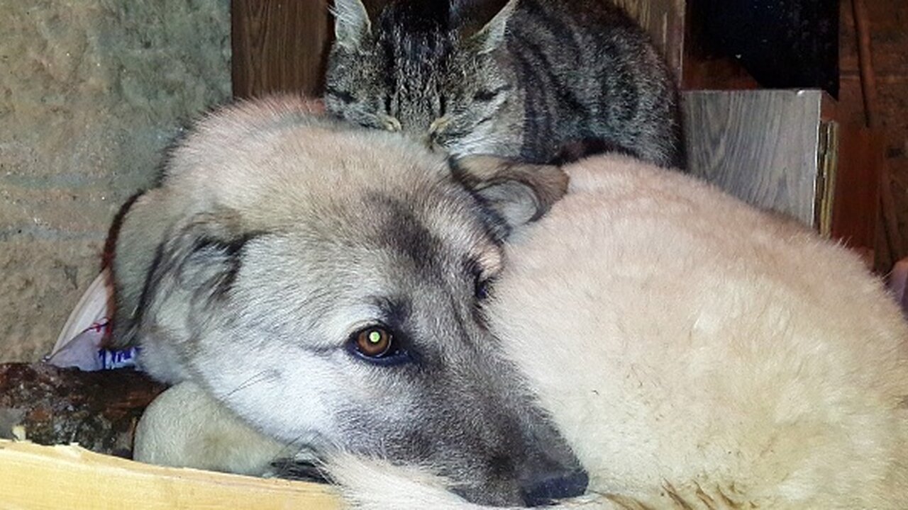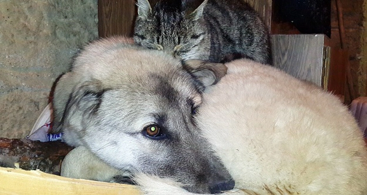 Gümüşhane’nin Torul ilçesine bağlı Zigana köyünde birbirine düşman olarak bilinen kedi ve köpekler birlikte yemek yiyor, sırt sırta uyuyorlar.