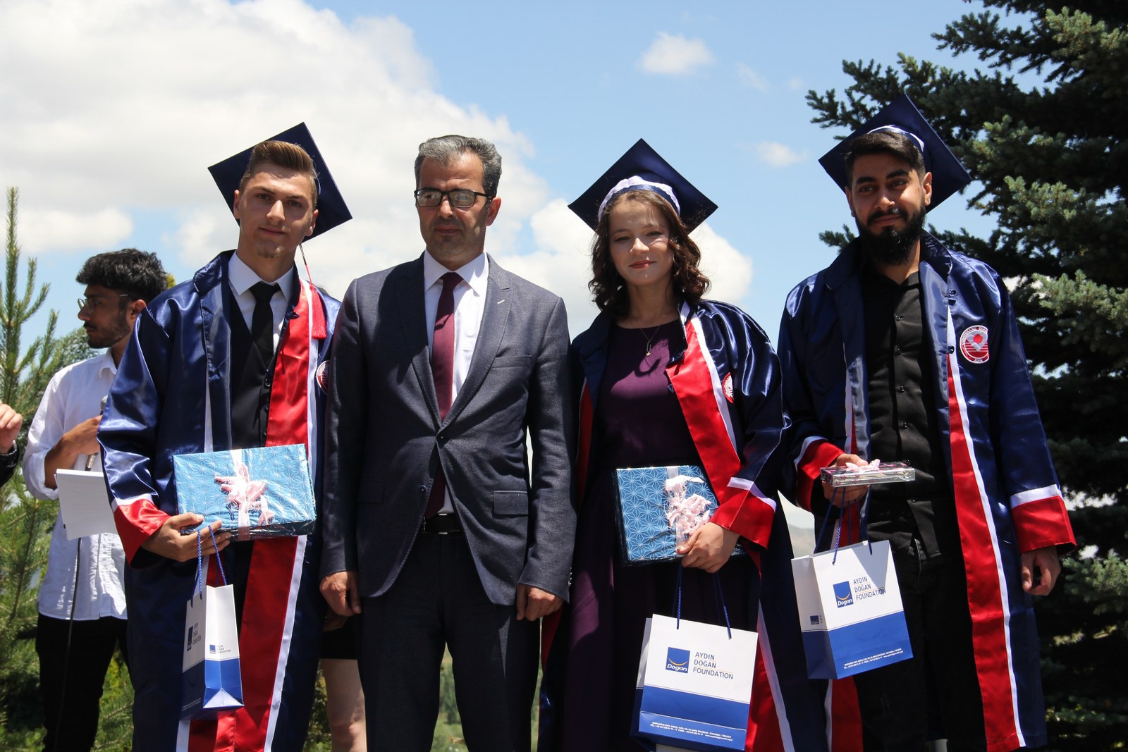 Meslek Yüksekokulu Müdürü Doç. Dr. Rıdvan Şahin ise konuşmasında, “Bugün hem mutluyuz, hem de gururluyuz. Çünkü 314 son sınıf öğrencimizi mezun etmenin heyecanını, pırıl pırıl gençlerimizi hayata uğurlamanın, ülkemize kazandırmanın gururunu ve sevincini hep birlikte yaşıyoruz. Hızla değişen ve dönüşen dünyada, bir yandan bilgiyi yöneten ve dönüştüren, diğer yandan geleceği oluşturan gençleri yetiştiren kurumlar olarak üniversiteler, her geçen gün önemlerini daha da artırmaktadır. Bu kapsamda gerçekleştirilen “Her İle Bir Üniversite” projesi büyük önem taşımaktadır. Bu proje kısa bir süre içinde meyvelerini vermiş olup bunun somut ve en iyi örneklerinden birisi de Gümüşhane Üniversitesidir. Mezunlarımıza bundan sonraki hayatlarında başarılar diliyorum. Vatanına, milletine, ana-babalarına hayırlı evlat olmalarını temenni ediyorum. Gençlerimizin bugünlere gelmesinde emeği olan anne-babaları ve hocaları başta olmak üzere hepsine şahsım ve okulum adına teşekkür ediyorum ifadelerinde bulundu. Ayrıca eğitim-öğretimin her aşamasında bizlere maddi ve manevi destek sağlayan Rektörümüz Prof. Dr. Sayın Halil İbrahim Zeybek’e, Kelkit Kaymakamı Sayın Aziz Onur Aydın’a, Kelkit Belediye Başkanı Sayın Aziz Nas’a, Aydın Doğan Vakfı Kurucusu ve Onursal Başkanı Sayın Aydın Doğan’a, Aydın Doğan Vakfı Yürütme Kurulu Başkanı Sayı Candan Fetvacı ve vakıf yönetimine, Kurum ve Kuruluşlarımızın değerli yöneticilerine, Siyasi ve Sivil toplum kuruluşlarının değerli temsilcilerine teşekkür ediyorum” diye konuştu.