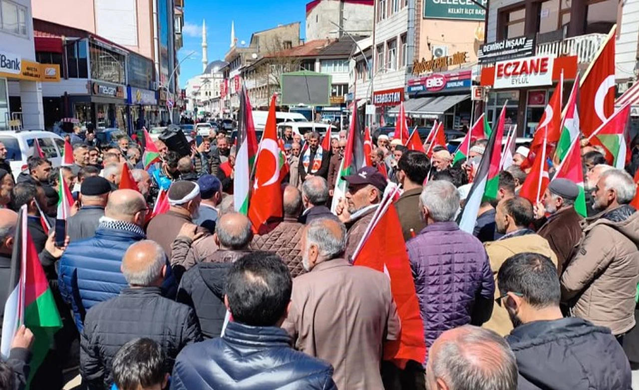 Kelkit meydanında ellerinde Türk ve Filistin bayraklarıyla toplanan kalabalık grup sloganlar atarak İsrail’i lanetledi, döviz ve pankartlarla tepkisini dile getirdi.