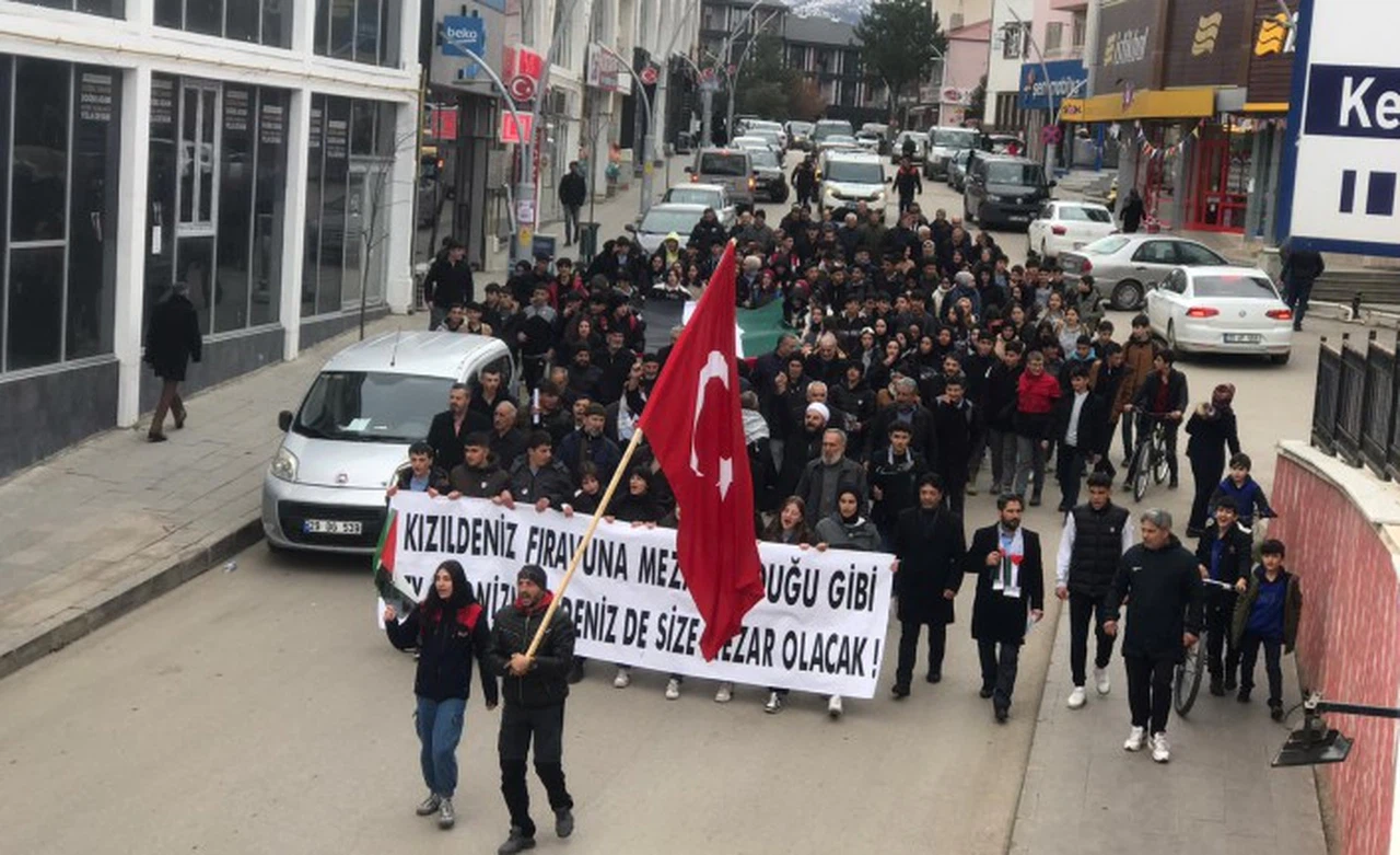 "Kızıldeniz Firavuna mezar olduğu gibi ey siyonizm Akdeniz de size mezar olacak" yazılı pankart taşıyan grup, İsrail’i kınayan sloganlar atarak yürüyüşü sonlandırdı.