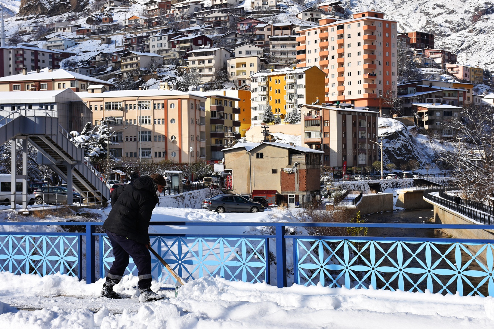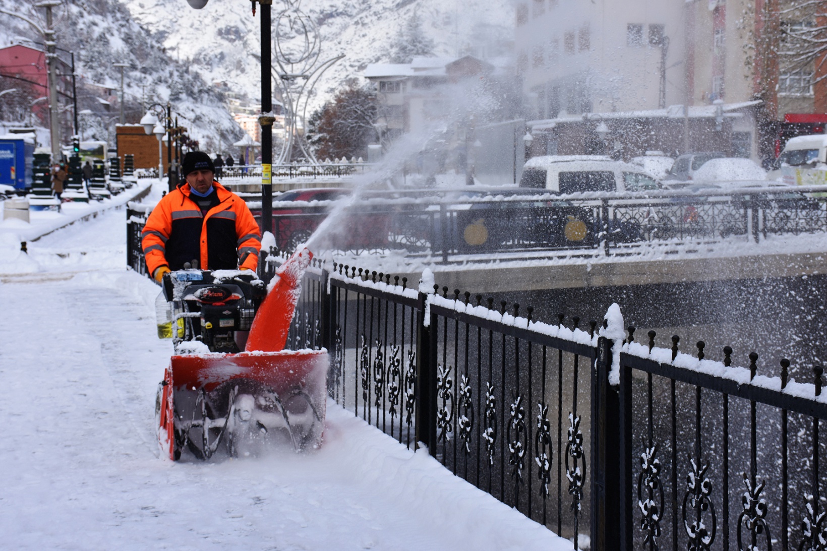 Gümüşhane Belediyesi ekipleri kent merkezinde etkili olan kar yağışının ardından şehrin birçok noktasında yol ve kaldırımlarda kar temizleme çalışması gerçekleştirdi.