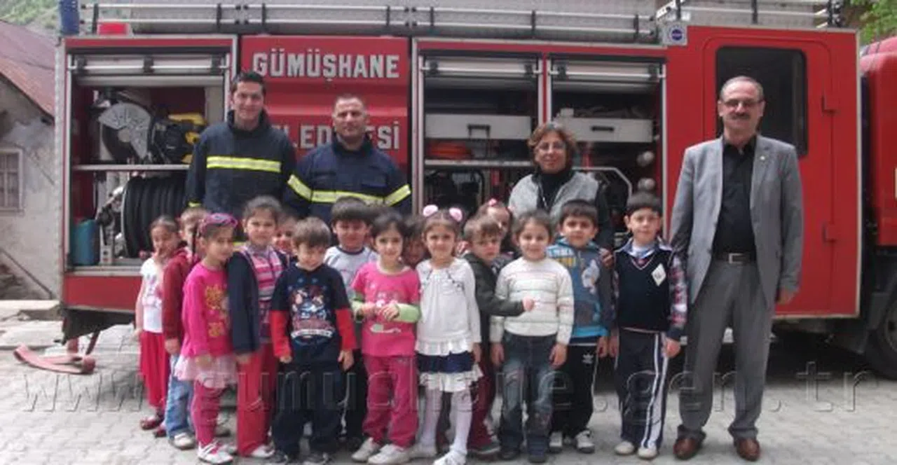 Gümüşhane Belediyesi İtfaiye ekipleri, Merkez Anaokulunun talebi üzerine okula giderek öğrencilere yangın ve kurum hakkında bilgi verdi.