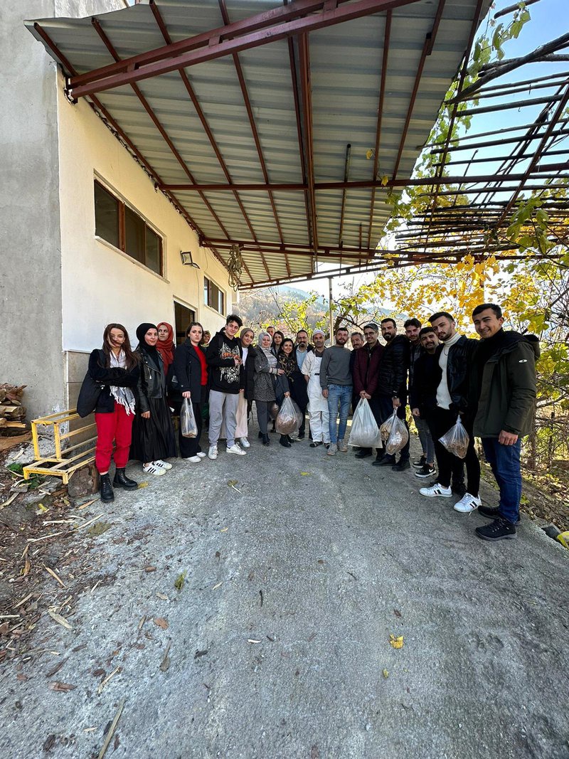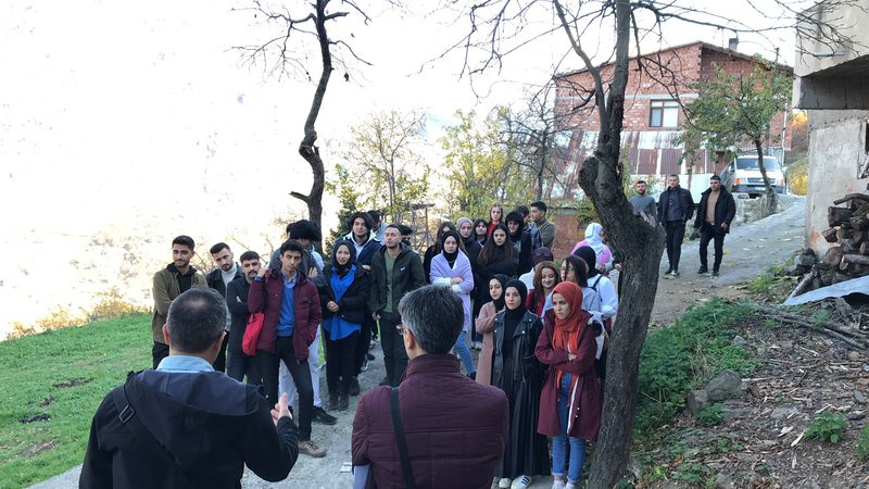 Kürtün ilçesine bağlı Araköy köyünde Gümüşhane’nin coğrafi işaretli ürünleri arasında yer alan Araköy Ekmeği hakkında Dr. Öğr. Üyesi Fazıl Kaya ve Dr. Öğr. Üyesi Eray Polat tarafından ön bilgilendirme yapıldı. Ardından Araköy Ekmekçiler mahallesinde bulunan fırın ustası Osman Karaman, Araköy ekmeğinin üretim aşamaları, tarihi, ekmeğin ve içinde kullanılan ekşi mayanın özellikleri ve diğer ekmeklerden farklılaşan yönleri hakkında detaylı bilgi verdi. Karaman, sonrasında öğrencilerimizden gelen sorulara karşılık Araköy ekmeği ile ilgili şu açıklamalarda bulundu: “Araköy’de ekmek üretimi üç fırın ile başlamış olup, günümüzde hali hazırda 22 fırın ekmek üretimi yapmaktadır. Eskiden, hamur yoğurma makineleri olmaması nedeniyle, hamur elle ve tahta teknelerde yoğrulurdu. O yıllarda bölgenin tarıma elverişli olması nedeniyle, ekmek üretiminde bölgede yetiştirilen buğday kullanılırdı. Ancak günümüzde bu imkânın bulunmaması nedeniyle buğdaylar artık bölge dışından temin edilmektedir. Ekmeğin hamurunda beş çeşit un kullanılmaktadır. Bu unlar aynı anda kazana dökülüp karıştırılmakta ve yaklaşık olarak 45 dakika yoğurulmaktadır. Sonra hamur yaklaşık iki-iki buçuk saat mayalanmaya bırakılmaktadır. Hamur yoğrulmadan önce yakılan fırın yeterli ısıya ulaşınca, ekmek yapımına başlanır. Ekmekte kullanılan ekşi maya uzun yıllardır kullanılan bir mayadır. Dolayısıyla ekmekte hazır maya kullanılmamaktadır. Bu ekşi mayanın kaç yıldır kullanıldığı konusunda net bir bilgi yok; ancak 100 yıldan daha uzun bir süredir kullanıldığını rahatlıkla söyleyebilirim. Ekmeğimizin en önemli özelliği, içinde kullanılan ekşi mayadır. Ayrıca su da ekmeğin karakterine etki etmekte ve kalitesini artırmaktadır. Ekmek pişerken fırın ilk aşamada 400°C’ye kadar ısınmaktadır. Ekmek fırına verilmeye başladığı zaman fırının ısısı yaklaşık olarak 270°C civarında olmaktadır. 200°C’de fırının kapağı kapatılır. Yaklaşık 150°C’de pişen ekmek fırından çıkarılır. Ekmeğin pişmesi ortalama dört saat sürmektedir. Ekmekler ortalama üç-dört kg ağırlığındadır. Ekmekçilik; her bir aşaması ciddi emek isteyen, meşakkatli bir iştir. Mesleğimizin en zor tarafı, fırının yakılması ve hamurun yoğurulması işlerinin senkronize bir şekilde yerine getirilmesidir. Hamur kazanındaki ekşi maya, ertesi gün ekmek yapmak için bekletilmektedir. Kış aylarında 3-4 somun kararında, yazın ise 2 somun kararında bırakılmaktadır. Peksimet yapmak için fırın ısısı 150°C- 170°C aralığında ayarlanır ve küçük parçalara bölünmüş ekmekler 12-14 saat fırında tutularak kurutulur. Ekmeğin peksimet yapılmasının amacı, tazeliğini korumak ve dayanıklılığını artırmaktır. Araköy ekmeği, diğer ekmeklere göre daha sağlıklıdır. Özellikle şeker hastalarının ve bağırsak problemleri yaşayan kişilerin tüketmesi önerilmektedir. Ekmeğimiz yaklaşık olarak 10 gün tazeliğini korumaktadır. Peksimetlerimizin ise yaklaşık olarak bir senelik raf ömrü bulunmaktadır. Ekmeğimiz Gümüşhane’nin yanı sıra İstanbul, Ankara, İzmir gibi şehirlere de gönderilmektedir. Ayrıca Avrupa ülkelerine de gönderebiliyoruz. Tazeliğini uzun süre koruyabilmesi nedeniyle şehir dışına herhangi bir problem olmadan ulaşımını sağlayabiliyoruz. Bunun yanı sıra ekmeğimizin internetten satışını da yapmaktayız. Fırınlarımızda günlük ortalama yaklaşık olarak 5.000 ekmek üretilmektedir. Üretilen ekmek sayısı, yaz aylarında özellikle festival dönemlerinde artarken, kış aylarında azalabilmektedir. Bölgedeki ekmekçiliğin daha da gelişmesi ve tanınması için kooperatifleşmeye gidilmesi gereklidir. Buna ek olarak, özellikle bu mesleğin yeni nesillere öğretilebilmesi ve yeni ustaların yetiştirilebilmesi için kooperatifleşmenin önemli olduğunu düşünüyoruz.”