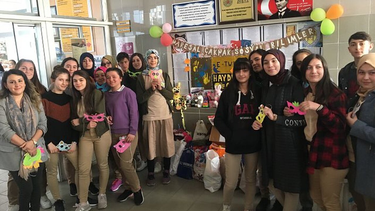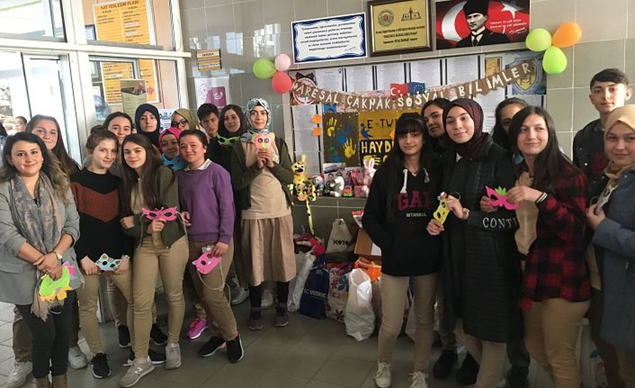 Öğrenciler E-Twinning “Haydi Sen de Oyna” sosyal sorumluluk projesi kapsamında ihtiyaç sahibi anaokulları ve ilkokuldaki çocuklar için oyuncak kumbarası kurdu.