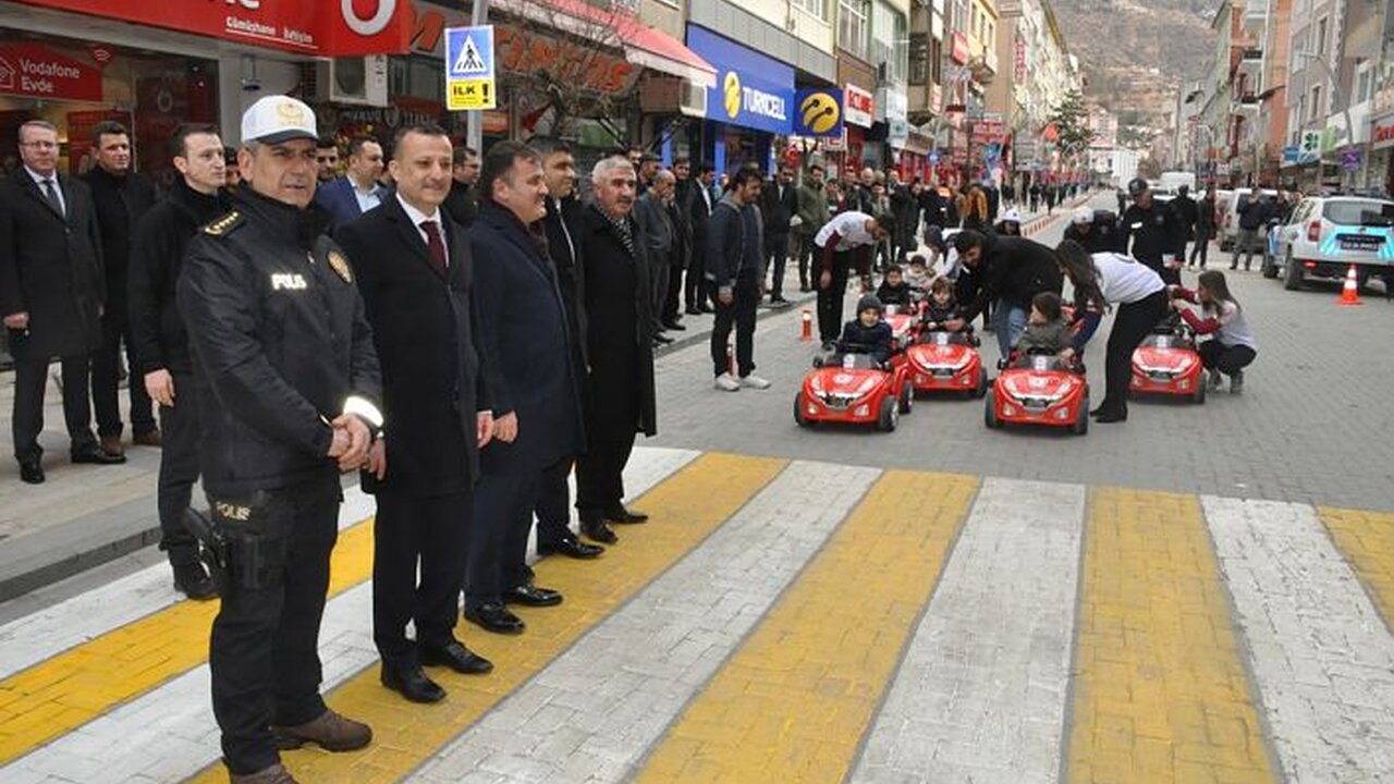 Konuşmaların ardından Vali Taşbilek, Belediye Başkanı Ercan Çimen ve Cumhuriyet Başsavcısı Faruk Kaynak, akülü araçlarla trafik eğitimi alan öğrencilere hediyeler dağıtarak yaya geçidini kullandı.