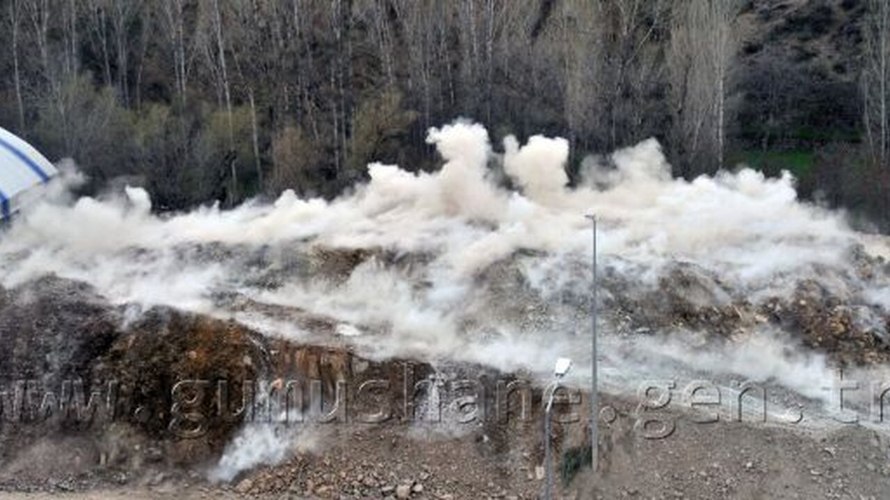 Gümüşhane-Bayburt karayolu üzerinde yer alan bölgede patlatma öncesinde üst düzeyde güvenlik önlemleri alınırken, patlatma yapılacak sahada ki köpek yavruları ateşleme için iletimi sağlayan kabloları ısırınca görevliler tarafından sahadan uzaklaştırıldı. Bu kez de kurum müdürlerinin ayağına dolanan minik köpekler daha sonra yemek verilerek sahadan alındı.