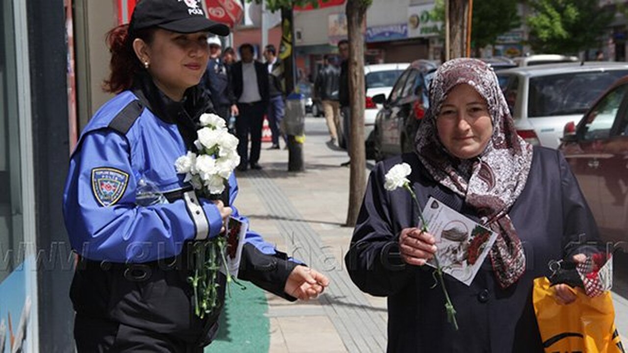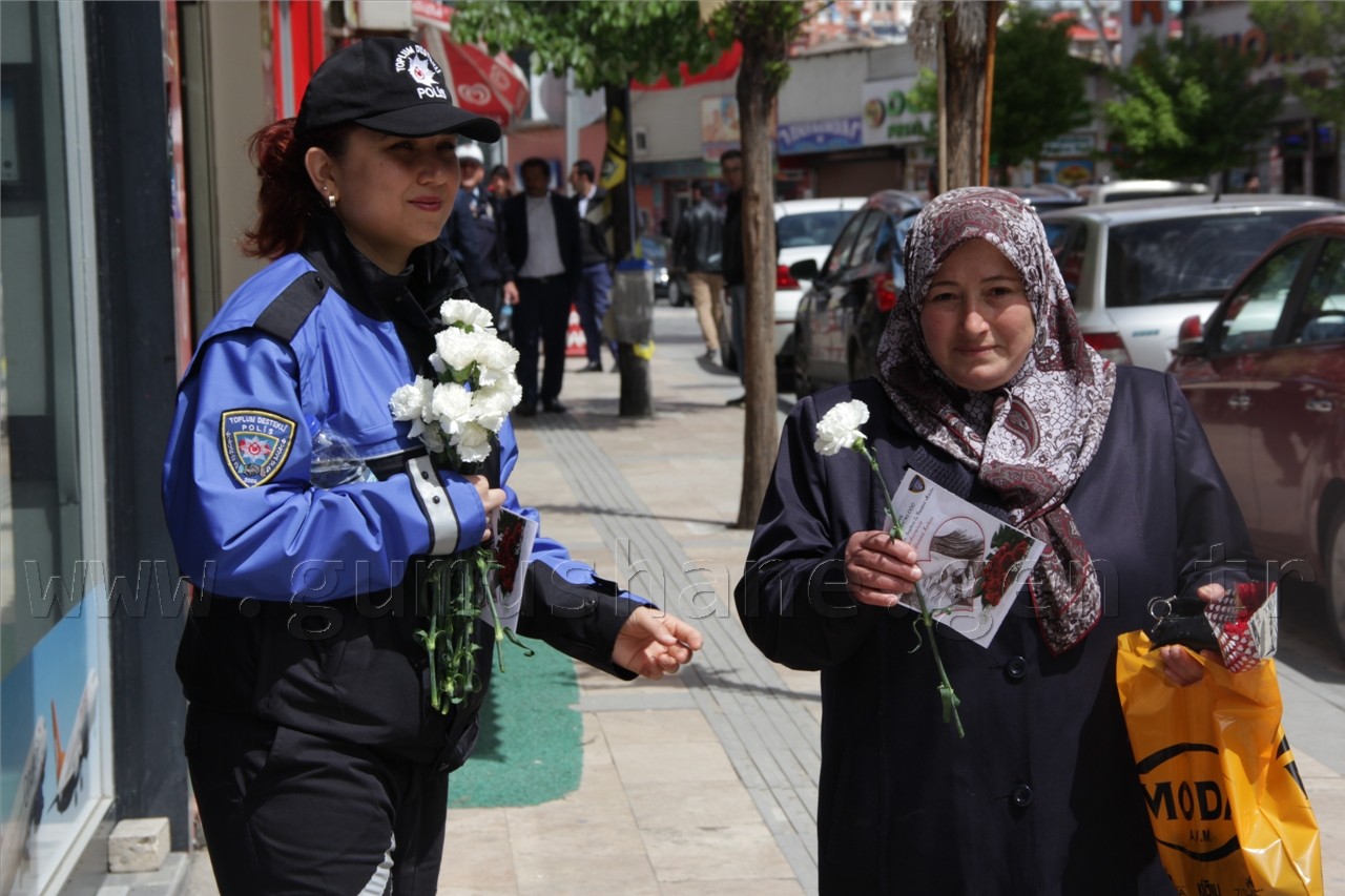 Toplum Destekli Polislik Şube Müdürlüğünde görevli personel anneler günü dolayısıyla Atatürk Caddesi ve Atatürk Parkında annelere karanfil ve broşür dağıttı.