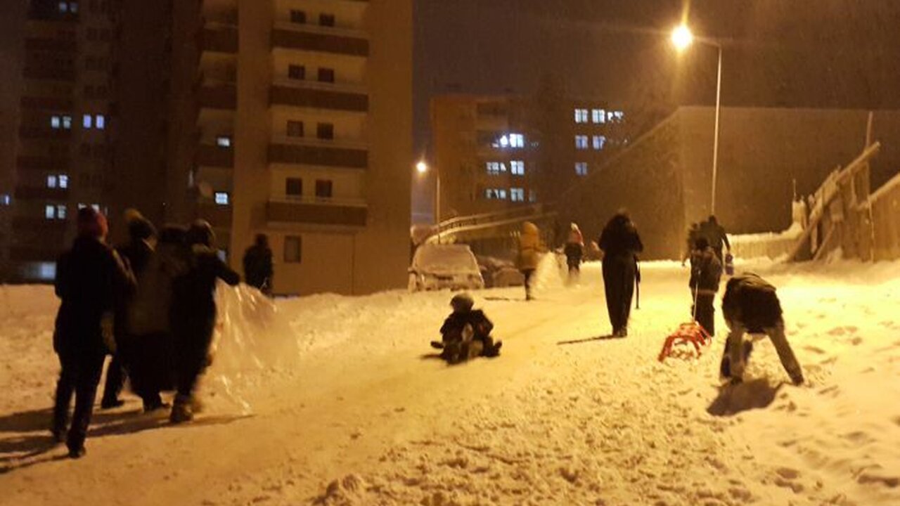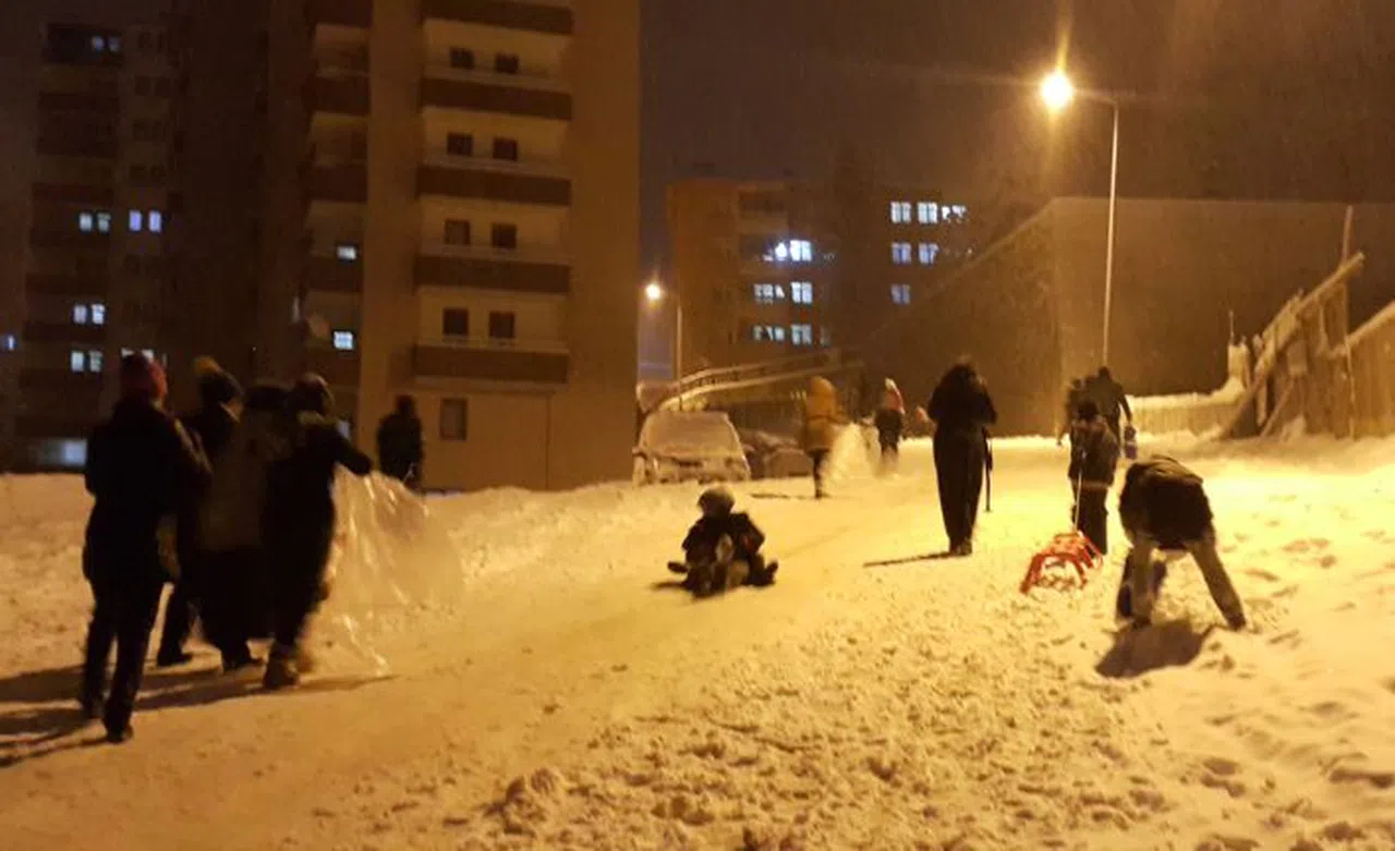 Akşama kadar devam eden ve il merkezinde 20 santimetreyi aşan kar kalınlığının ardından il genelinde okulların da bir gün tatil olmasını fırsat bilen çocuklar, gecenin karanlığında şehrin yüksek apartmanlarının arasında dik rampalarda kayarak doyasıya eğlendi.