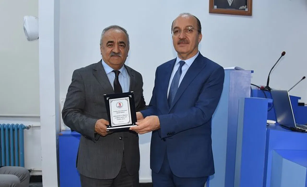 Söyleşi Fen Edebiyat Fakültesi Dekanı Prof. Dr. Bekir Batı’nın Rektörümüz Prof. Dr. Halil İbrahim Zeybek’e plaket takdimiyle sona erdi.