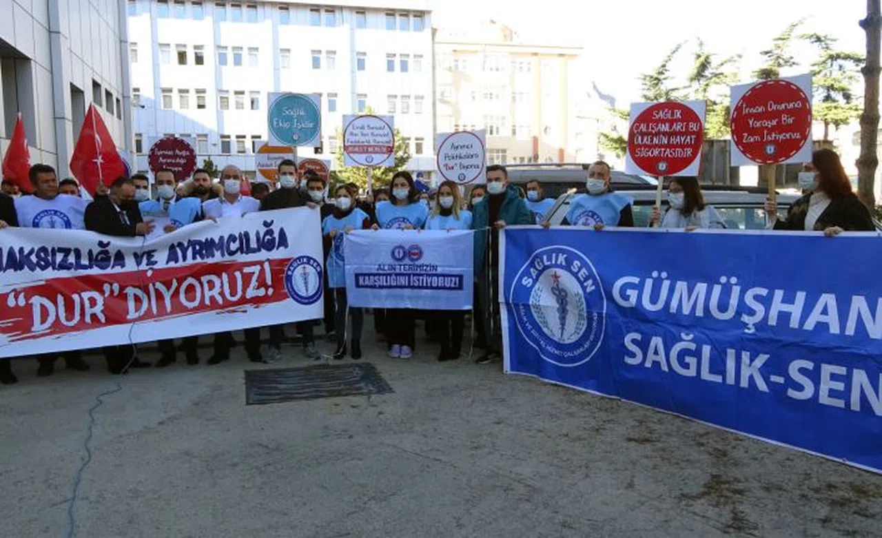 Sağlık hizmetlerinin emek gerektiren yoğun bir hizmet olduğunu dile getiren Aslan, “Pandeminin olağanüstü şartları içerisinde tüm sağlık ve sosyal hizmet çalışanları cansiperane çalıştılar. Çok sayıda arkadaşımızı Kovit nedeni ile kaybettik. Ruhları şad olsun. Sağlık bakanlığı tarafından yapılan ve Hekiminden Hemşiresine, Teknikerinden Memuruna sağlık çalışanlarının tümünü kapsayan bir düzenleme gerekmektedir. Hiç bir sağlık ve sosyal hizmet çalışanı bu düzenlemenin dışında tutulmamalıdır. Bu büyük bir haksızlıktır. Bizim tepkimiz bunadır ve bu tepki haklı bir tepkidir. Bu tepkiyi sadece bizler değil, yüzbinlerce sağlık çalışanı gösterdi. Sosyal medya adeta inledi. Sadece sağlık bakanlığı çalışanları değil aynı zamanda Üniversite hastanesinde çalışan öğretim üyeleri, araştırma görevlileri, sosyal hizmet çalışanları ve Aile hekimliği çalışanları da bu düzenlemenin dışında tutulmuştur. Açıkçası bu durum sağlık ve sosyal hizmet çalışanları İçerisinde çok büyük bir infiale yol açmıştır. Yetkili sendika olarak, biz zam yapılmasına asla karşı değiliz, olamayız da. Zamma karşı olmamız, sendikal kimliğimizi ve mücadelemizi inkar anlamına gelir. Biz zam üzerinden ayrımcılık yapılmasına karşıyız. Yüzbinlerce sağlık çalışanının üvey evlat görülmesine, yok sayılmasına, emeklerinin hor görülmesine karşıyız. Can kurtarmak için can vermekten çekinmeyen sağlık çalışanlarının fedakarlıklarının, mücadelelerinin, gayretlerinin görmezden gelinmesine karşıyız. Bizim karşı olduğumuz bu. Herkesi emek ve ekmek mücadelesine destek vermeye davet ediyoruz” diye konuştu.