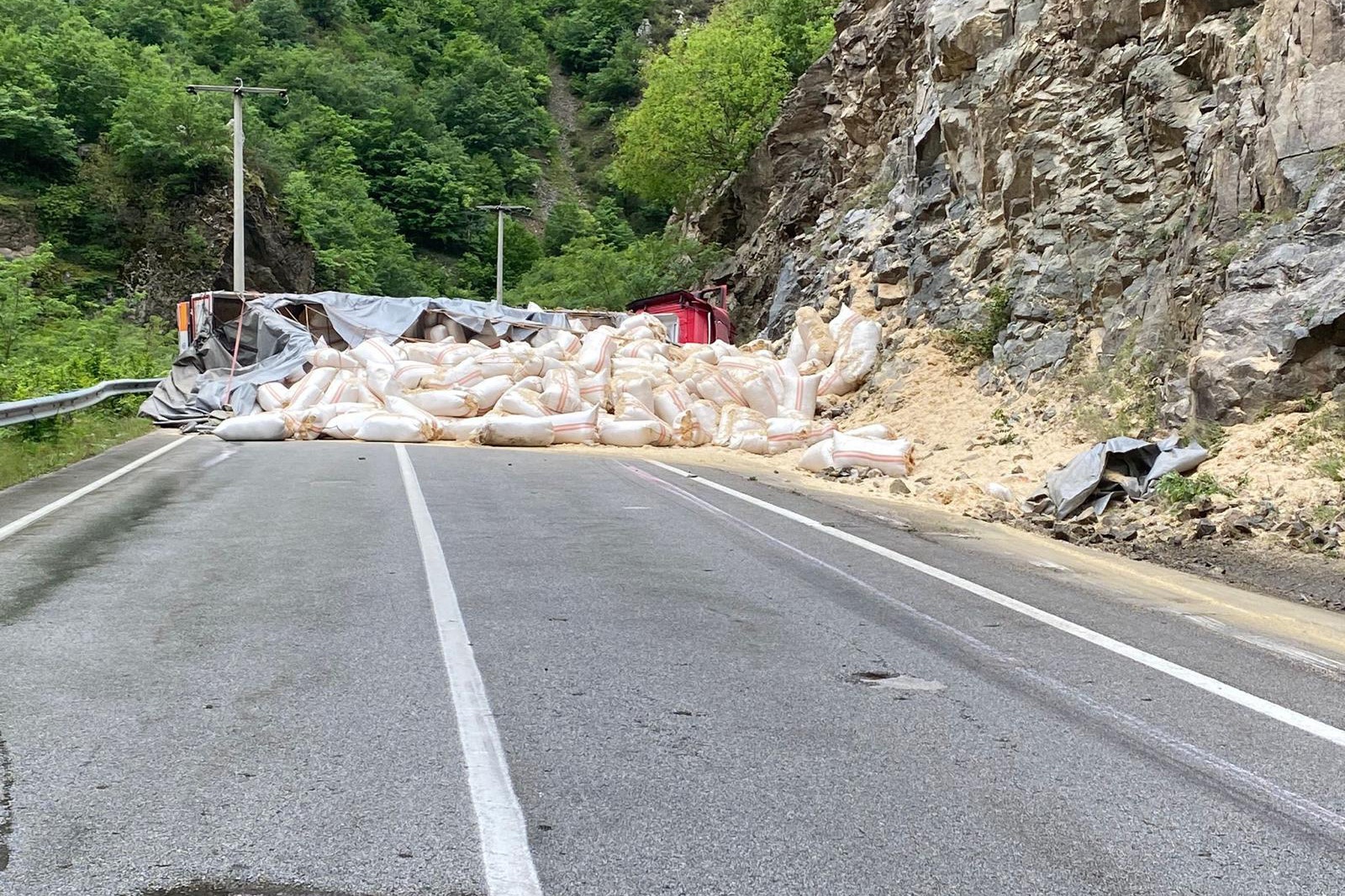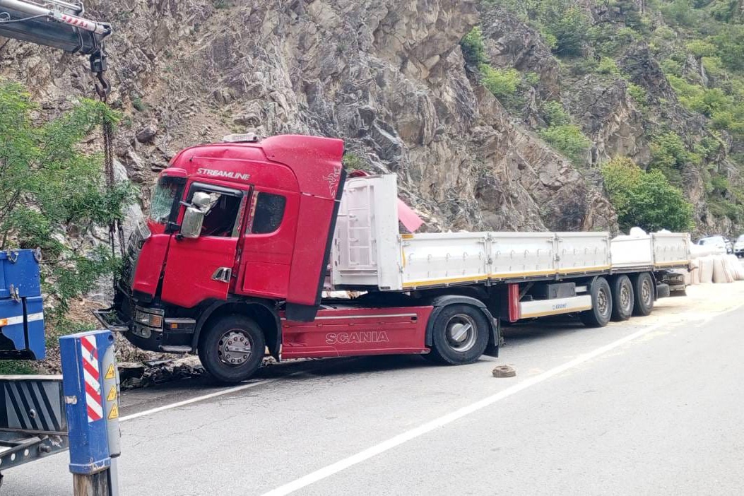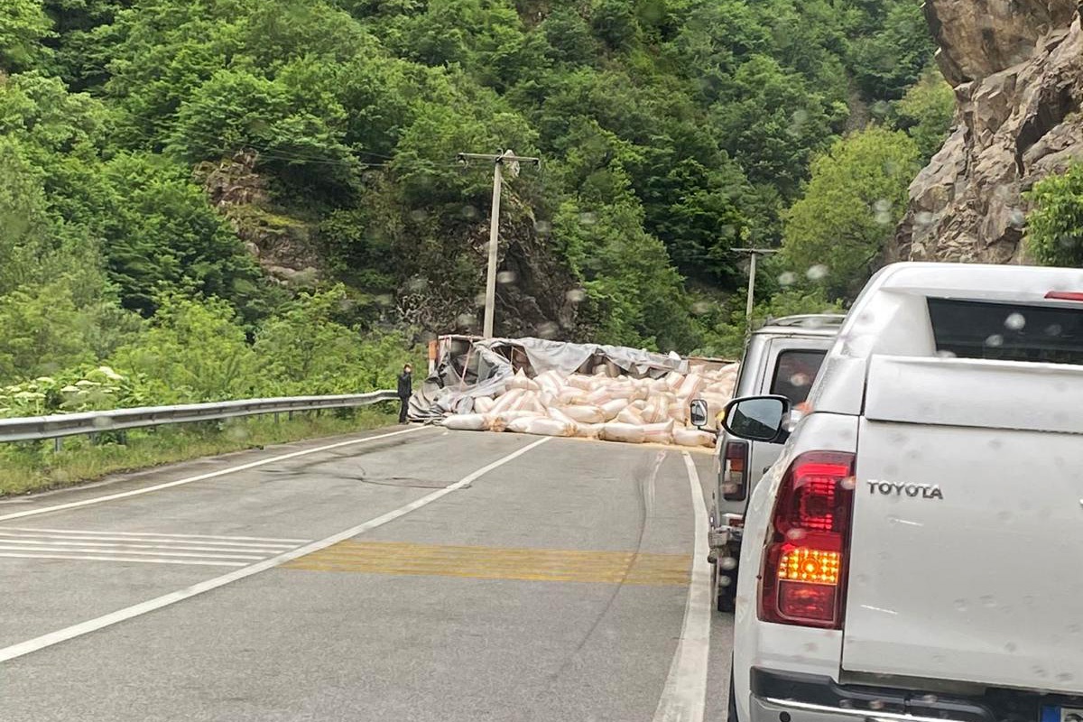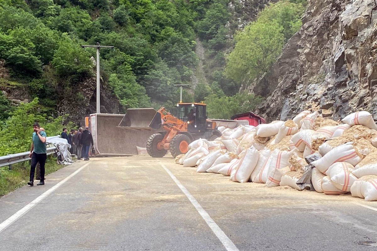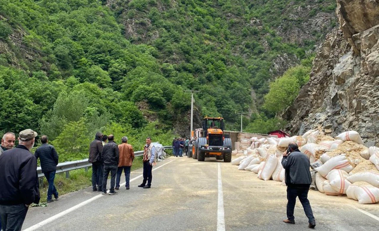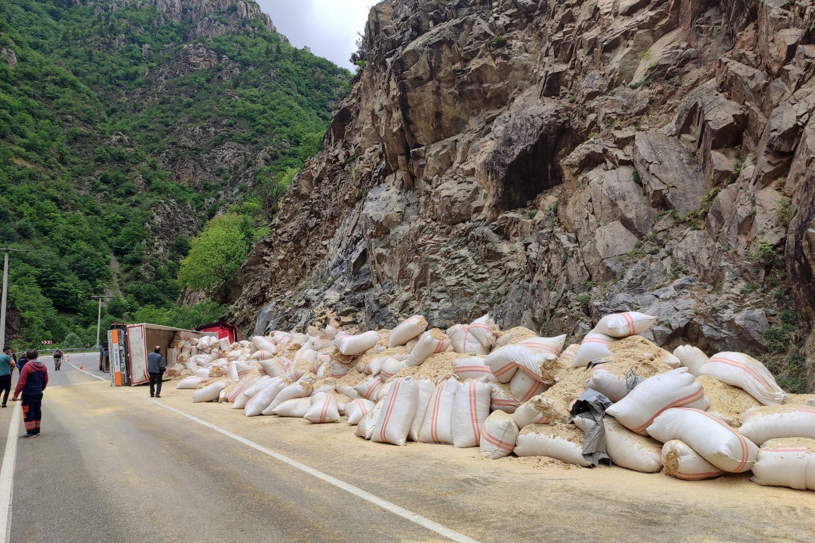 Edinilen bilgiye göre Batman’dan aldığı samanı 47 LB 434 plakalı tırıyla Giresun’a götürdüğü öğrenilen Masum Durmaz (32), Kürtün ilçesine bağlı Elceğiz köyü mevkiinde henüz bilinmeyen bir nedenle aracının kontrolünü kaybetti. Sürücüsünün direksiyon hakimiyetini kaybetmesi sonucu yan yatan tır tek şeritli karayolunu ulaşıma kapattı.