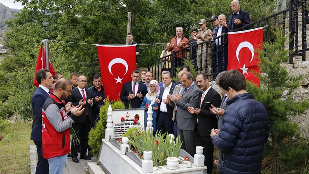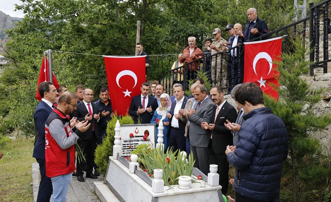 Şehit öğretmenin annesi Gülay, babası Hamit, kardeşi Yahya ve abisi Ahmet Yılmaz'ın da hazır bulunduğu törende şehit öğretmenin kabrine karanfil bırakıp dua eden Gümüşhane Valisi Kamuran Taşbilek, tek gayesi milletin evlatlarının aydınlanması olan ve bu uğurda mücadele ederken şehit edilen şehit öğretmen Necmettin Yılmaz başta olmak üzere vatanı, milleti, bayrağı, mukaddesatı uğruna mücadele eden aziz şehitler ve kahraman gazileri minnet şükran ve rahmetle andıklarını söyledi.